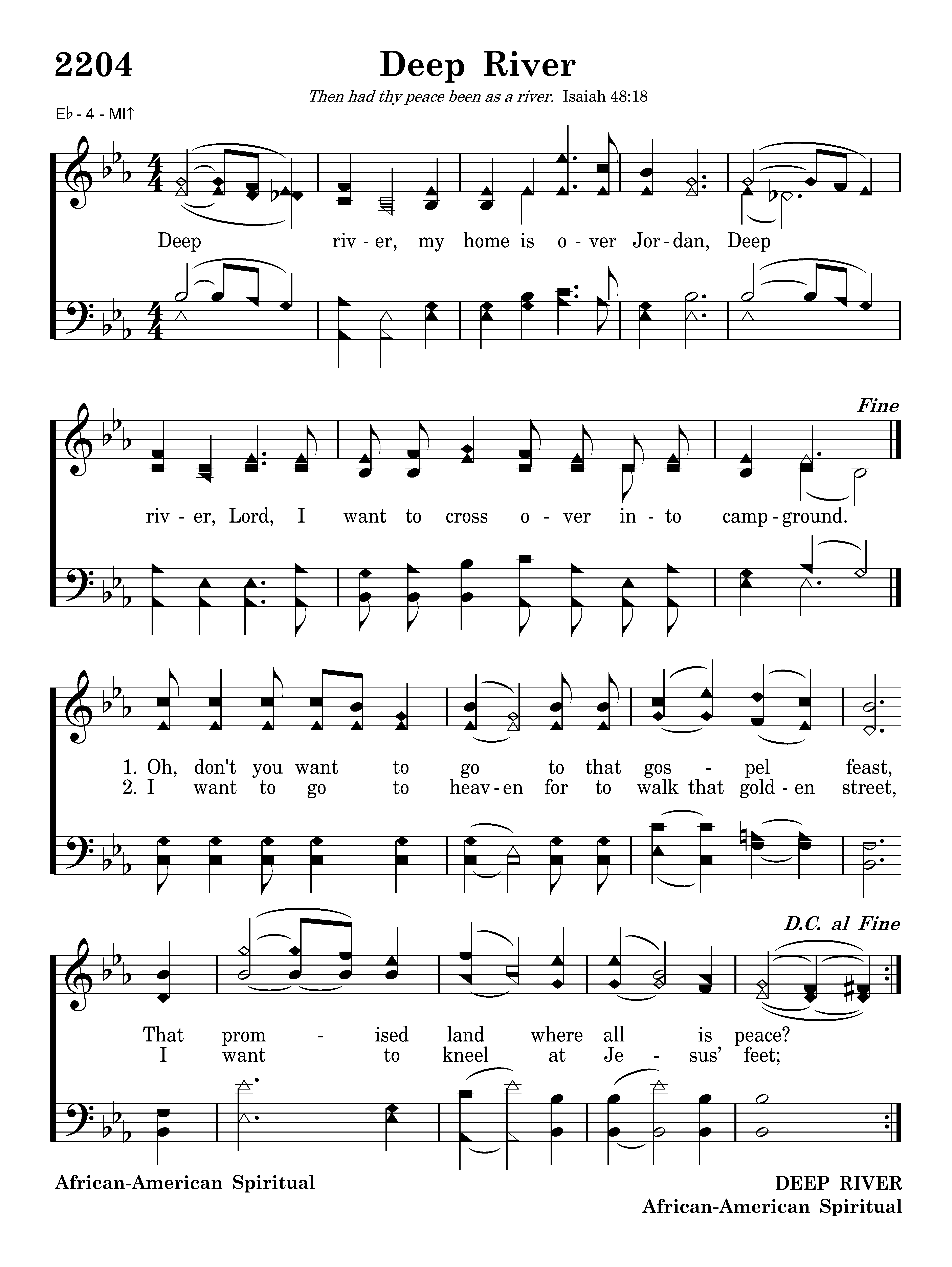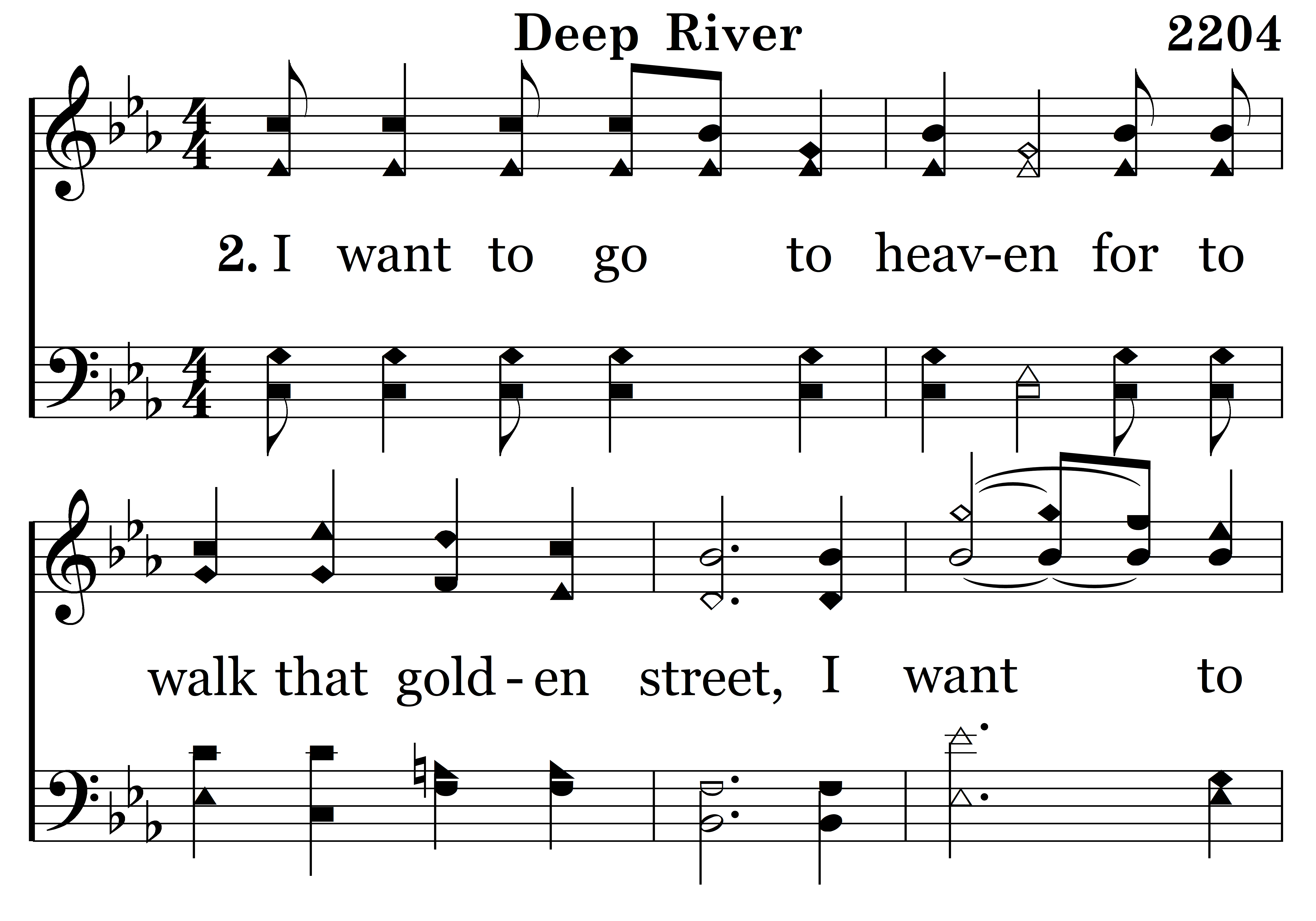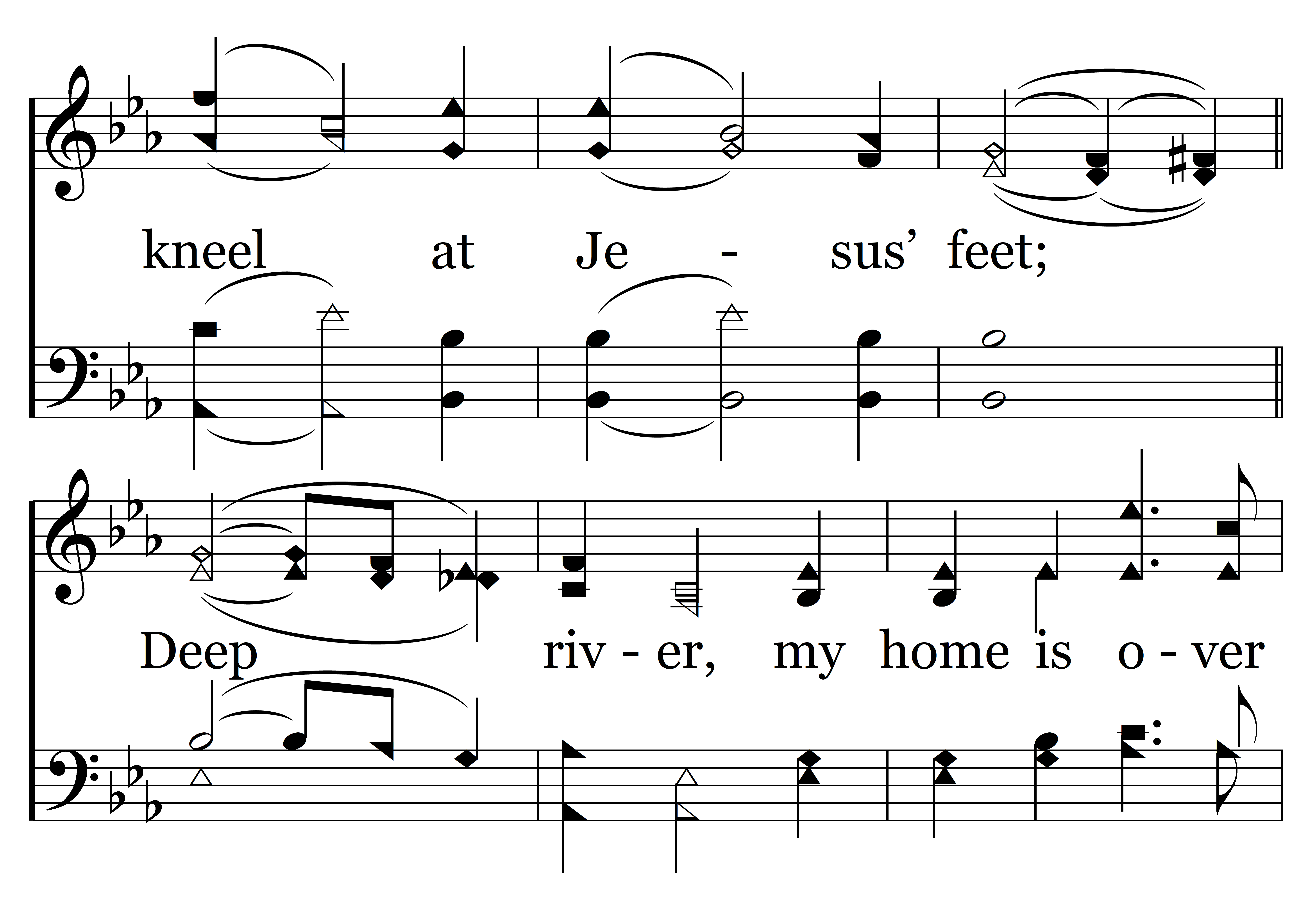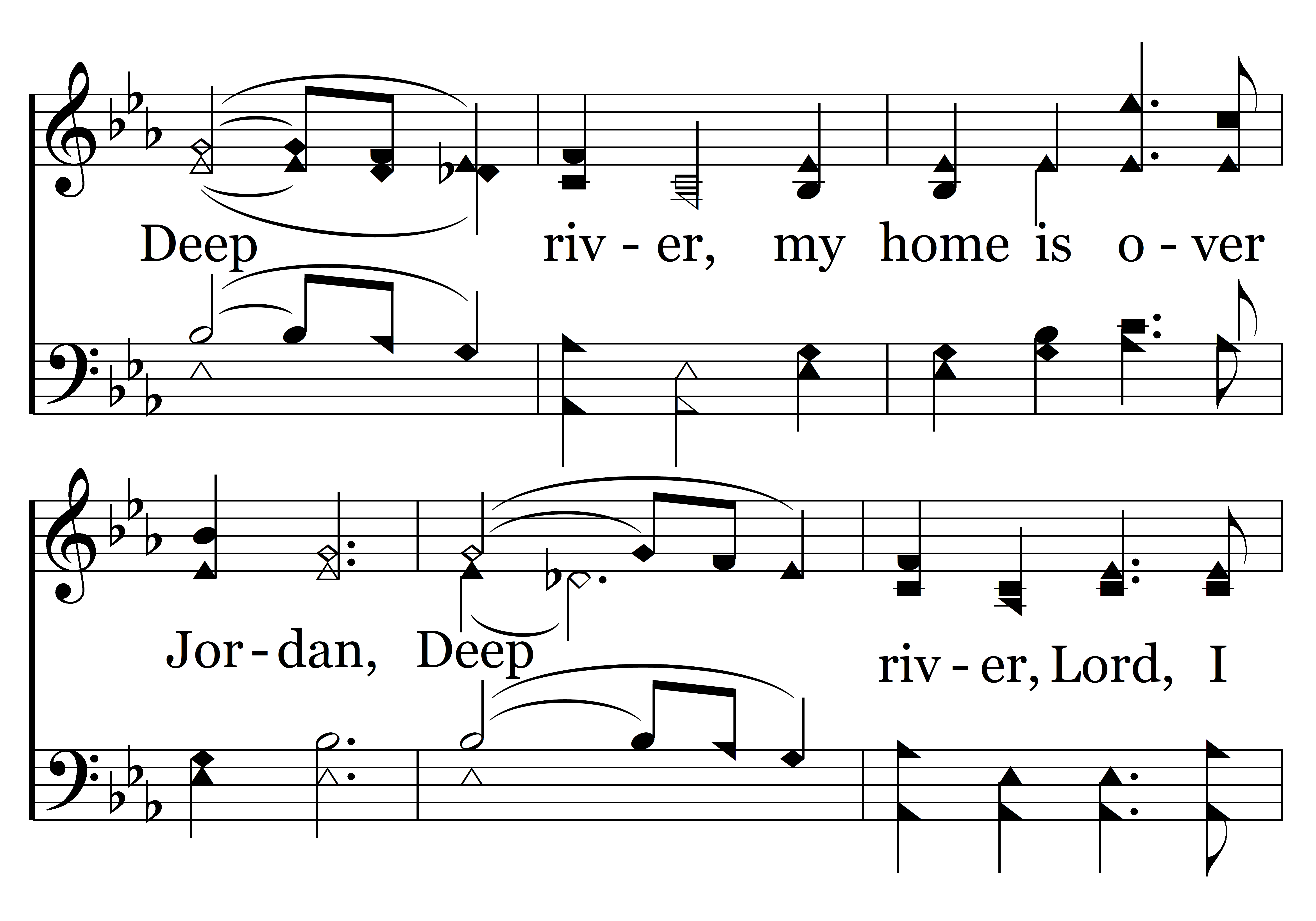 Deep river, my home is over Jordan, Deep river, Lord, I want to cross over into campground. I want to go to heaven for to walk that golden street, I want to kneel at Jesus’ feet; Deep river, my home is over Jordan, Deep river, Lord, I want to cross over into campground.