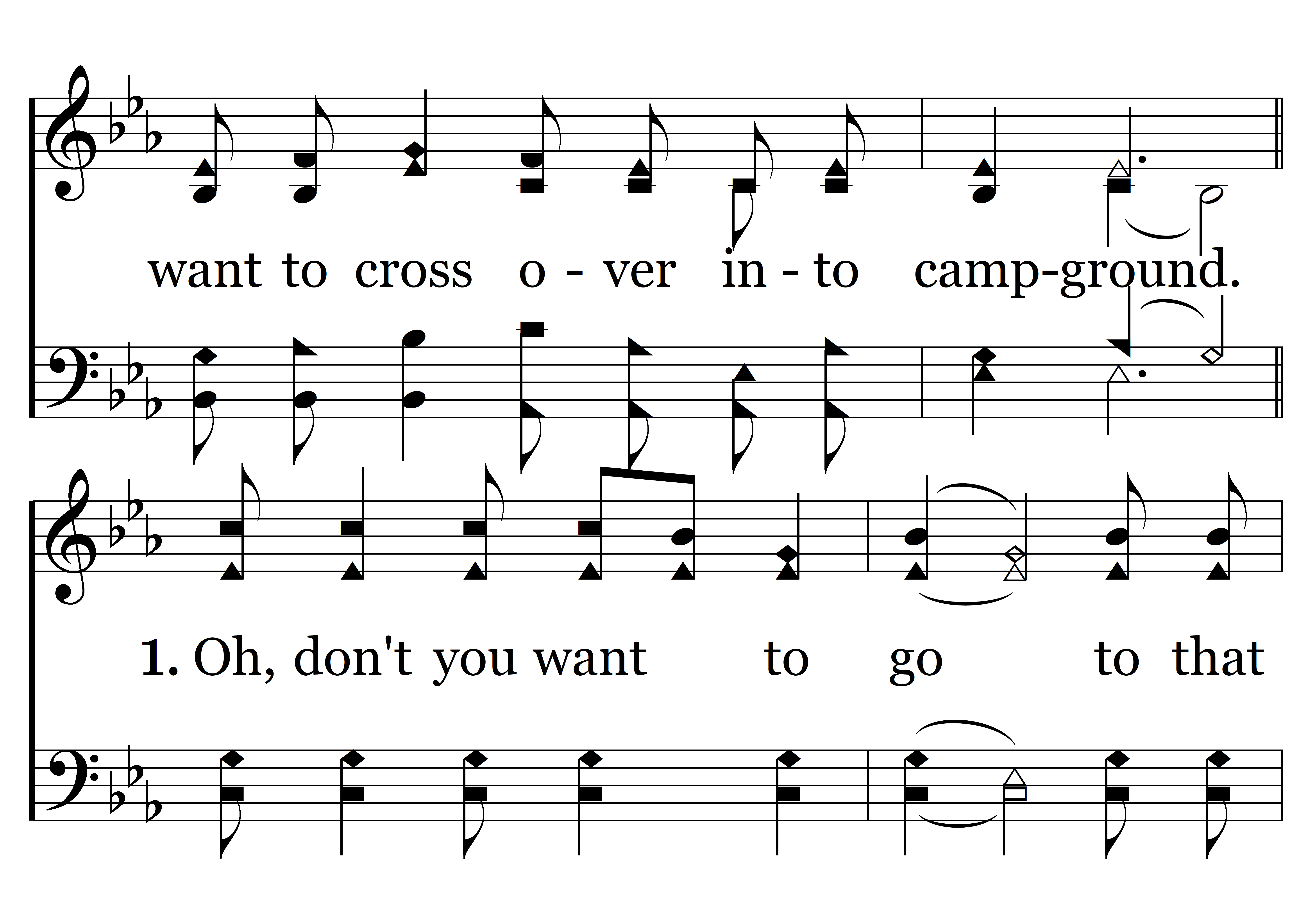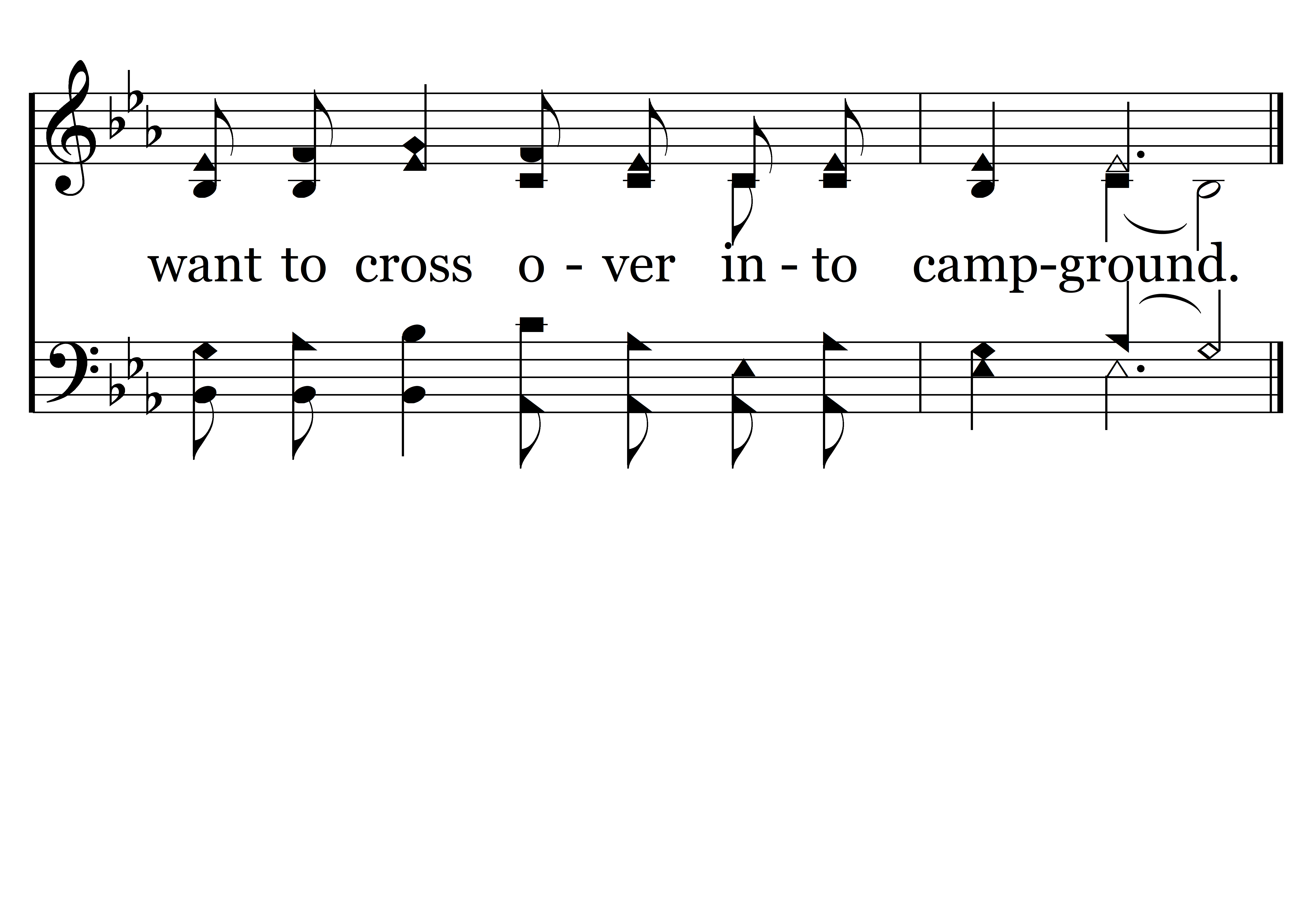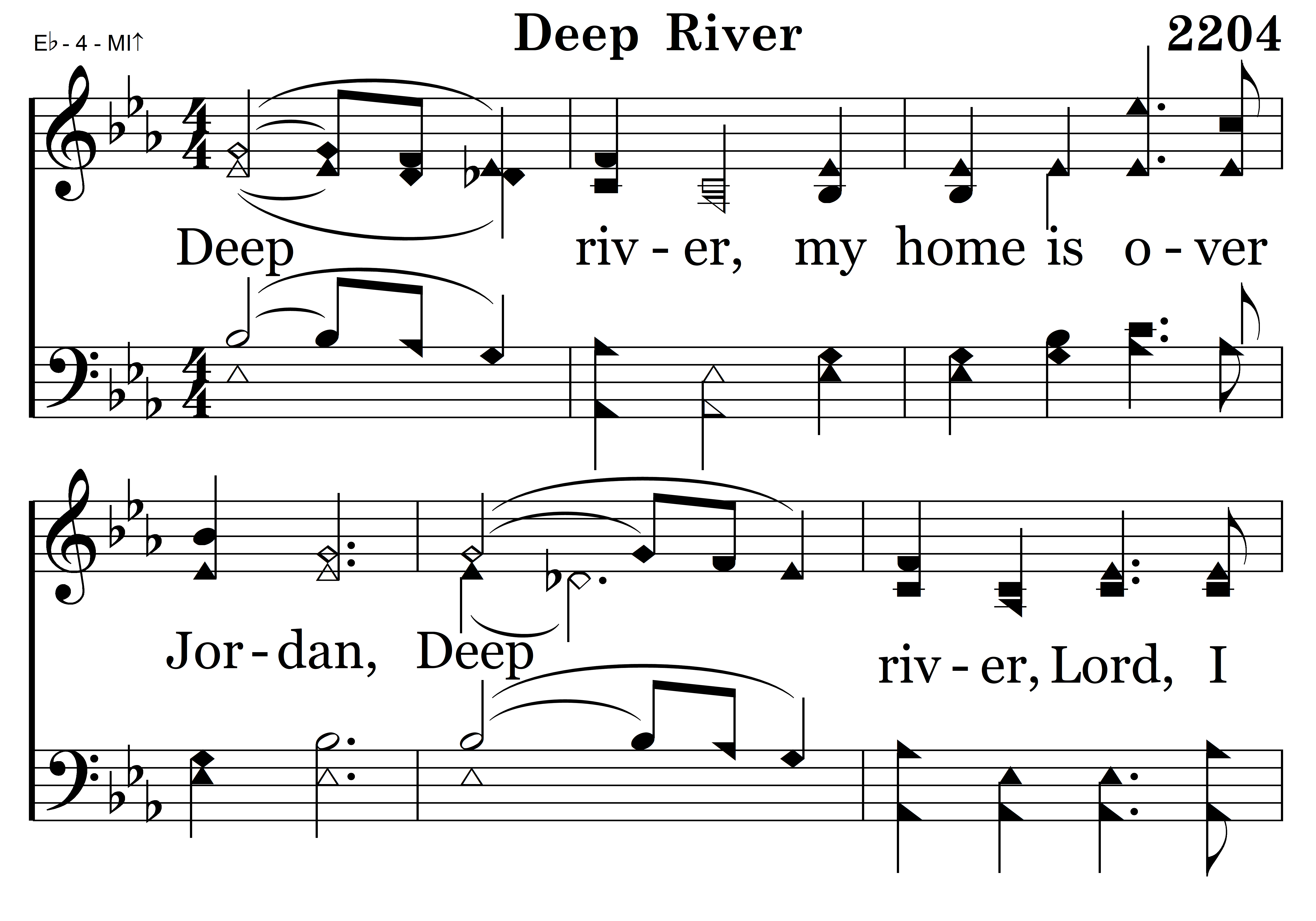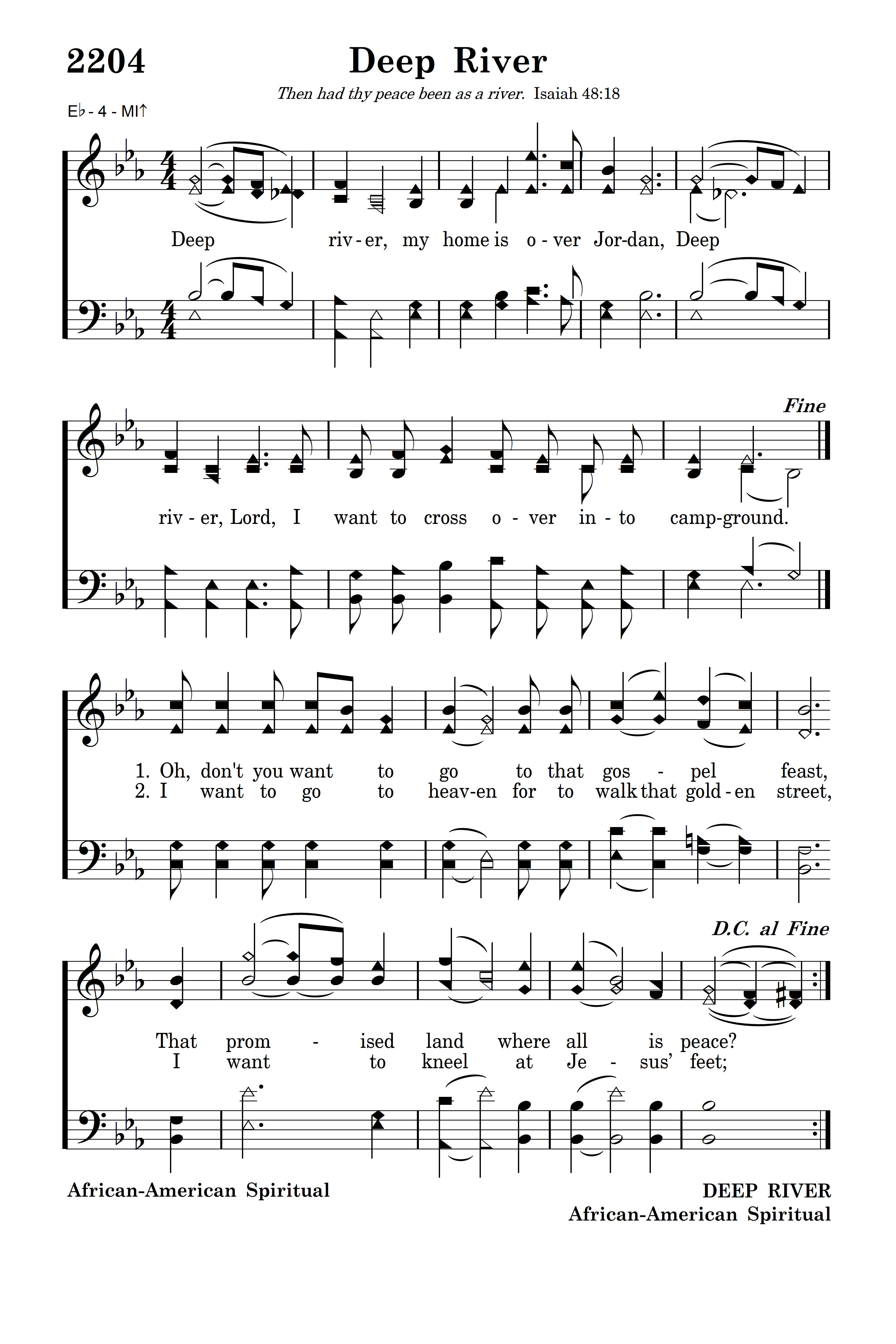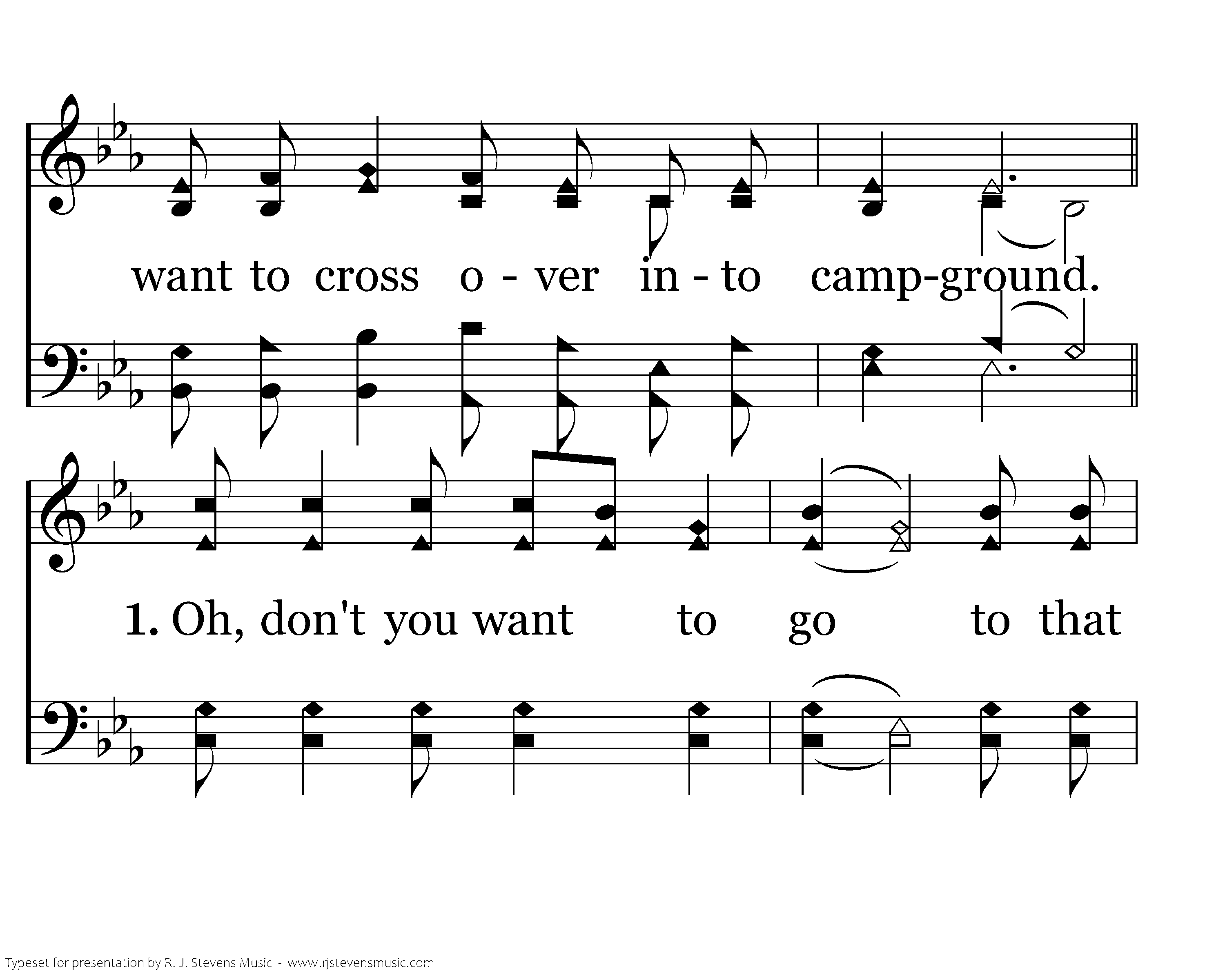 Deep river, my home is over Jordan, Deep river, Lord, I want to cross over into campground. Oh, don't you want to go to that gospel feast, That promised land where all is peace? Deep river, my home is over Jordan, Deep river, Lord, I want to cross over into campground.