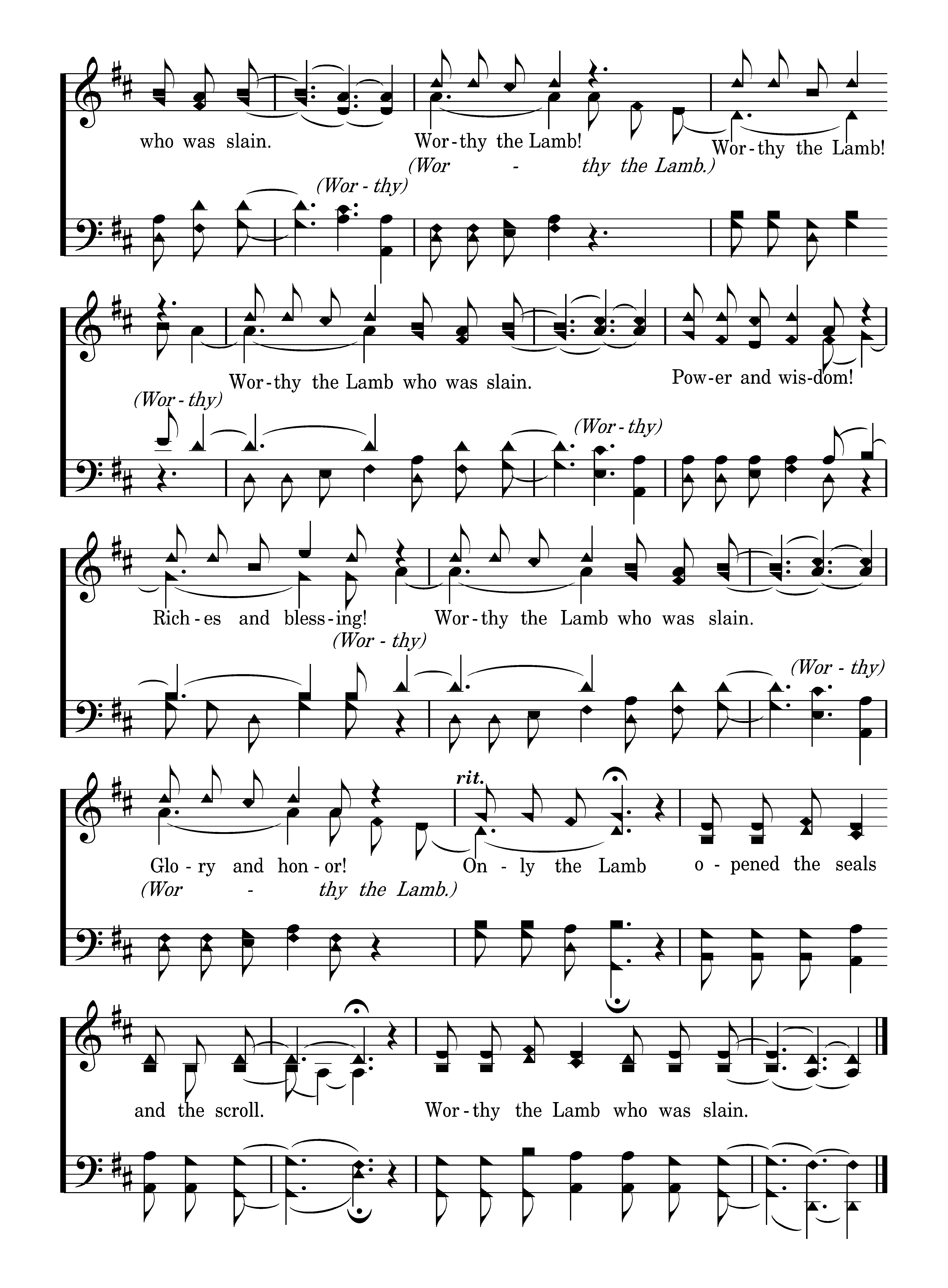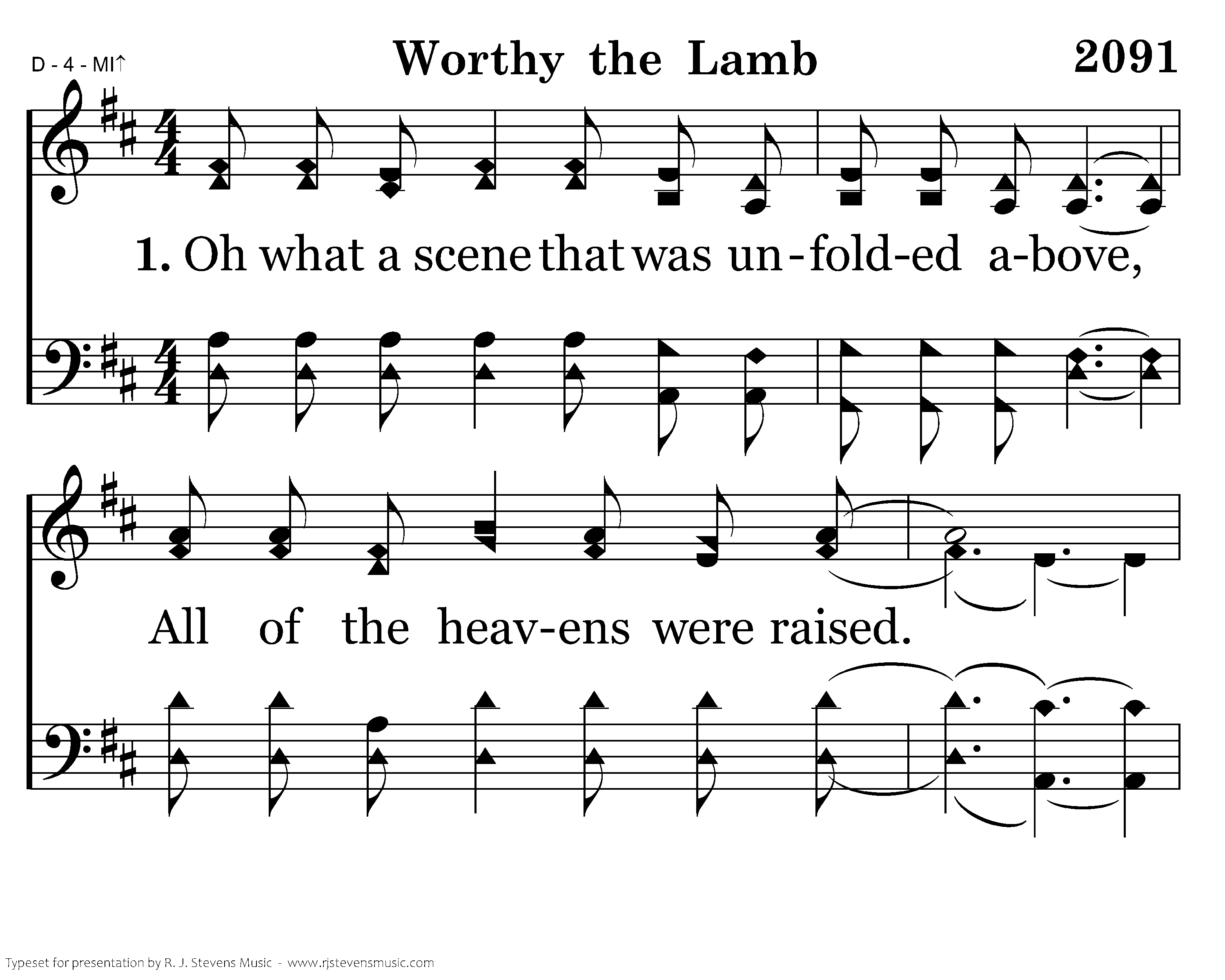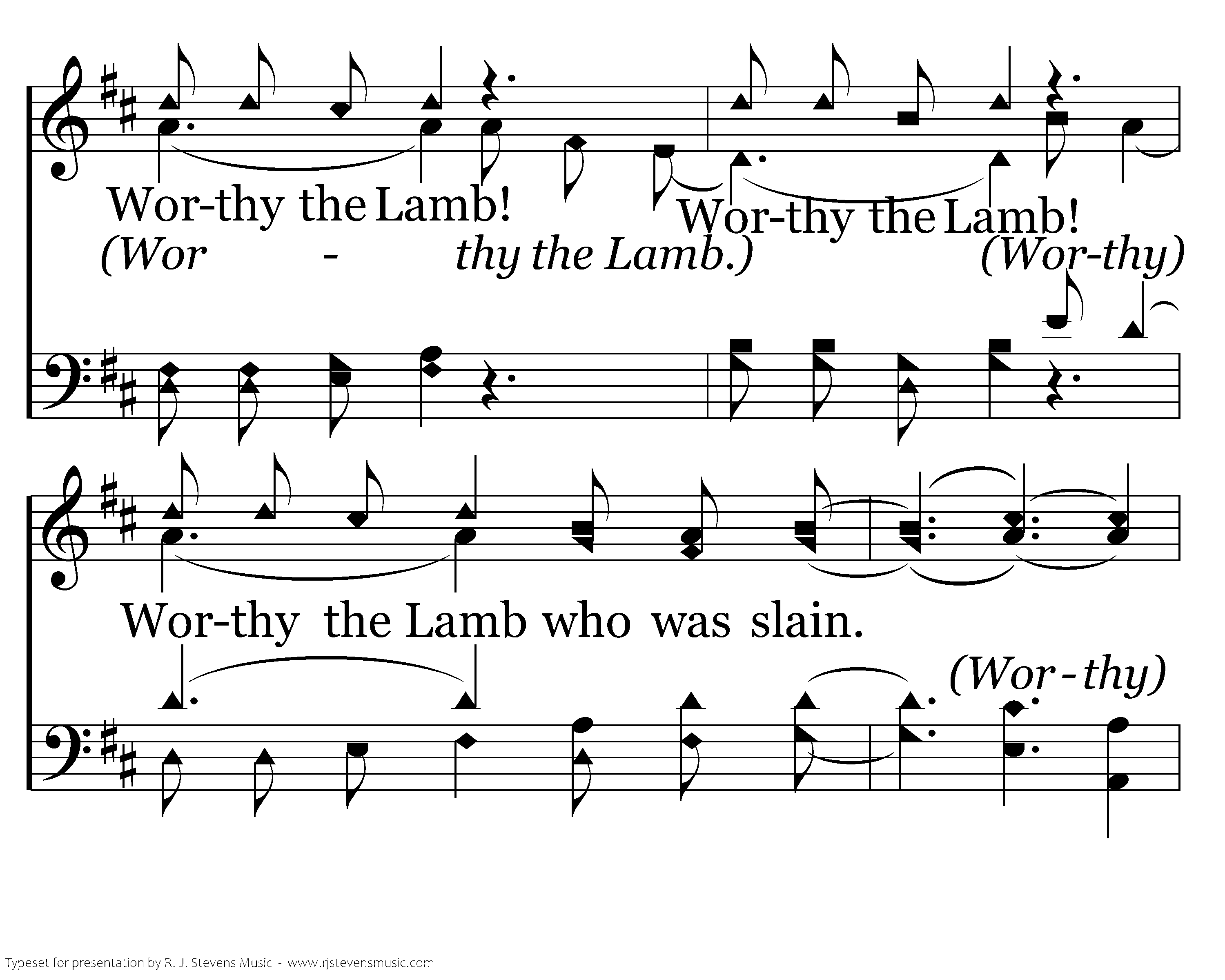 Worthy the Lamb! (Worthy) Worthy the Lamb! (Worthy) Worthy the Lamb who was slain. (Worthy) (Worthy the Lamb) Worthy the Lamb! Worthy the Lamb! (Worthy) Worthy the Lamb who was slain. (Worthy) Power and wisdom! Riches and blessing! (Worthy) Worthy the Lamb who was slain. (Worthy) (Worthy the Lamb) Glory and honor! Only the Lamb opened the seals and the scroll. Worthy the Lamb who was slain.