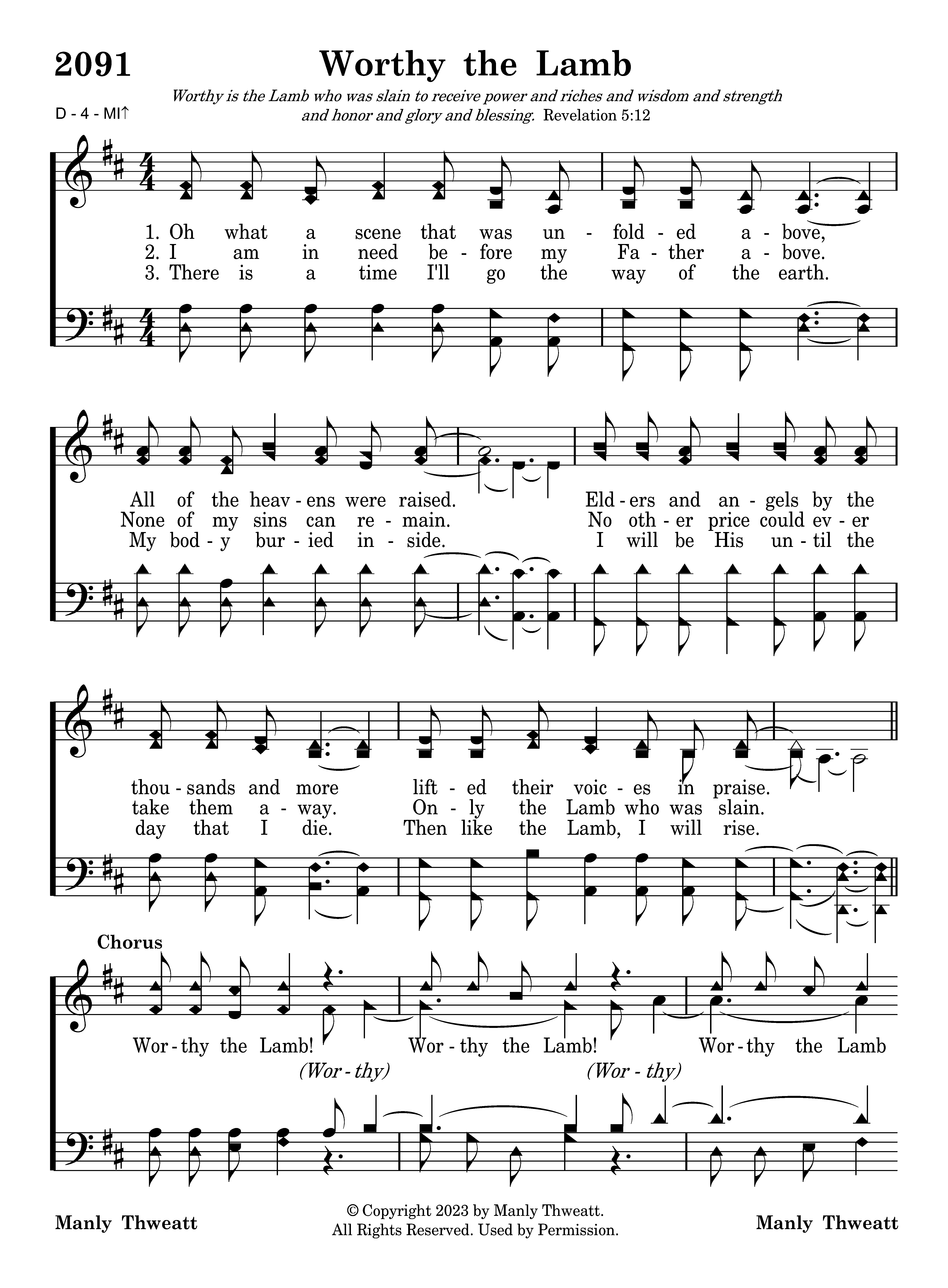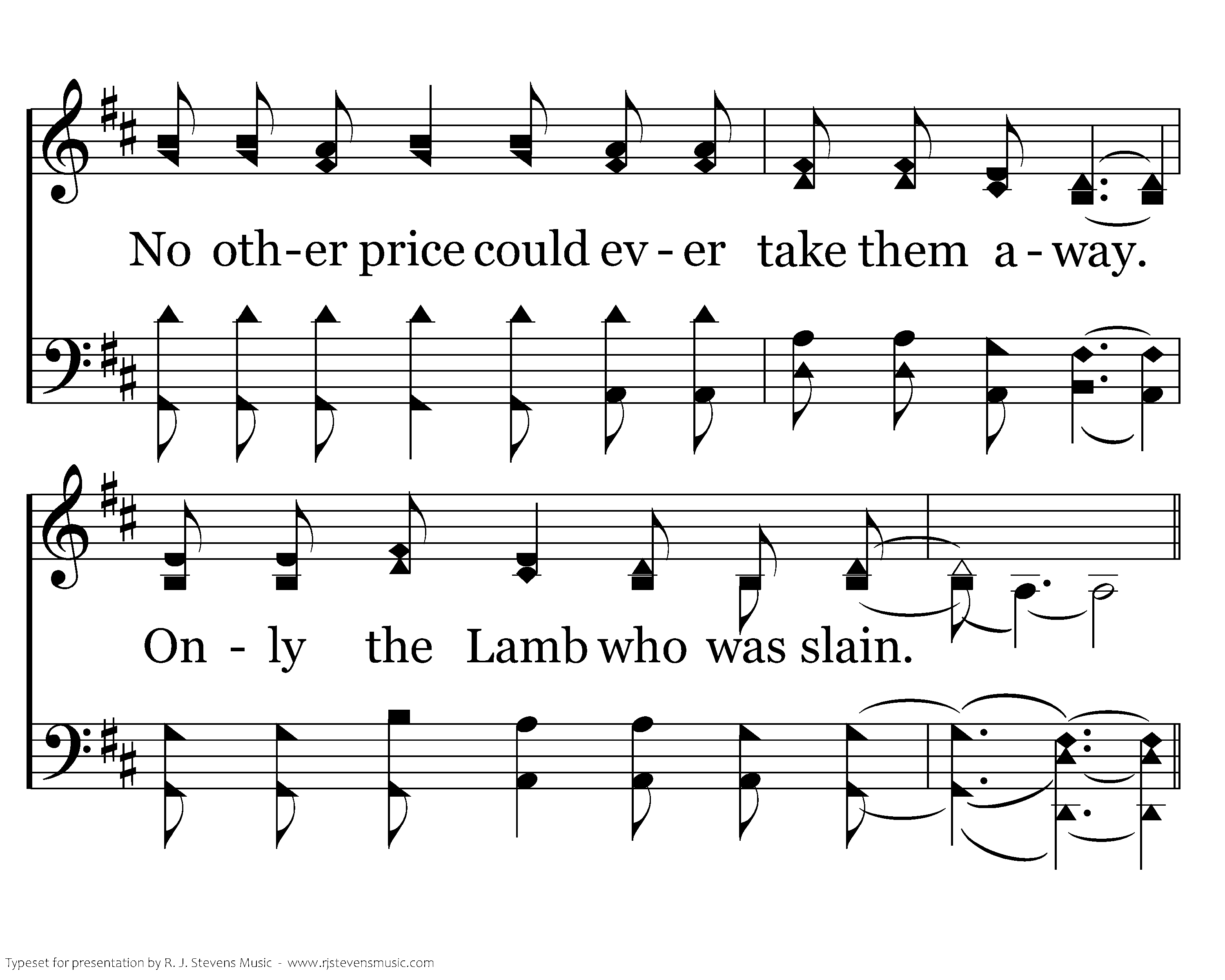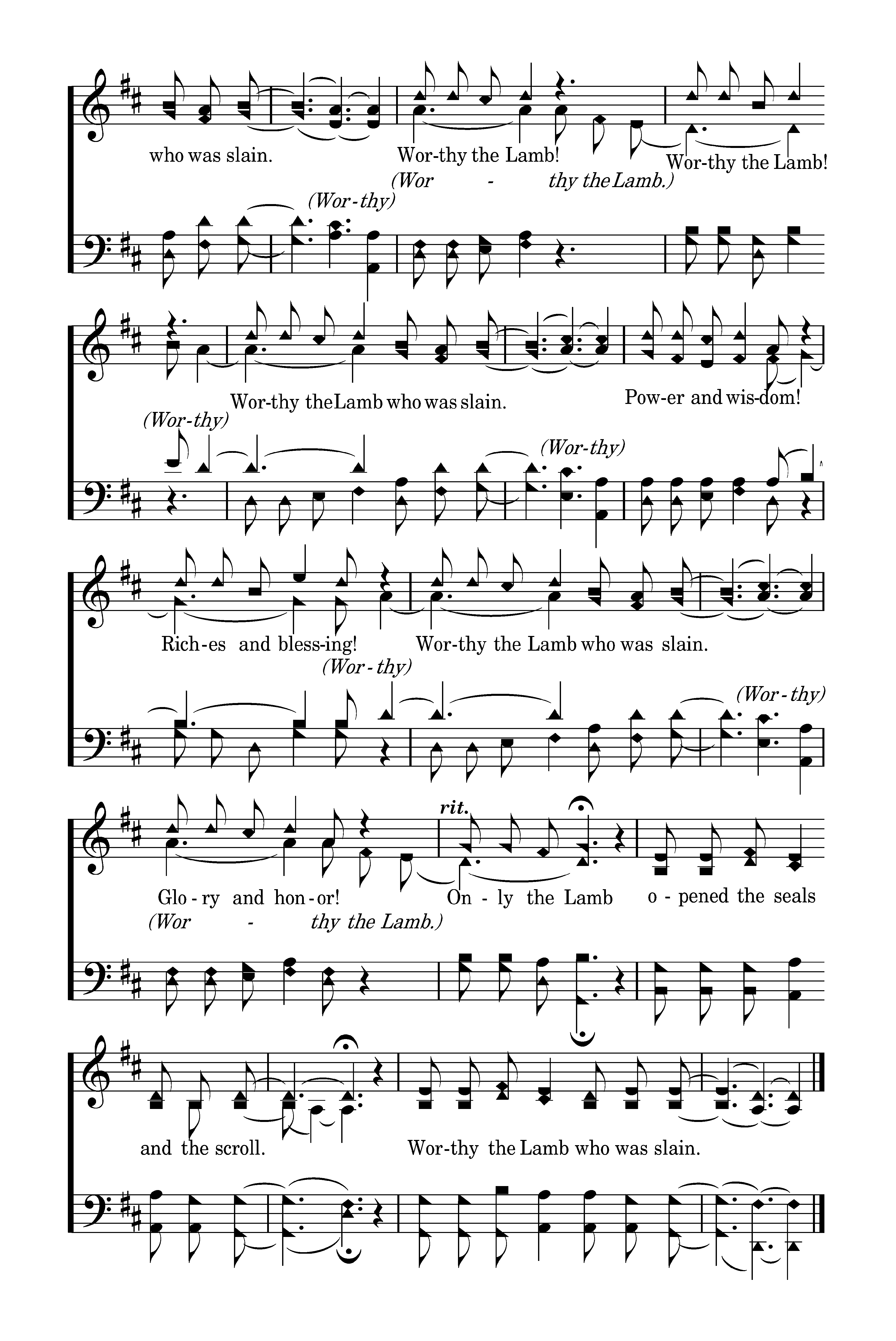 Worthy the Lamb! (Worthy) Worthy the Lamb! (Worthy) Worthy the Lamb who was slain. (Worthy) (Worthy the Lamb) Worthy the Lamb! Worthy the Lamb! (Worthy) Worthy the Lamb who was slain. (Worthy) Power and wisdom! Riches and blessing! (Worthy) Worthy the Lamb who was slain. (Worthy) (Worthy the Lamb) Glory and honor! Only the Lamb opened the seals and the scroll. Worthy the Lamb who was slain.
