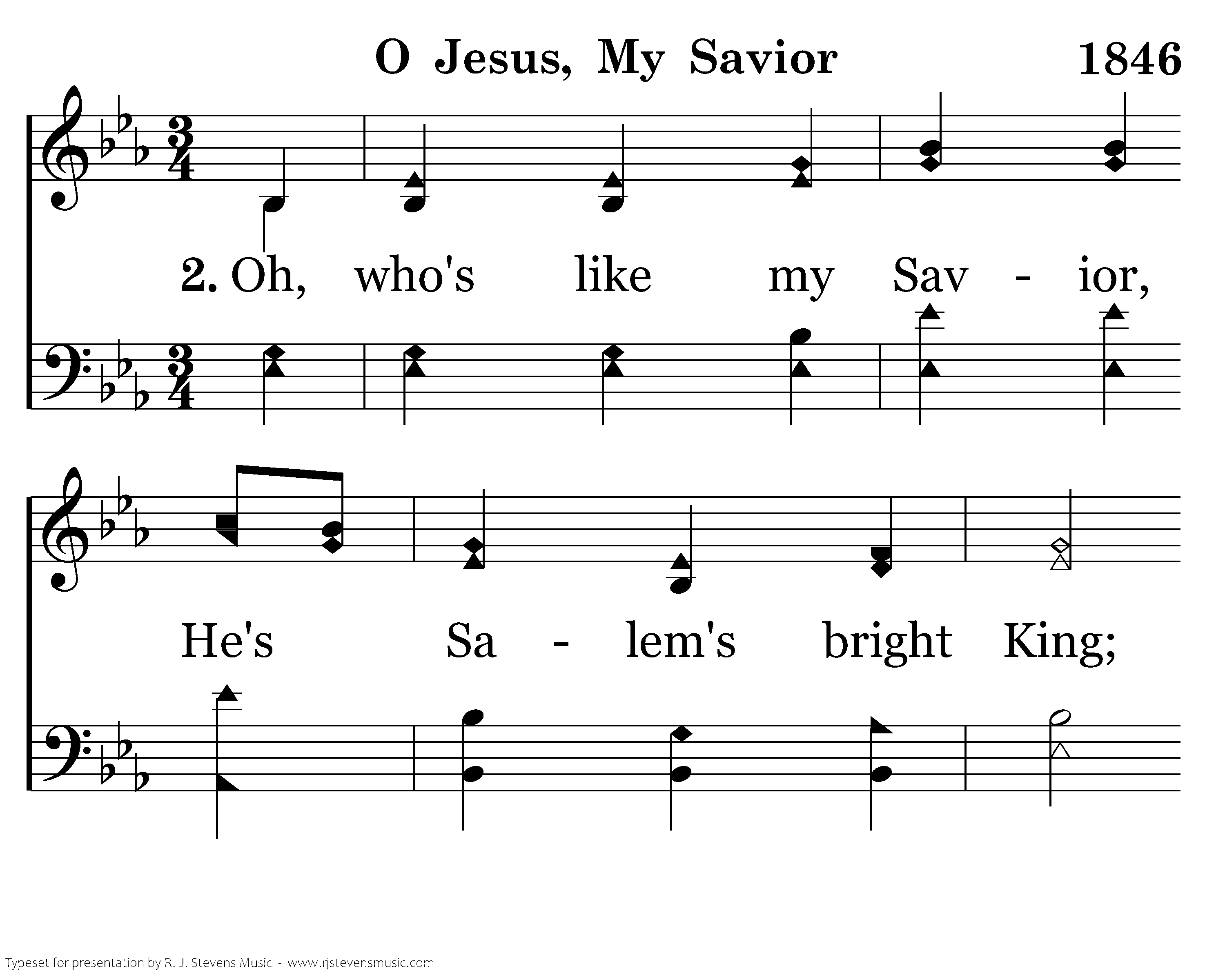 Oh, who's like my Savior, He's Salem's bright King; He smiles and He loves me and helps me to sing: I'll praise Him, I'll praise Him with notes loud and clear, While rivers of pleasure my spirit shall cheer.