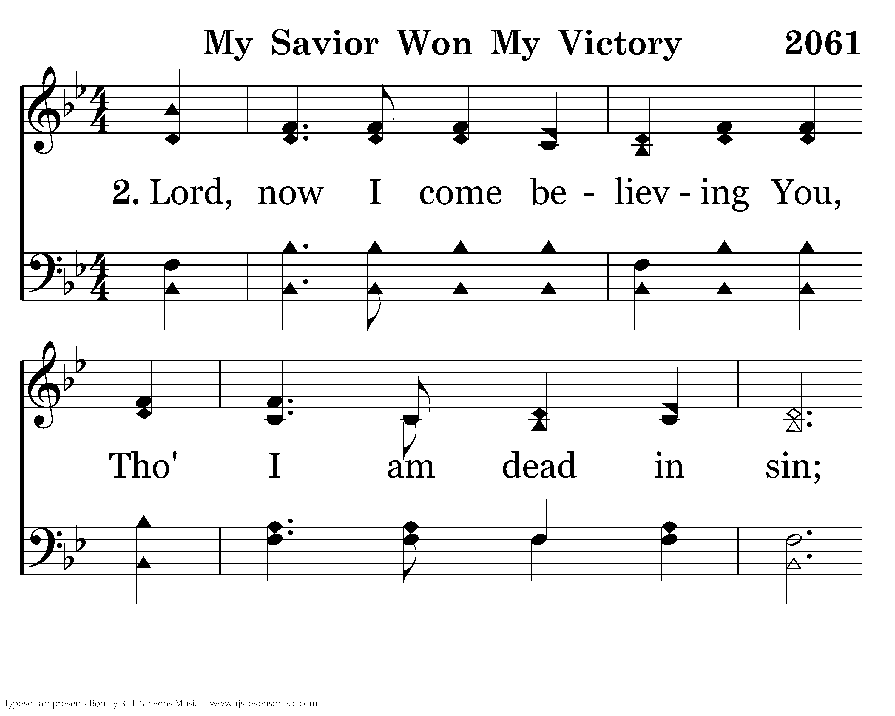 My Savior won my victory, And gives eternal life; Supreme example is for me In ev-'ry mortal strife. Lord, strengthen me to suffer now; Increase my love each day, And help me when I'm tempted here, To turn not from Your way.