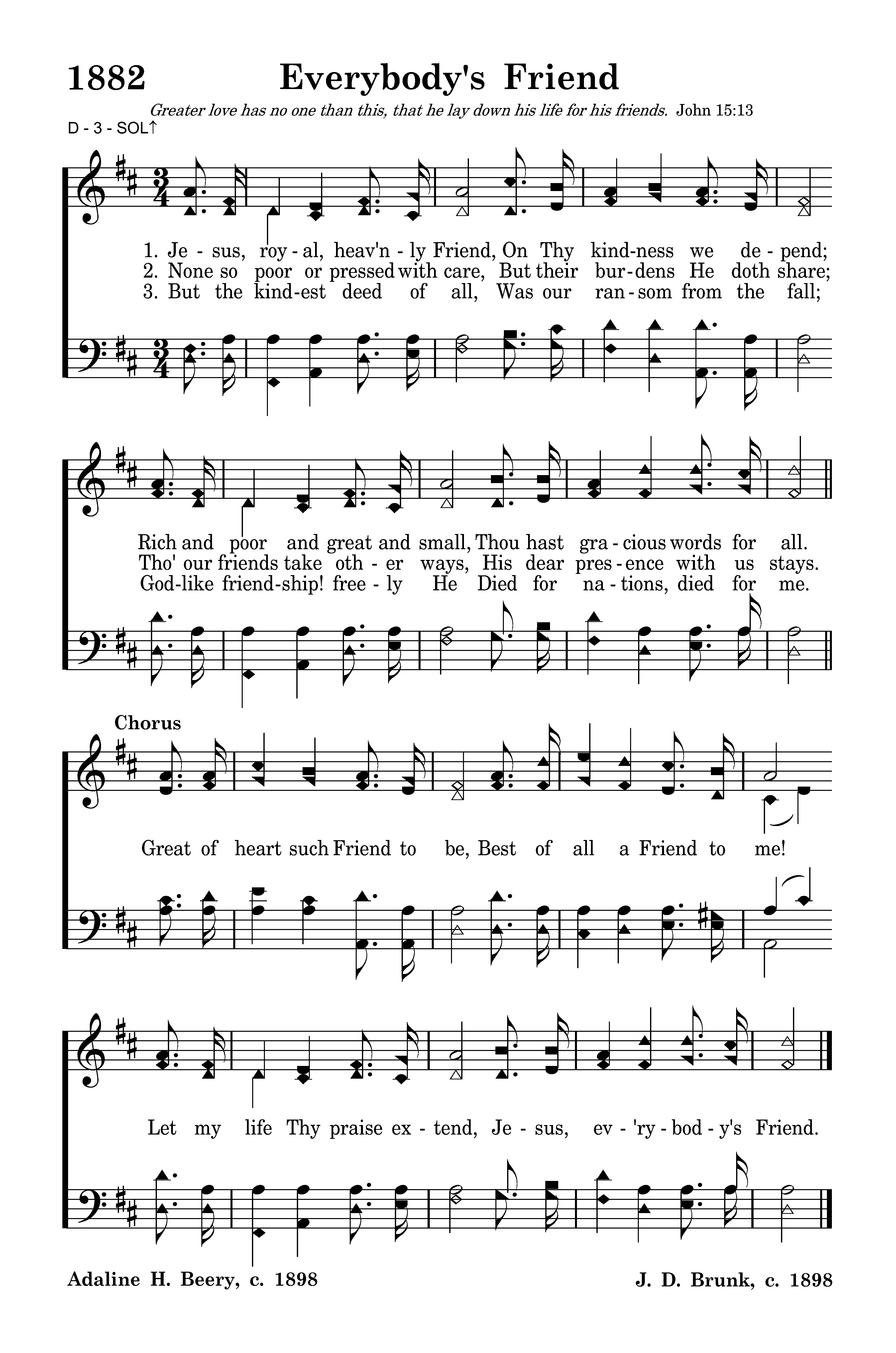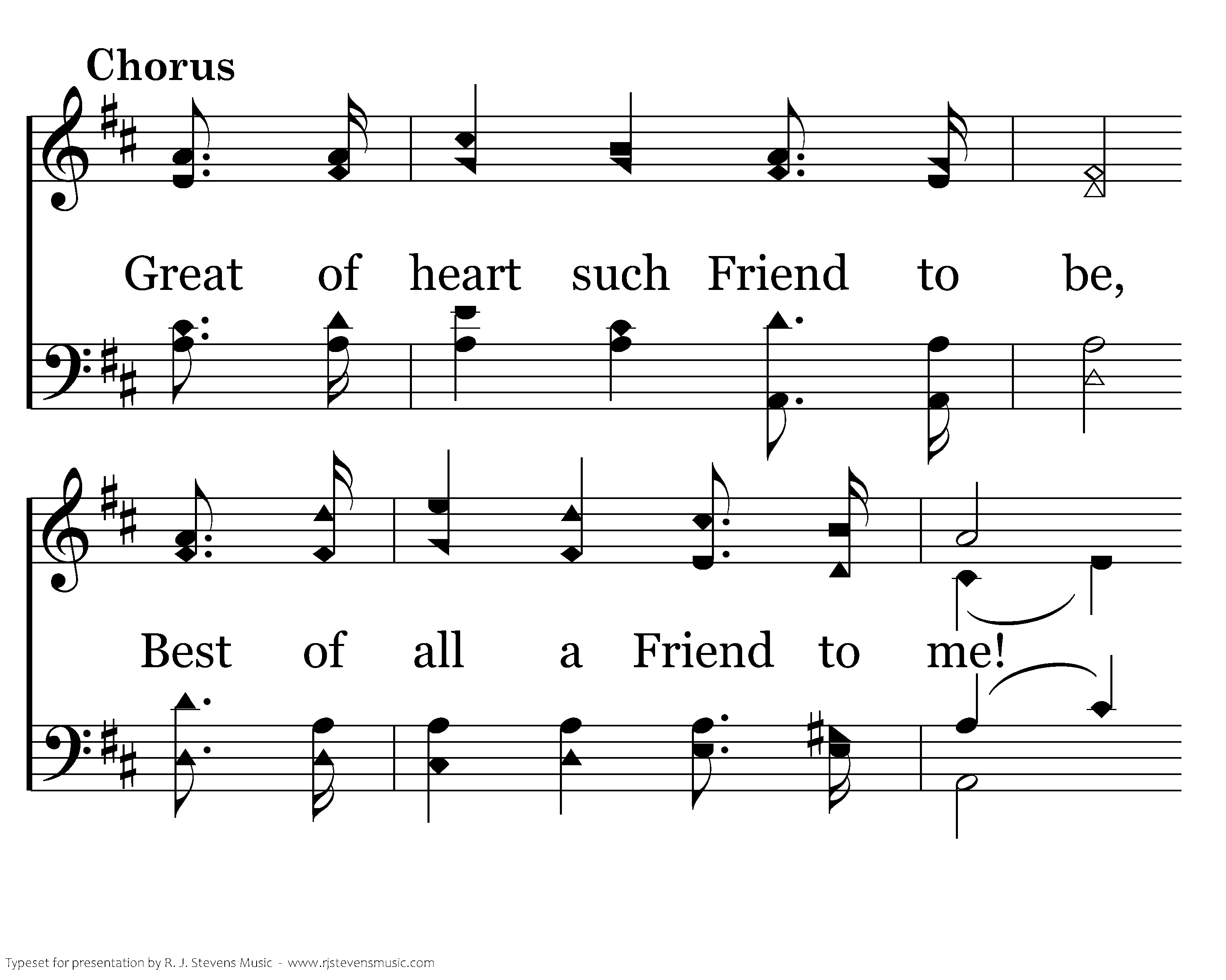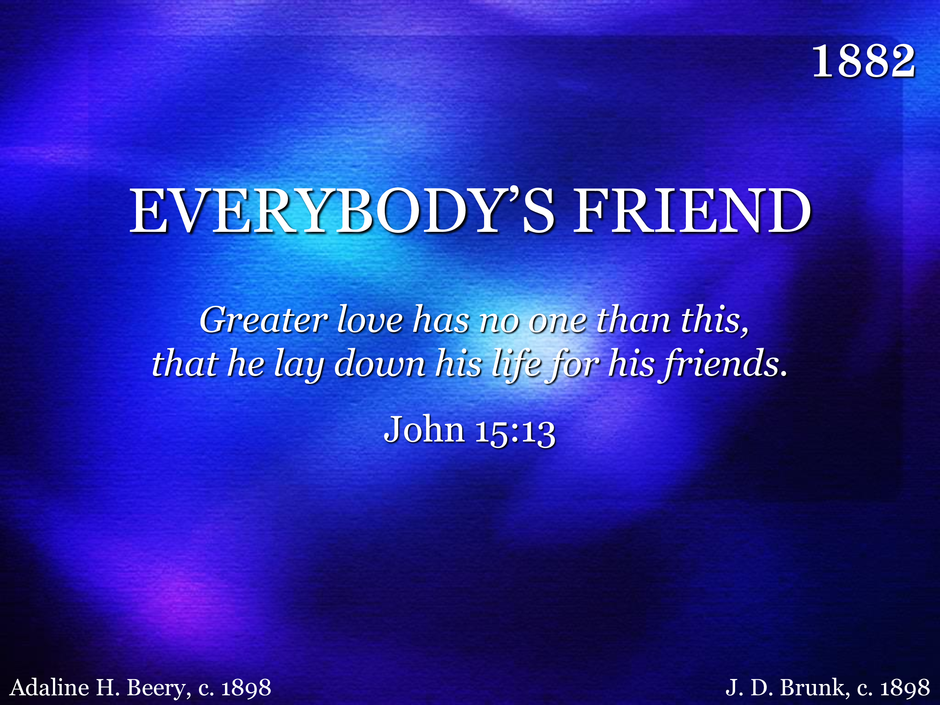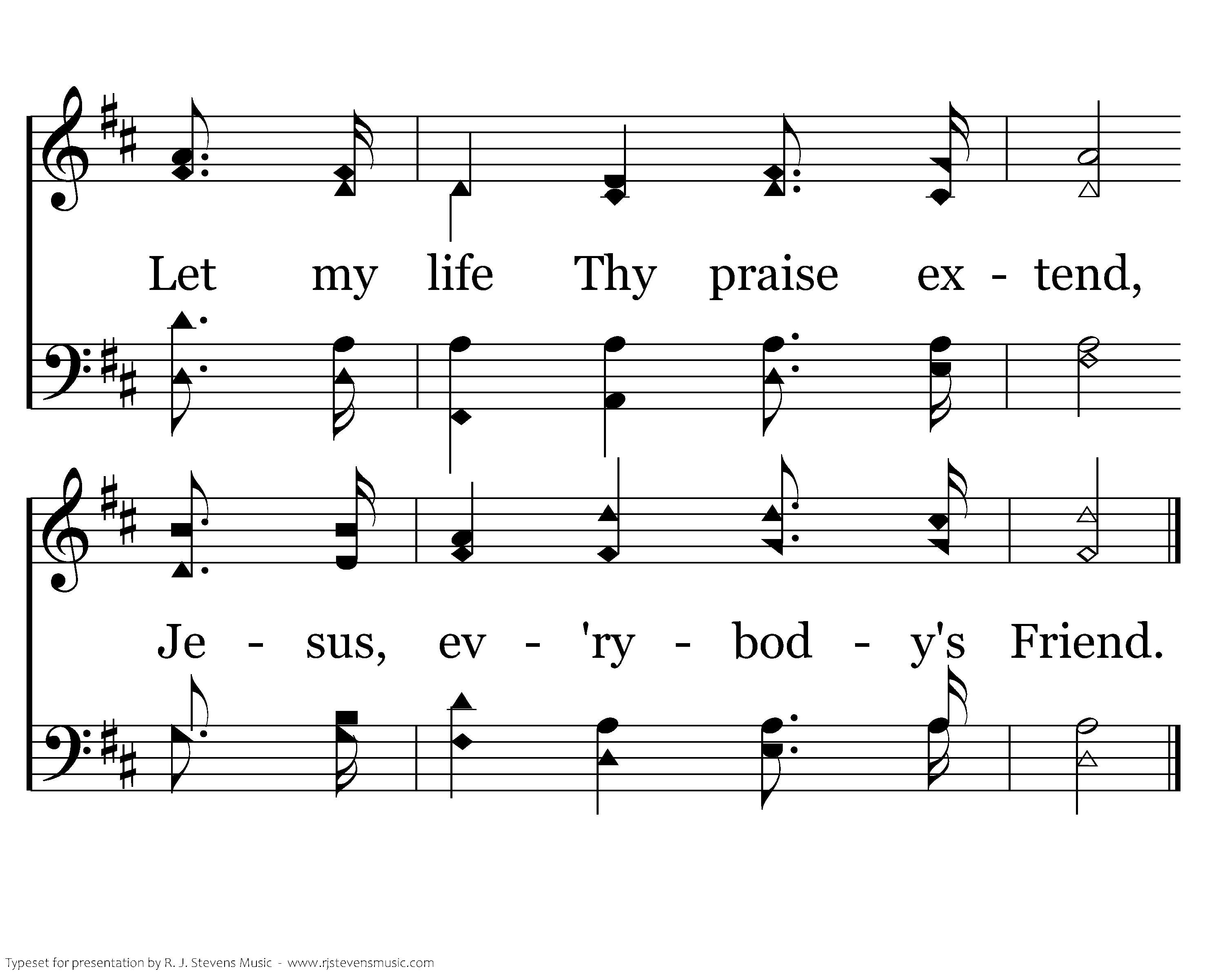 Great of heart such Friend to be, Best of all a Friend to me! Let my life Thy praise extend, Jesus, ev'rybody's Friend.