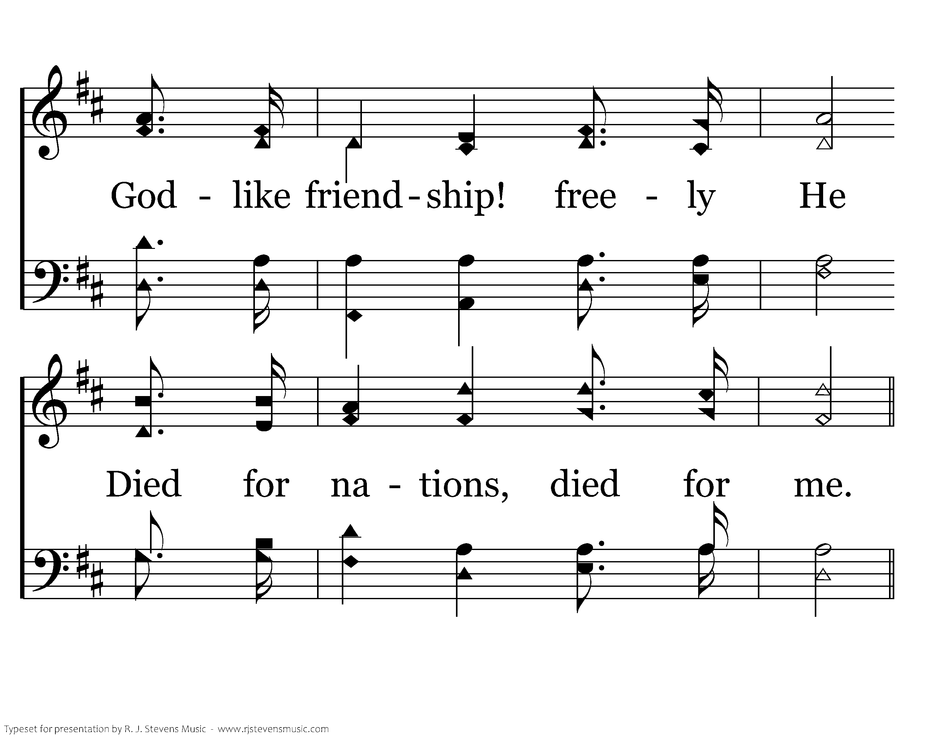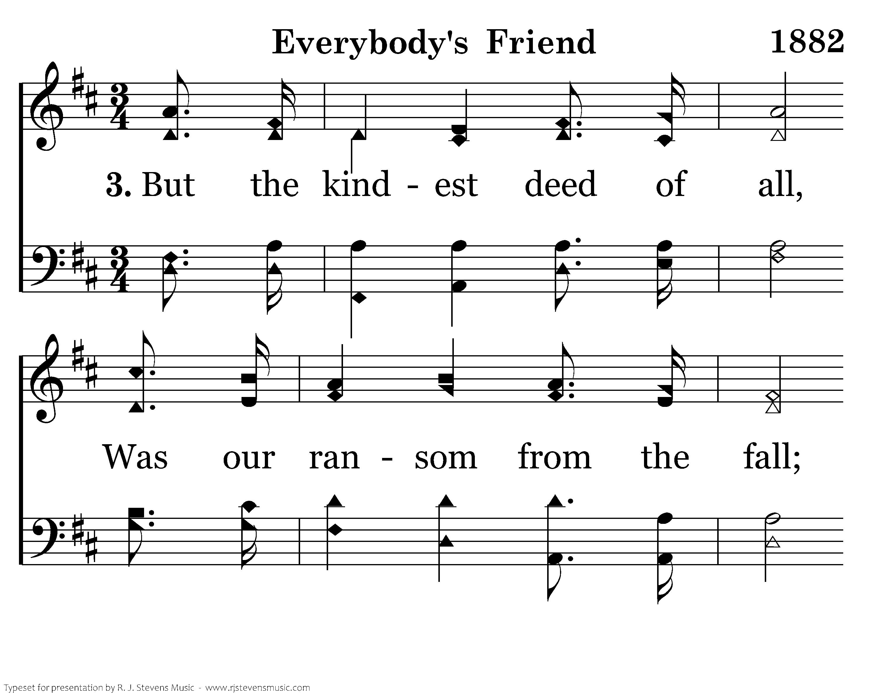 But the kindest deed of all, Was our ransom from the fall; Godlike friendship! freely He Died for nations, died for me.