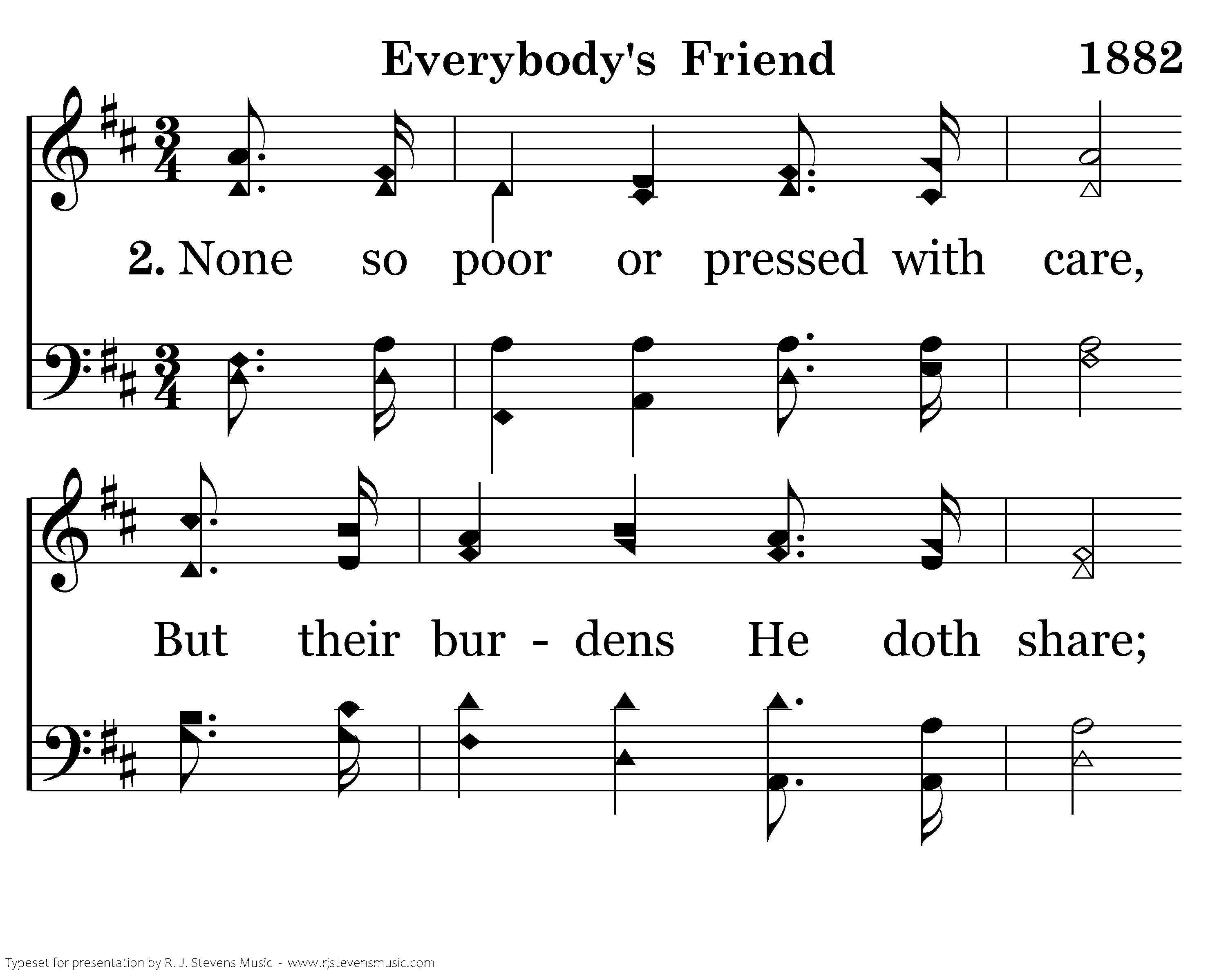 None so poor or pressed with care, But their burdens He doth share; Tho' our friends take other ways, His dear presence with us stays.