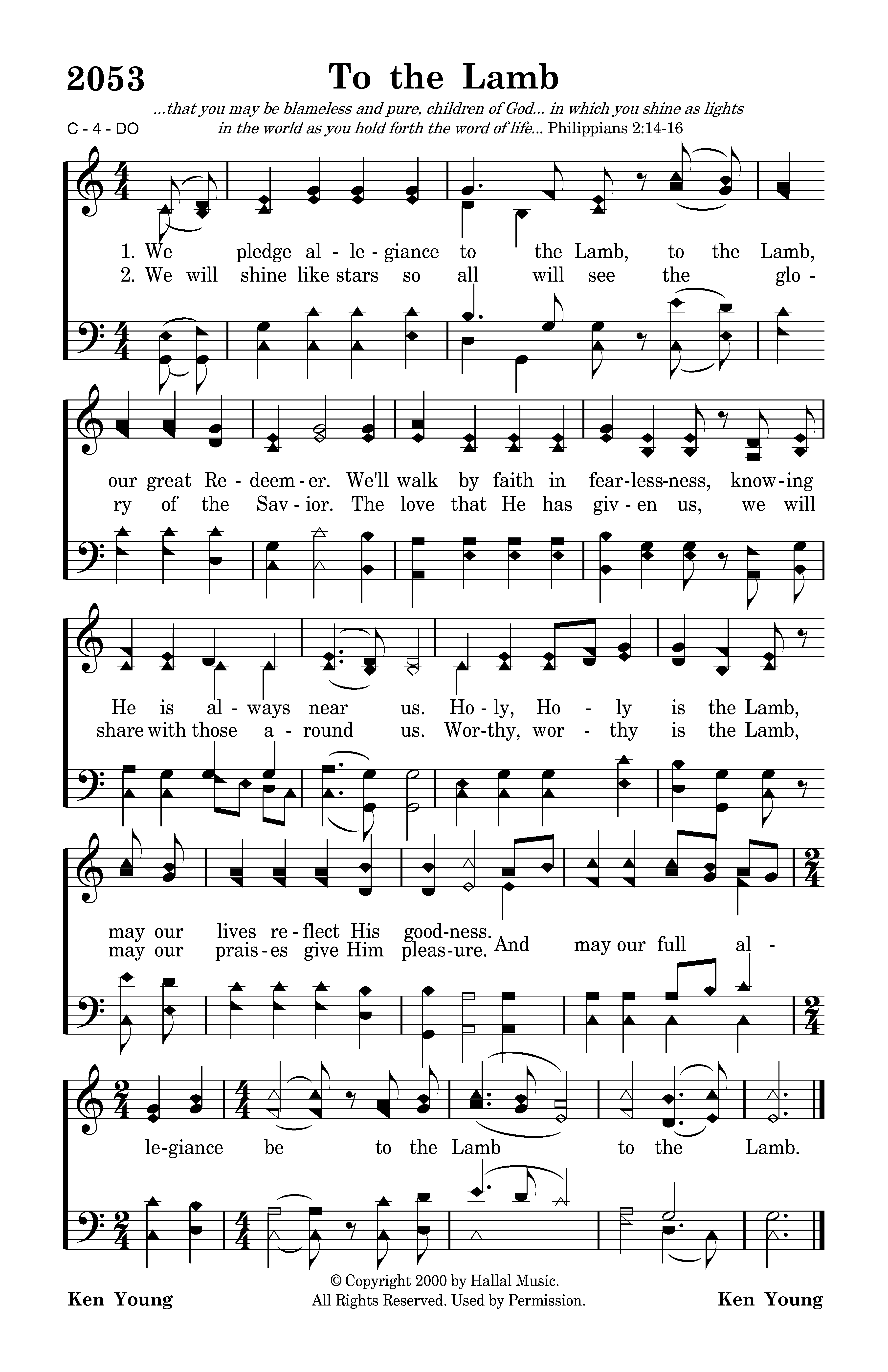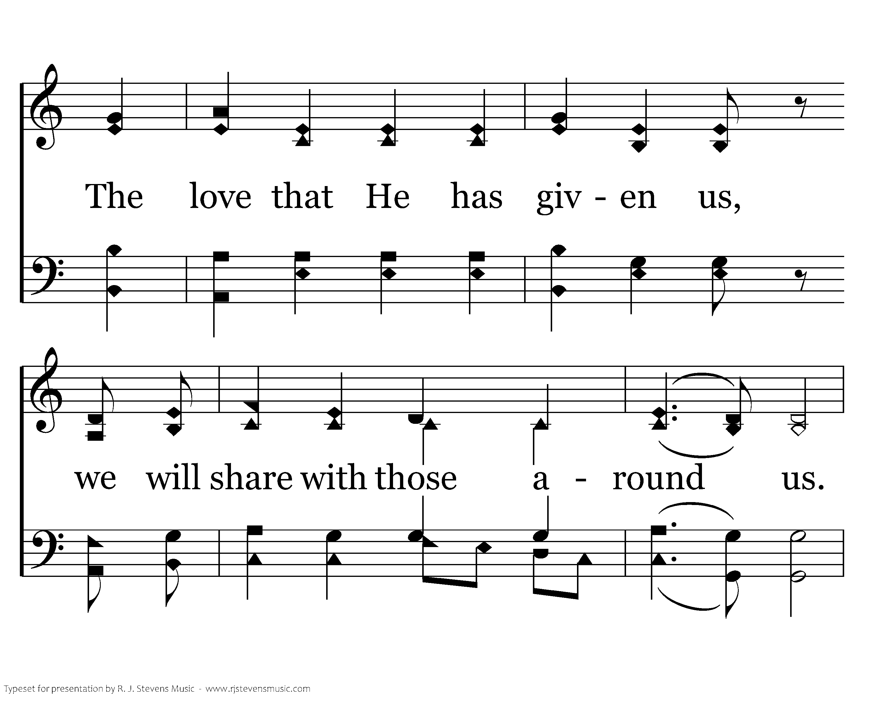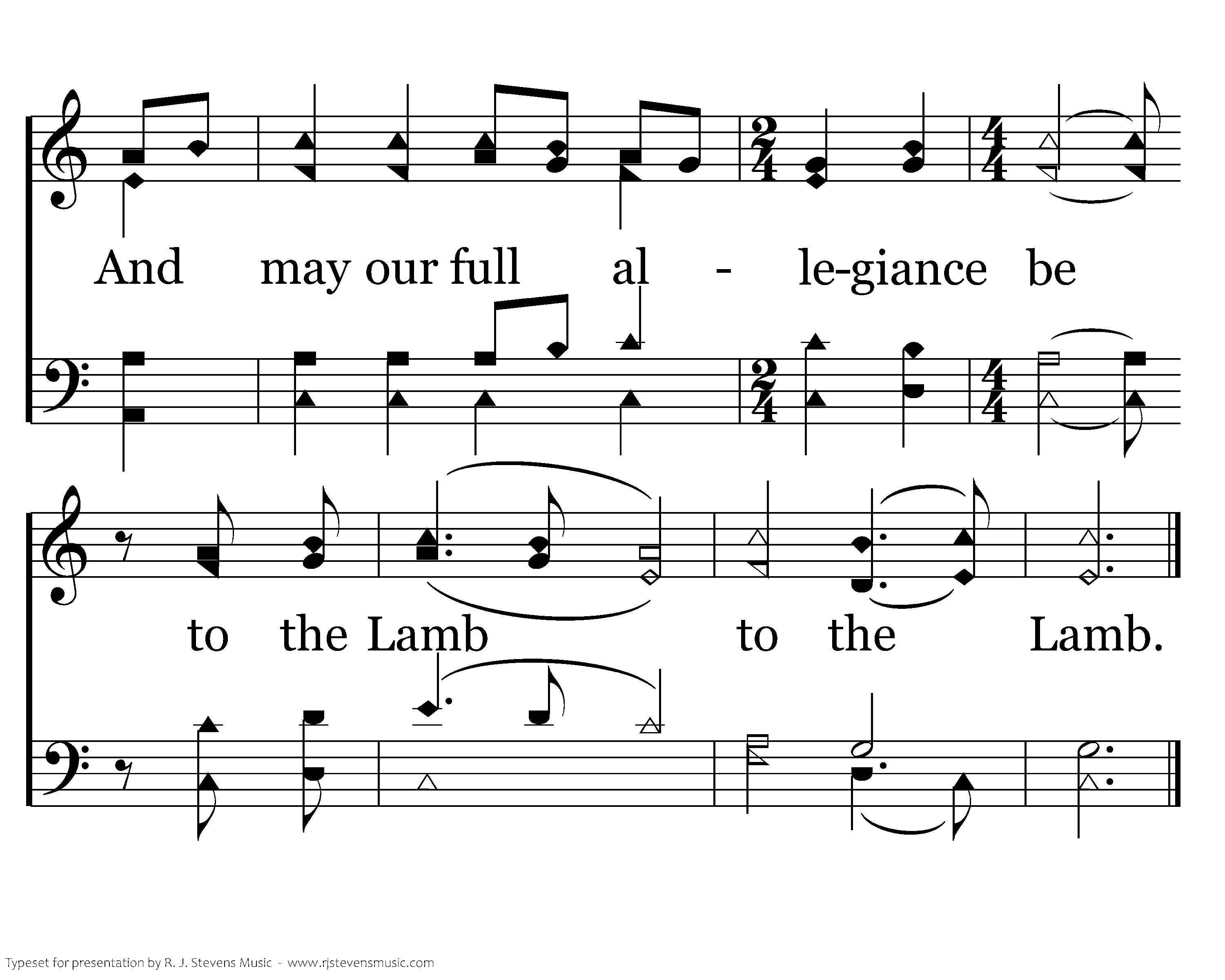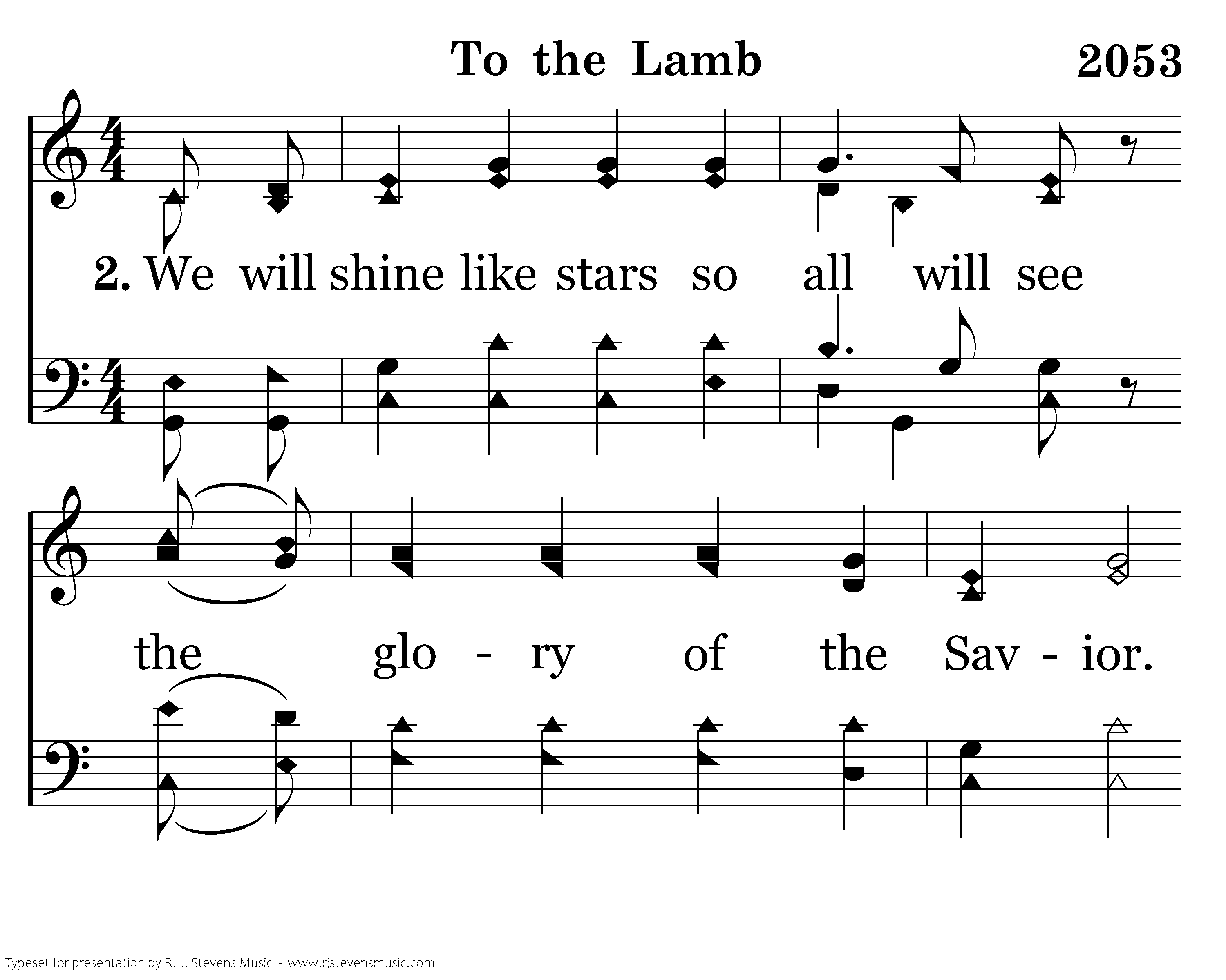 We will shine like stars so all will see the glory of the Savior. The love that He has given us, we will share with those around us. Worthy, wor thy is the Lamb, may our prais es give Him pleasure. And may our full allegiance be to the Lamb to the Lamb.