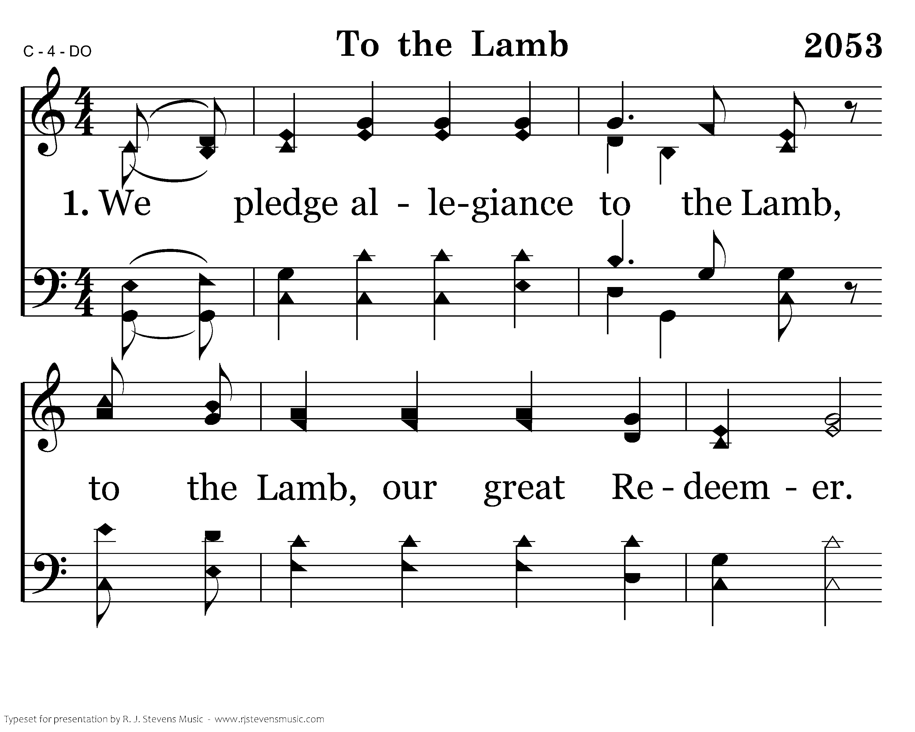 We pledge allegiance to the Lamb, to the Lamb, our great Redeemer. We'll walk by faith in fearlessness, knowing He is always near us. Holy, Holy is the Lamb, may our lives reflect His goodness. And may our full allegiance be to the Lamb to the Lamb.