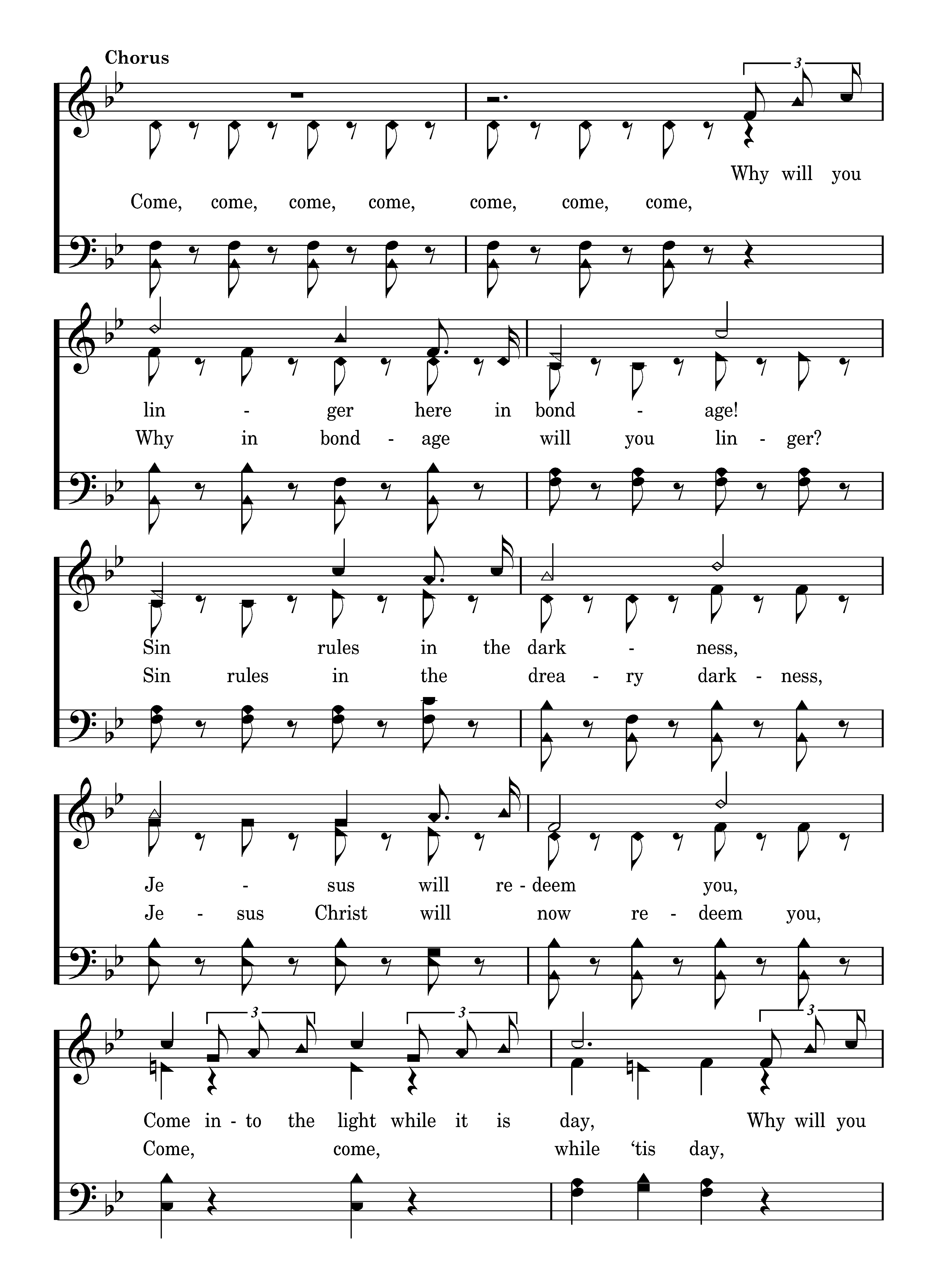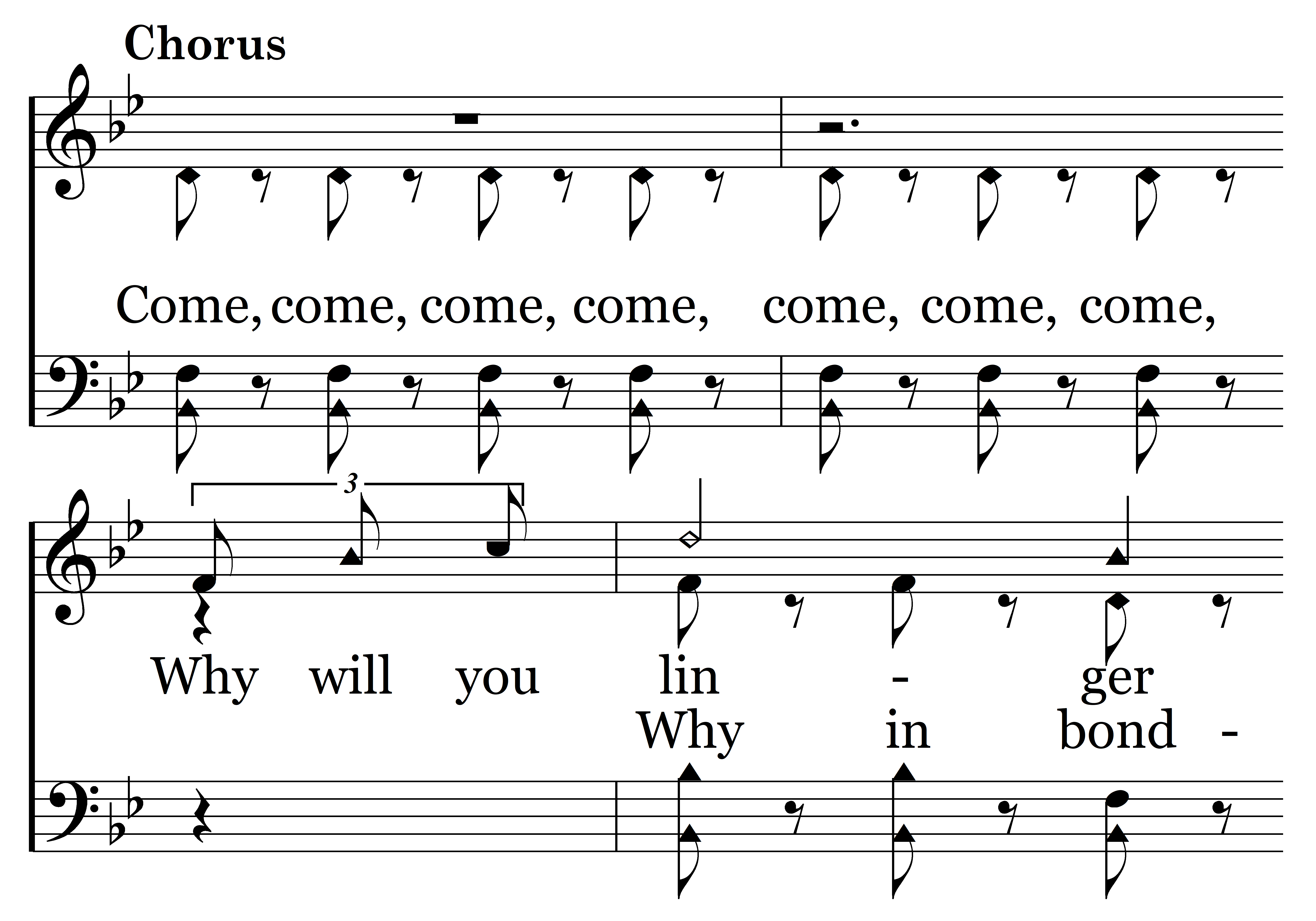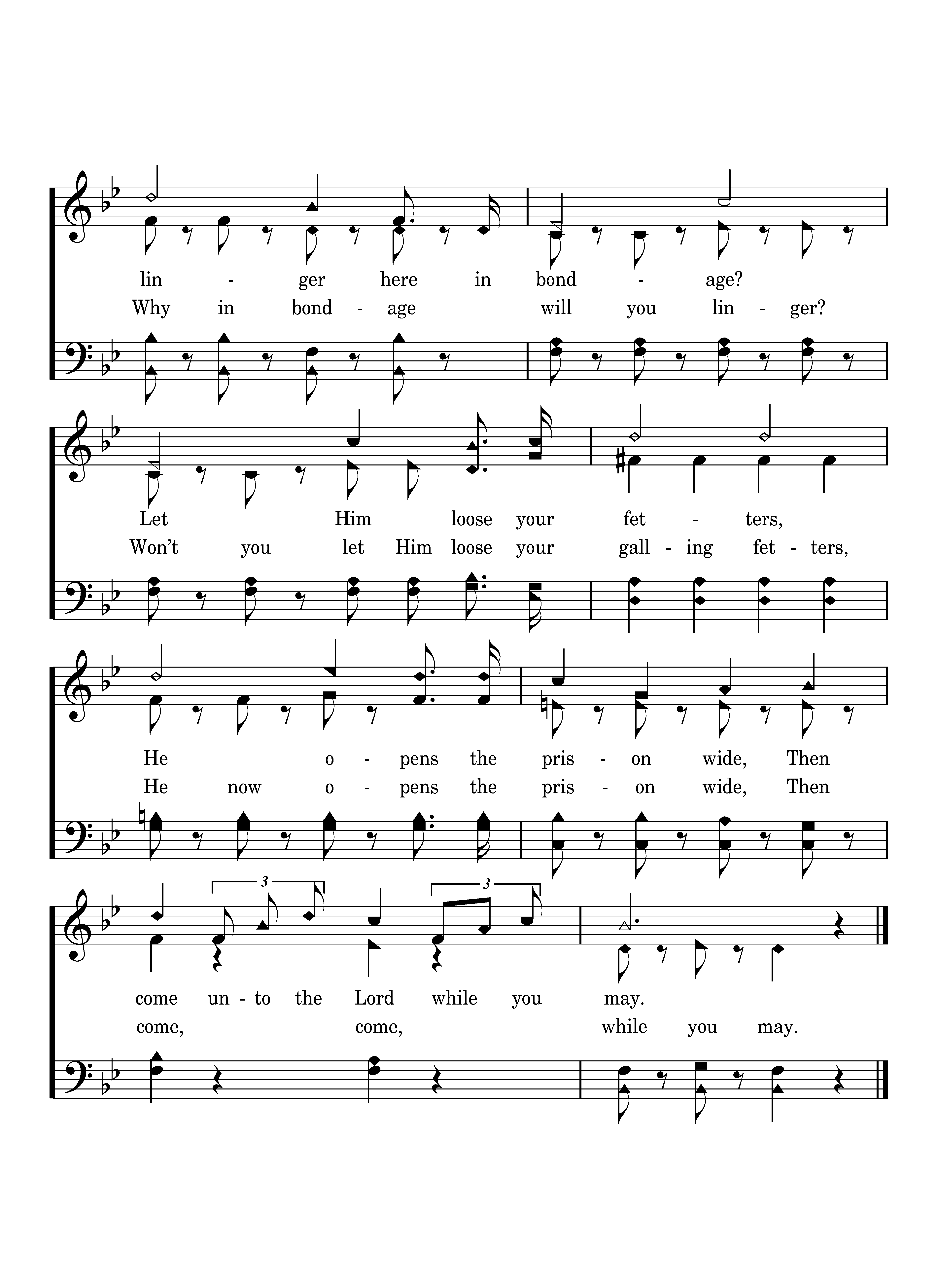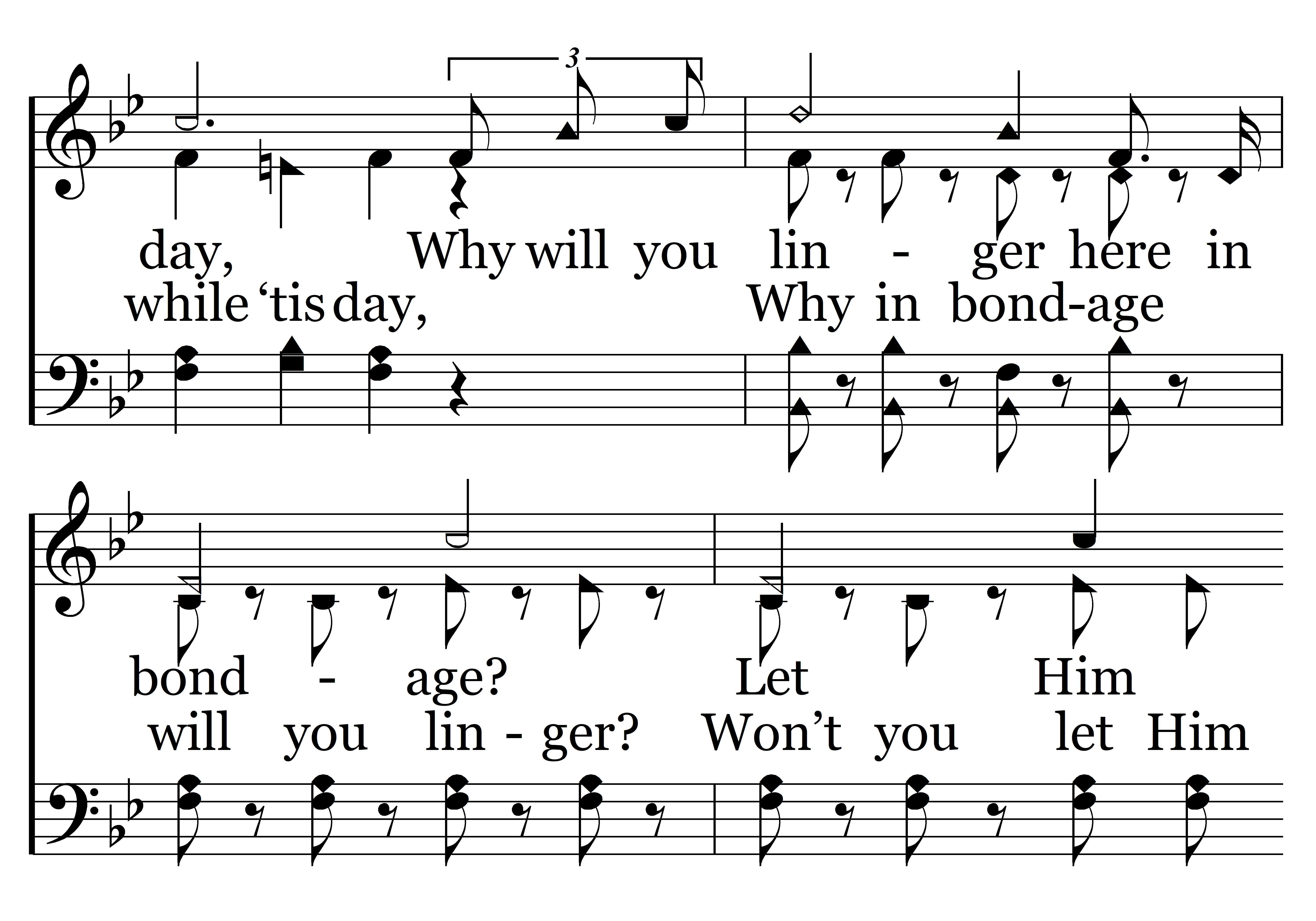 Why will you linger here in bondage! Sin rules in the darkness, Jesus will redeem you, Come into the light while it is day, Why will you linger here in bondage? Let Him loose your fetters, He opens the prison wide, Then come unto the Lord while you may. (Come, come, come, come, come, come, come, Why in bondage will you linger? Sin rules in the dreary darkness, Jesus Christ will now redeem you, Come, come, while ‘tis day, Why in bondage will you linger? Won’t you let Him loose your galling fetters, He now opens the prison wide, Then come, come, while you may.)
