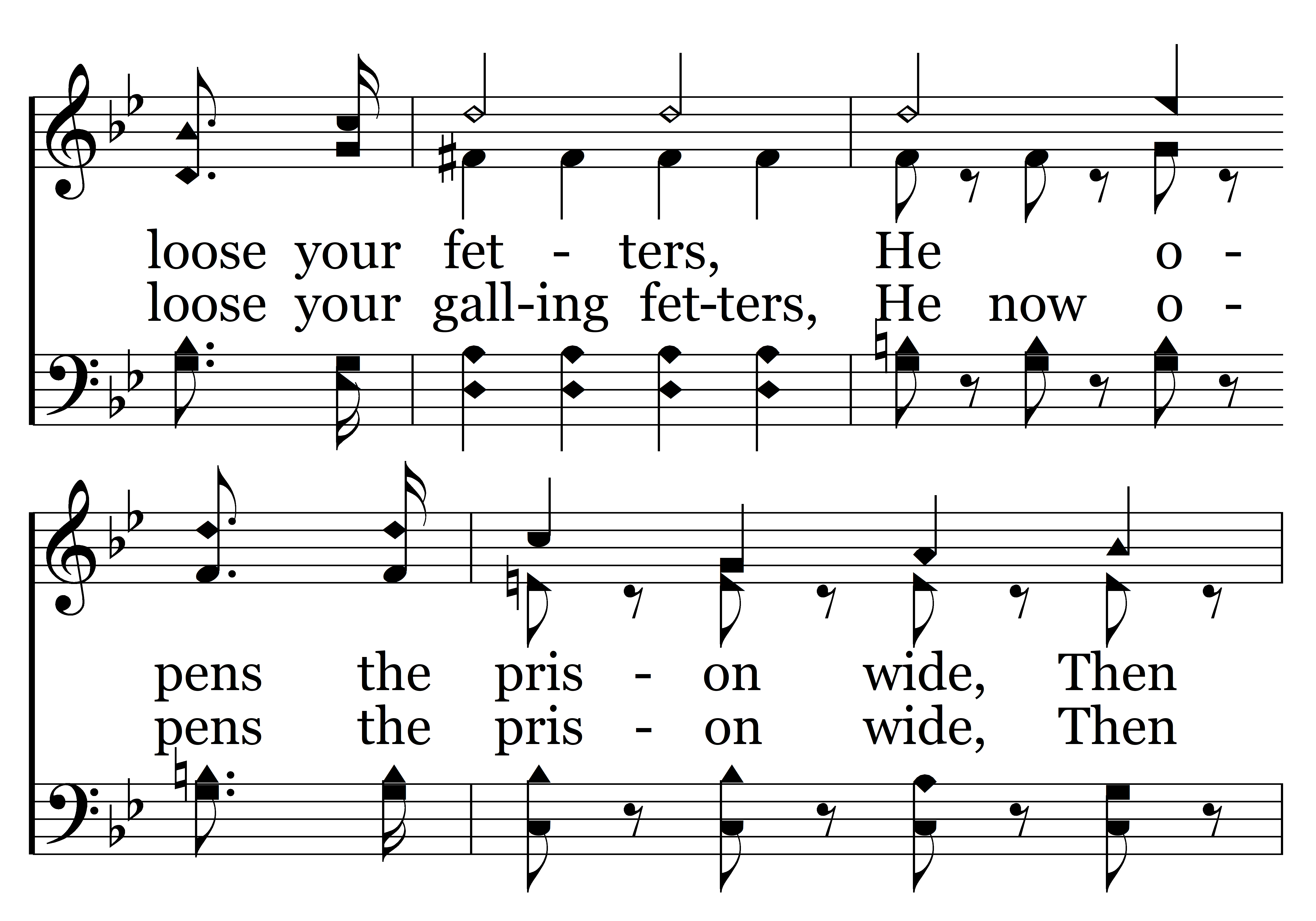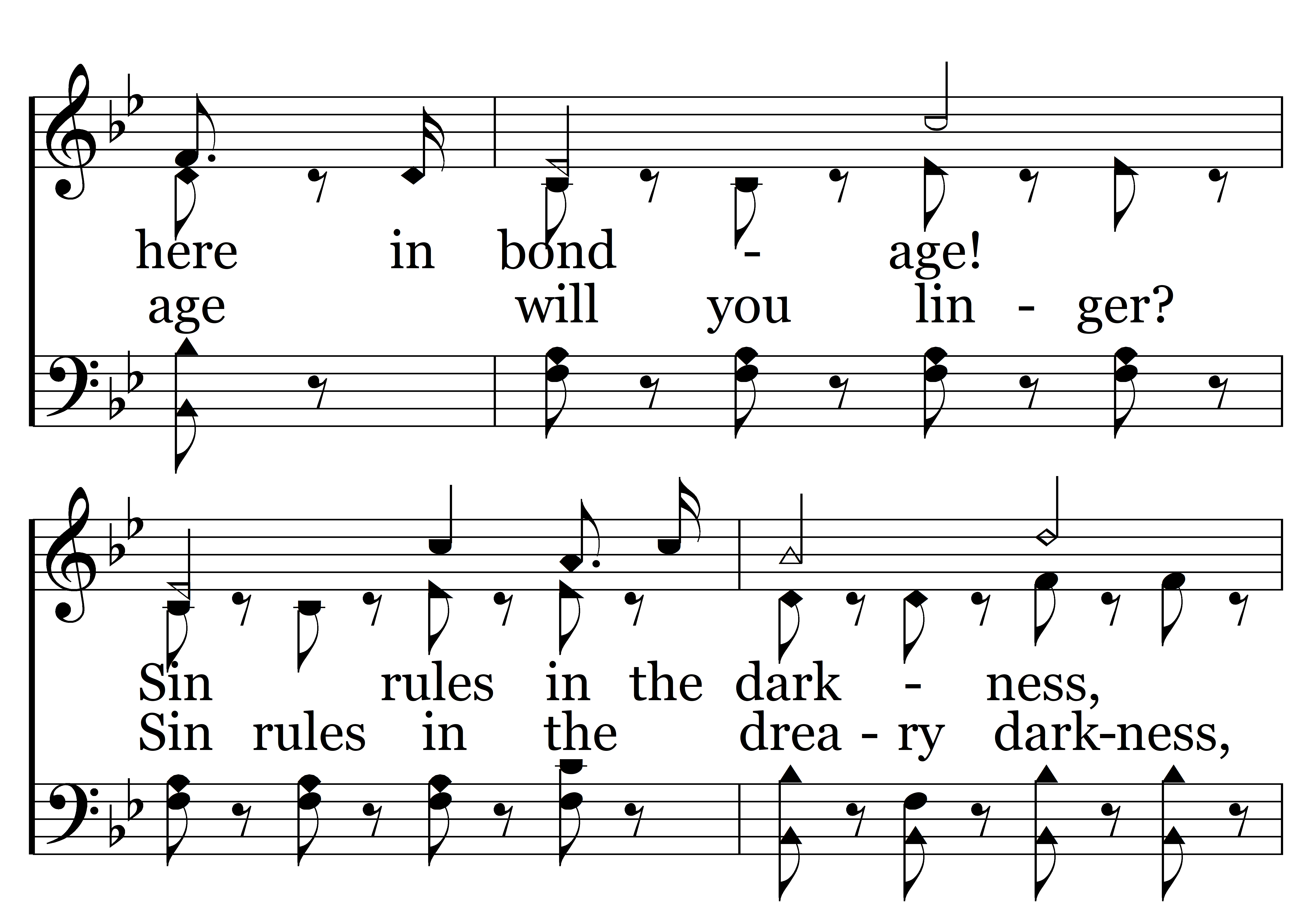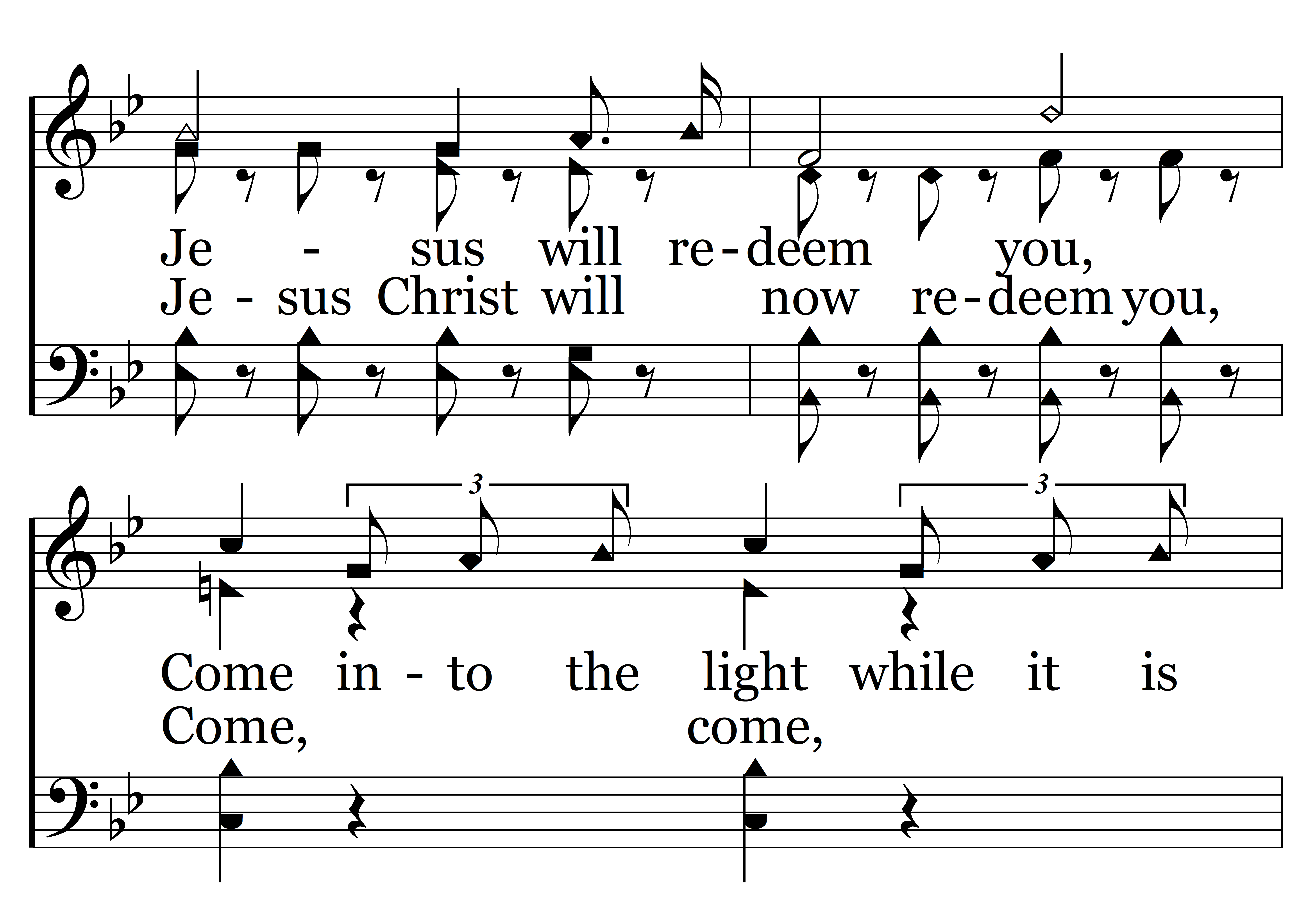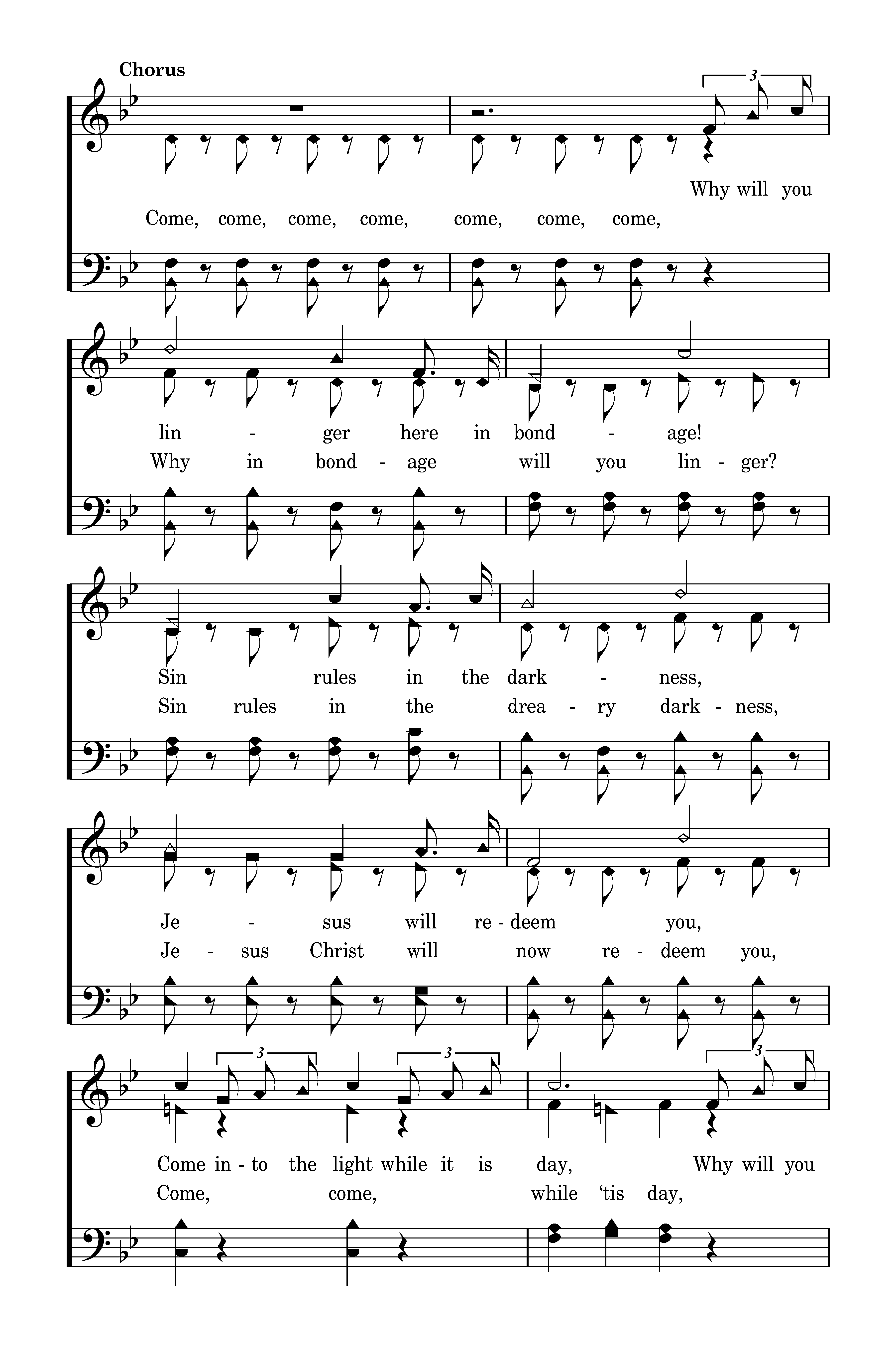 Why will you linger here in bondage! Sin rules in the darkness, Jesus will redeem you, Come into the light while it is day, Why will you linger here in bondage? Let Him loose your fetters, He opens the prison wide, Then come unto the Lord while you may. (Come, come, come, come, come, come, come, Why in bondage will you linger? Sin rules in the dreary darkness, Jesus Christ will now redeem you, Come, come, while ‘tis day, Why in bondage will you linger? Won’t you let Him loose your galling fetters, He now opens the prison wide, Then come, come, while you may.)