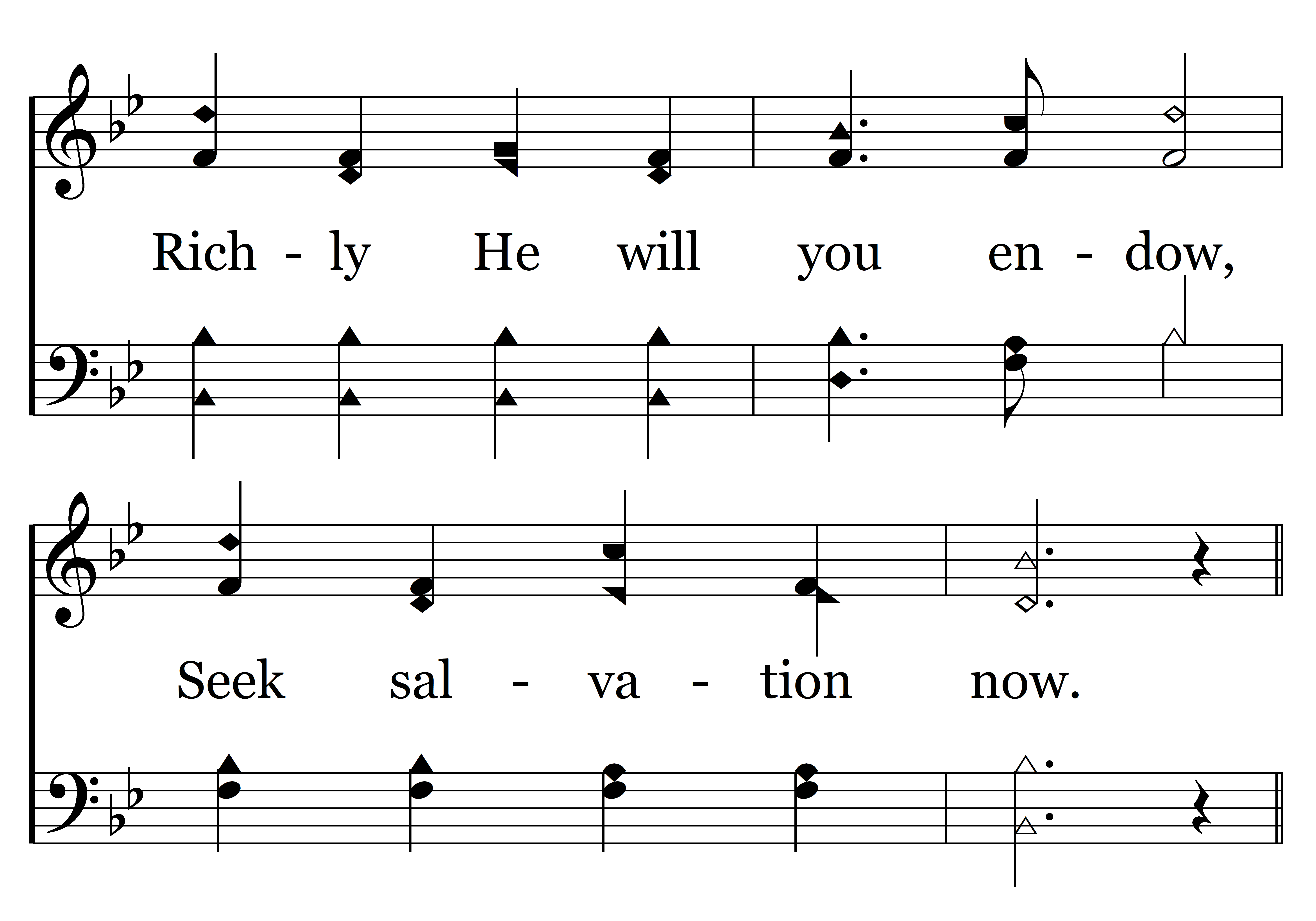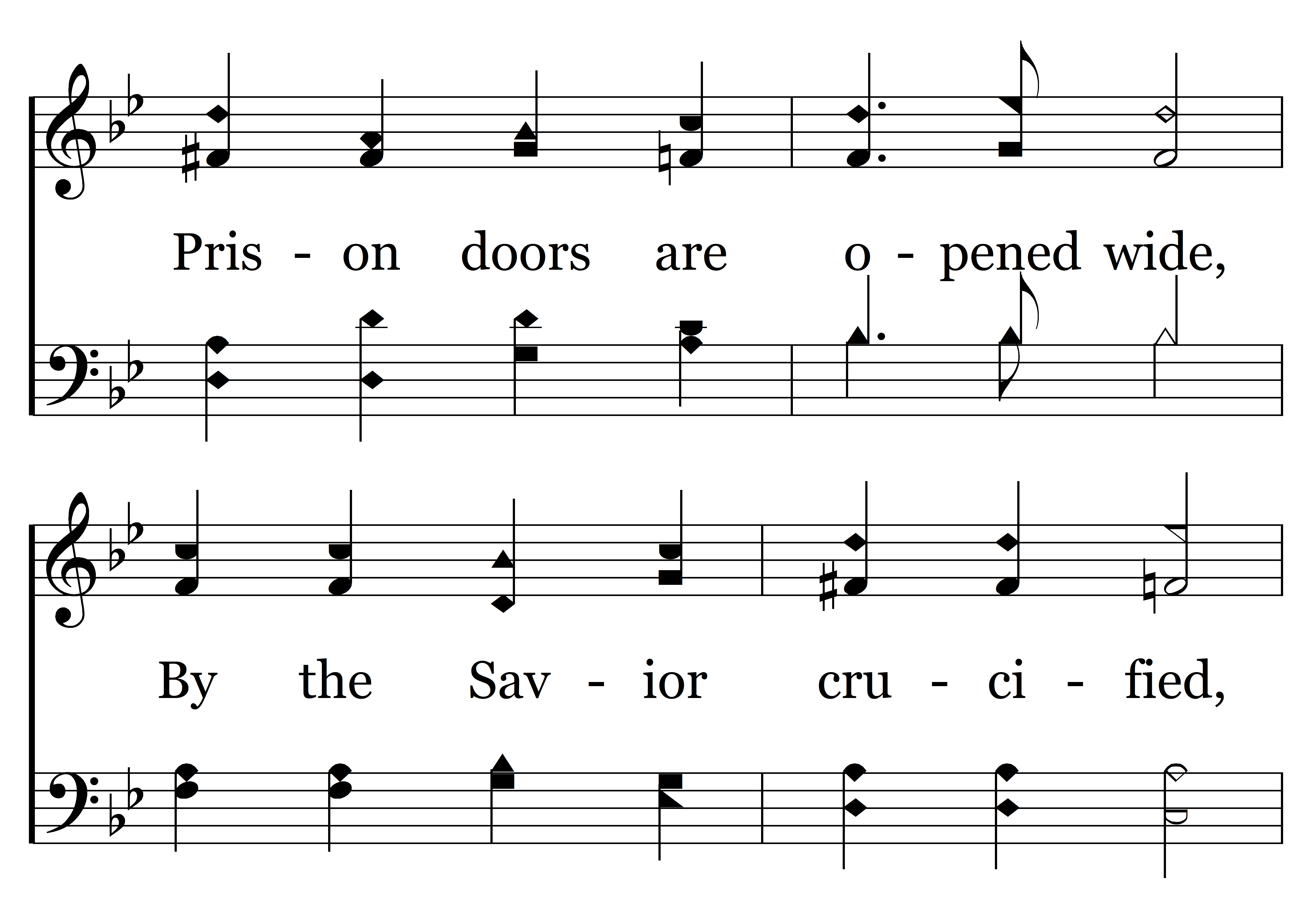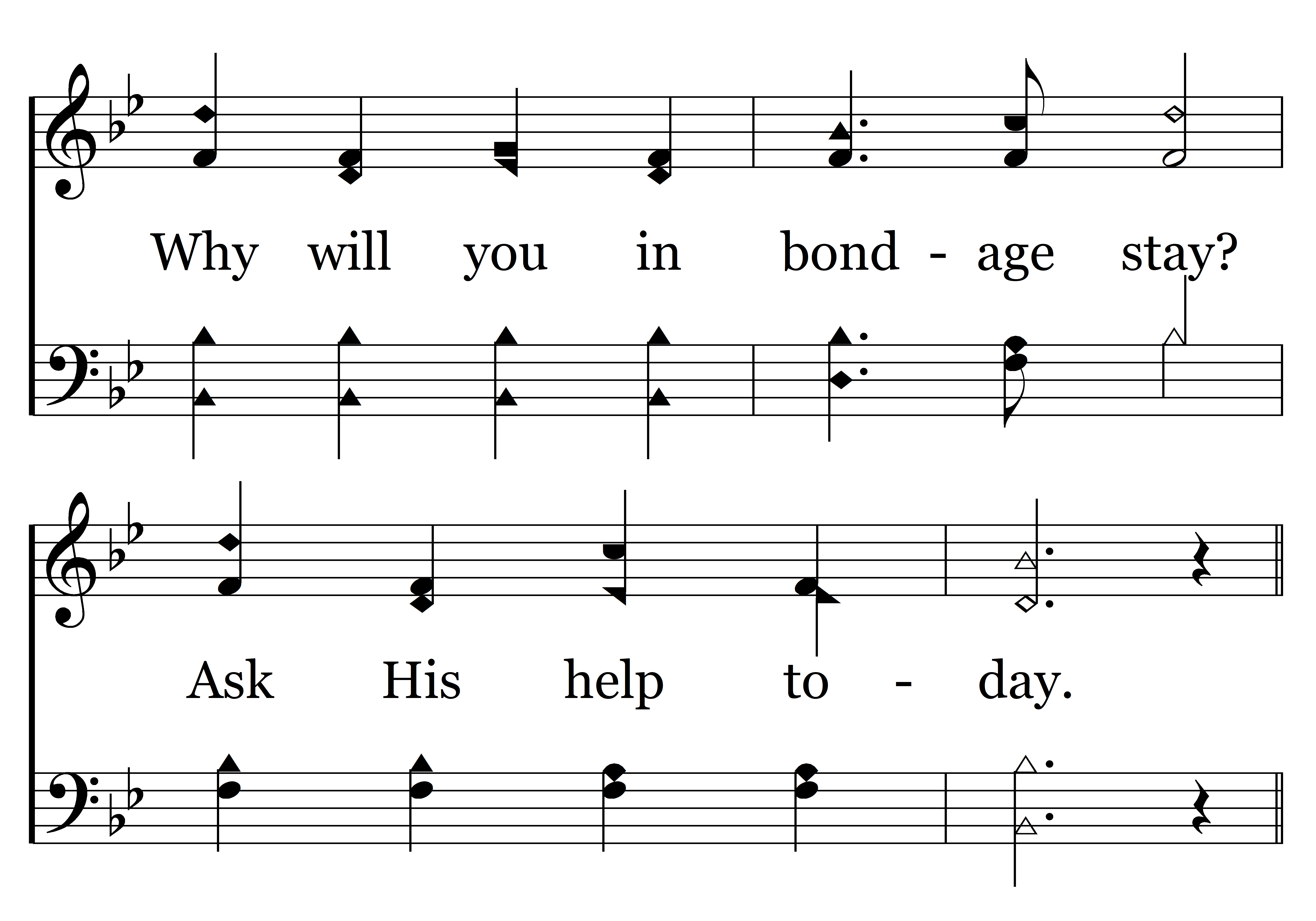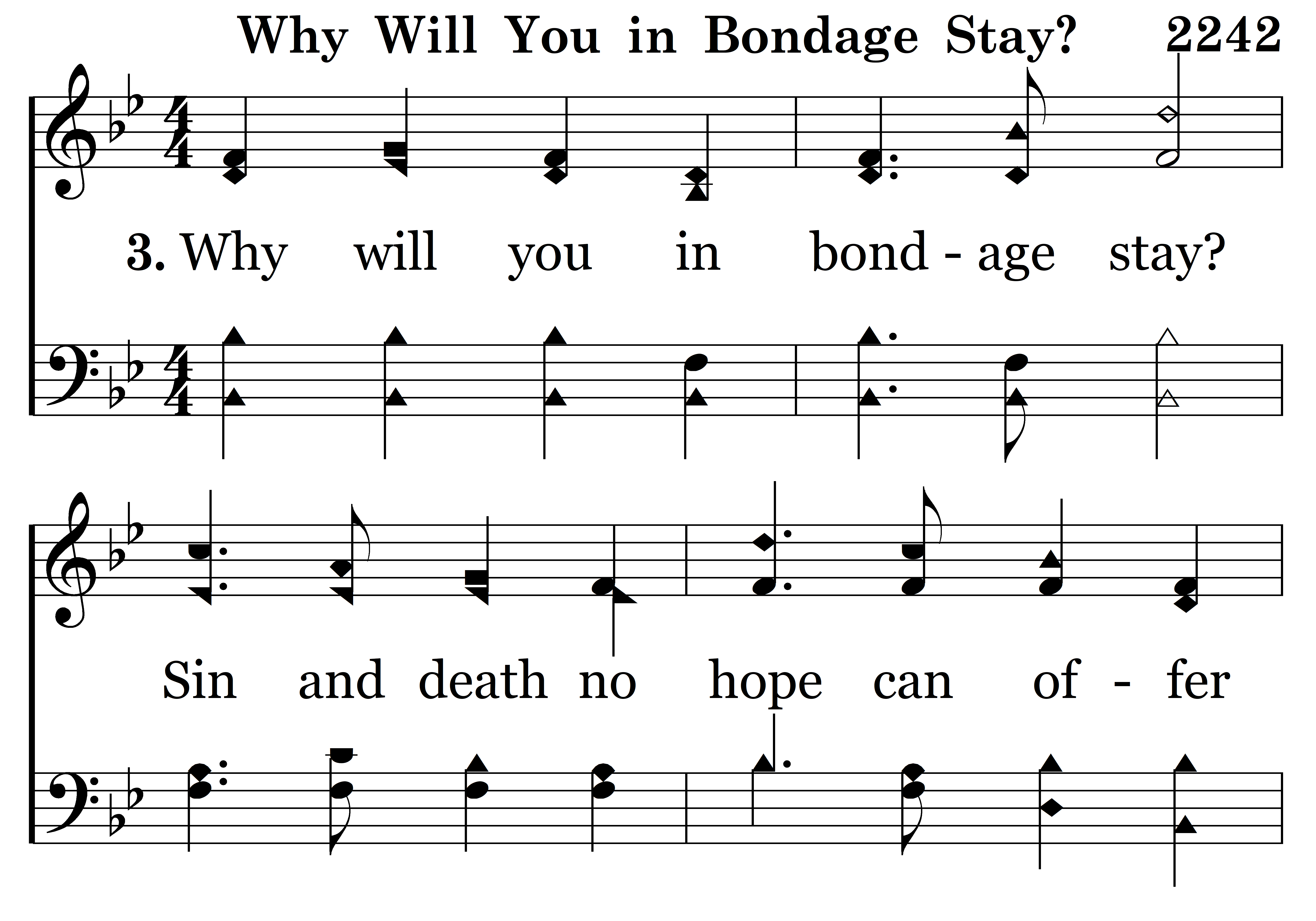 Why will you in bondage stay? Sin and death no hope can offer Of a brighter, better day, Why to evil bow? Prison doors are opened wide, By the Savior crucified, Richly He will you endow, Seek salvation now.