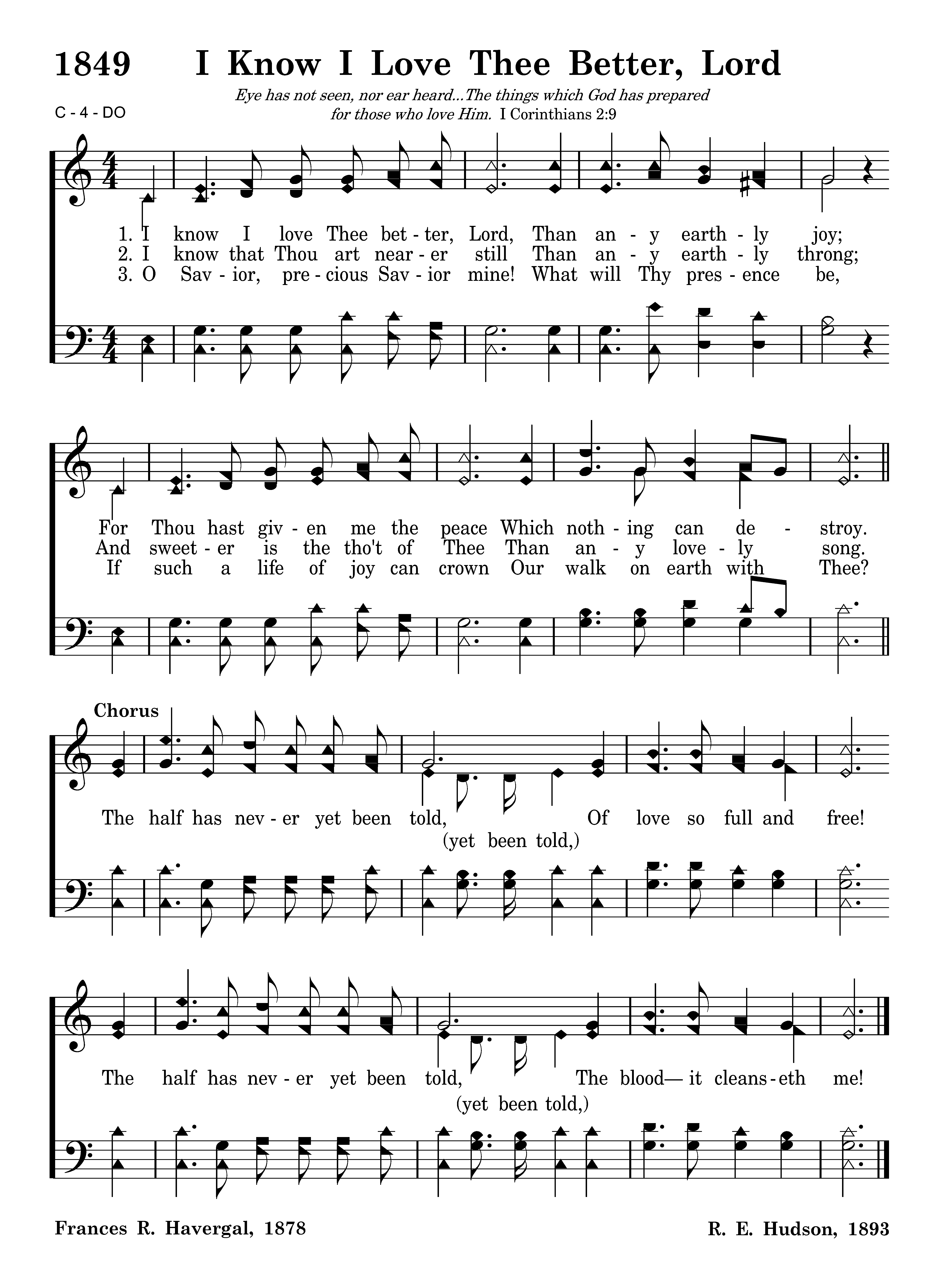 I know I love Thee better, Lord, Than any earthly joy; For Thou hast given me the peace Which nothing can destroy.