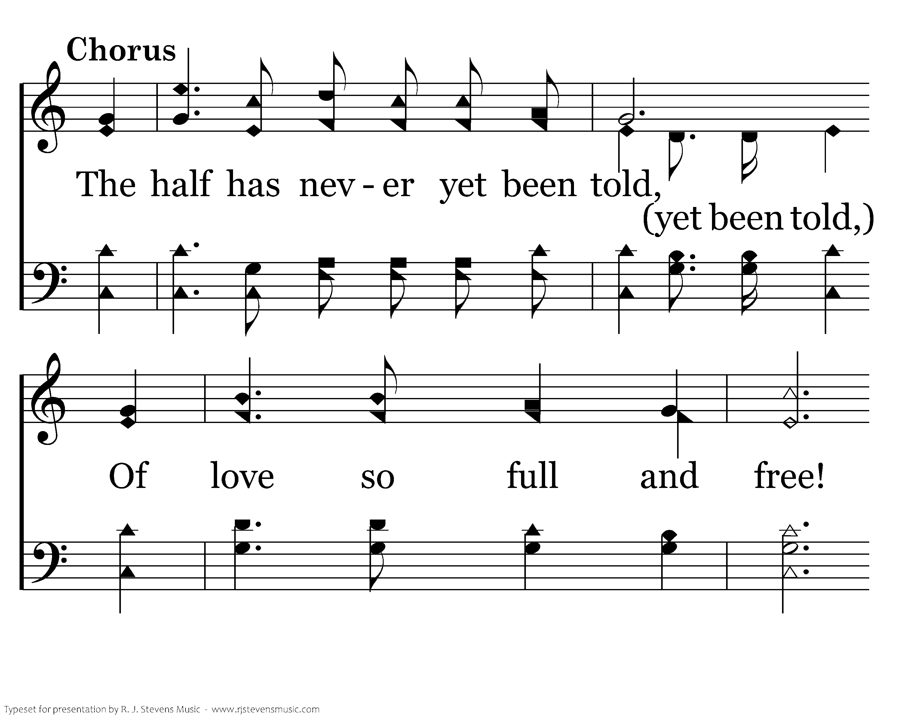 The half has never yet been told, Of love so full and free! The half has never yet been told, The blood— it cleanseth me!