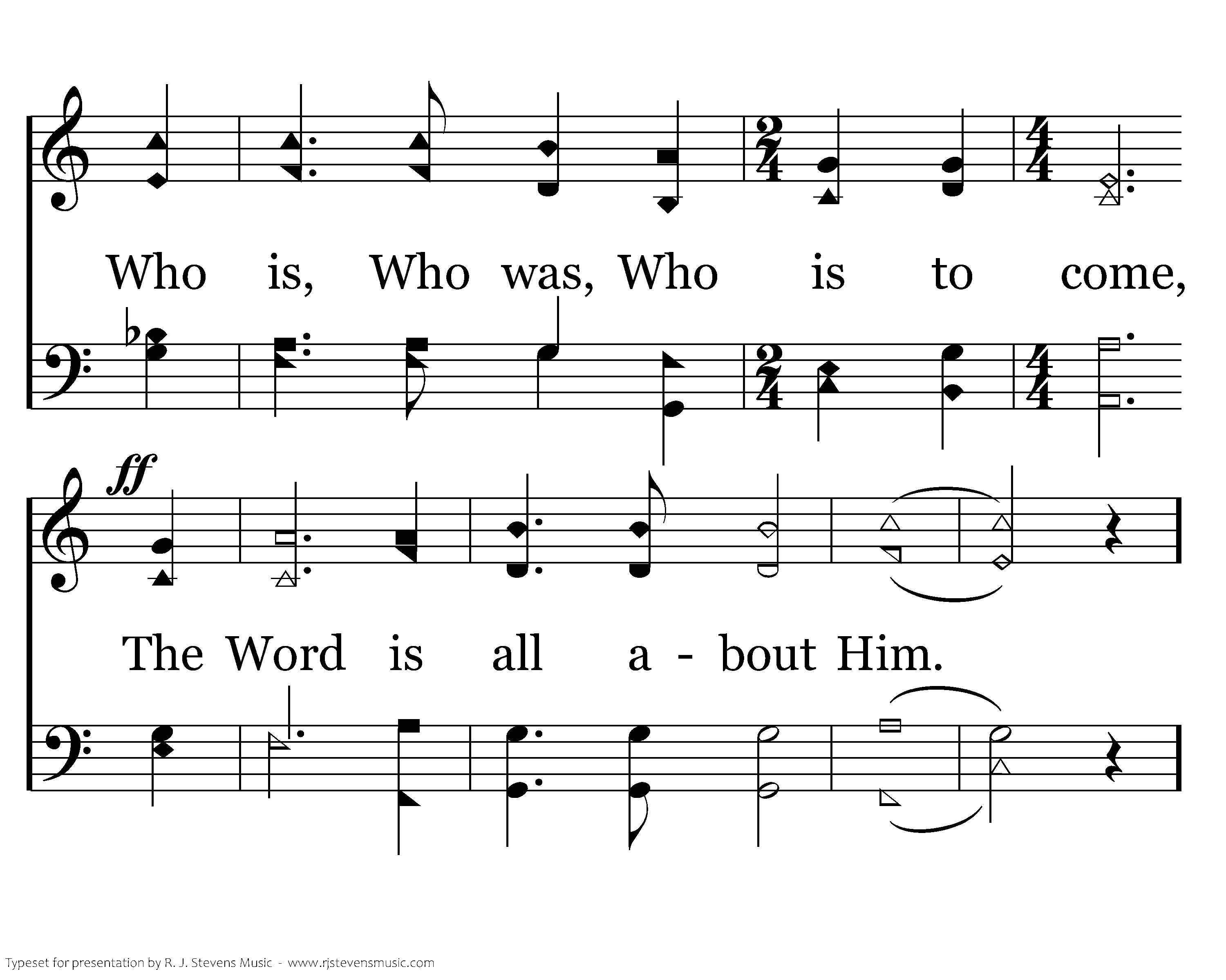 "I am Alpha and Omega, The beginning and the end." Creation through Revelation, the Word is all about Him. "I am Alpha and Omega, The Bright and morning star," The Life and Light to all men, The Word is all about Him. "I am Alpha and Omega, The Root and child of David," The King of kings and Lord of lords, The Word is all about Him. "I am Alpha and Omega The first and the last," He was, He is, and still to come, The Word is all about Him.