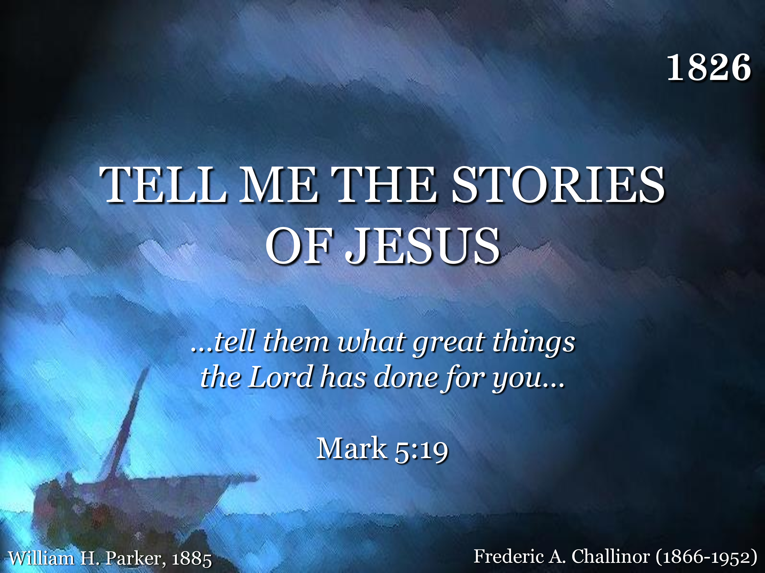 Tell me the stories of Jesus I love to hear; Things I would ask Him to tell me If He were here; Scenes by the wayside, Tales of the sea, Stories of Jesus, Tell them to me.