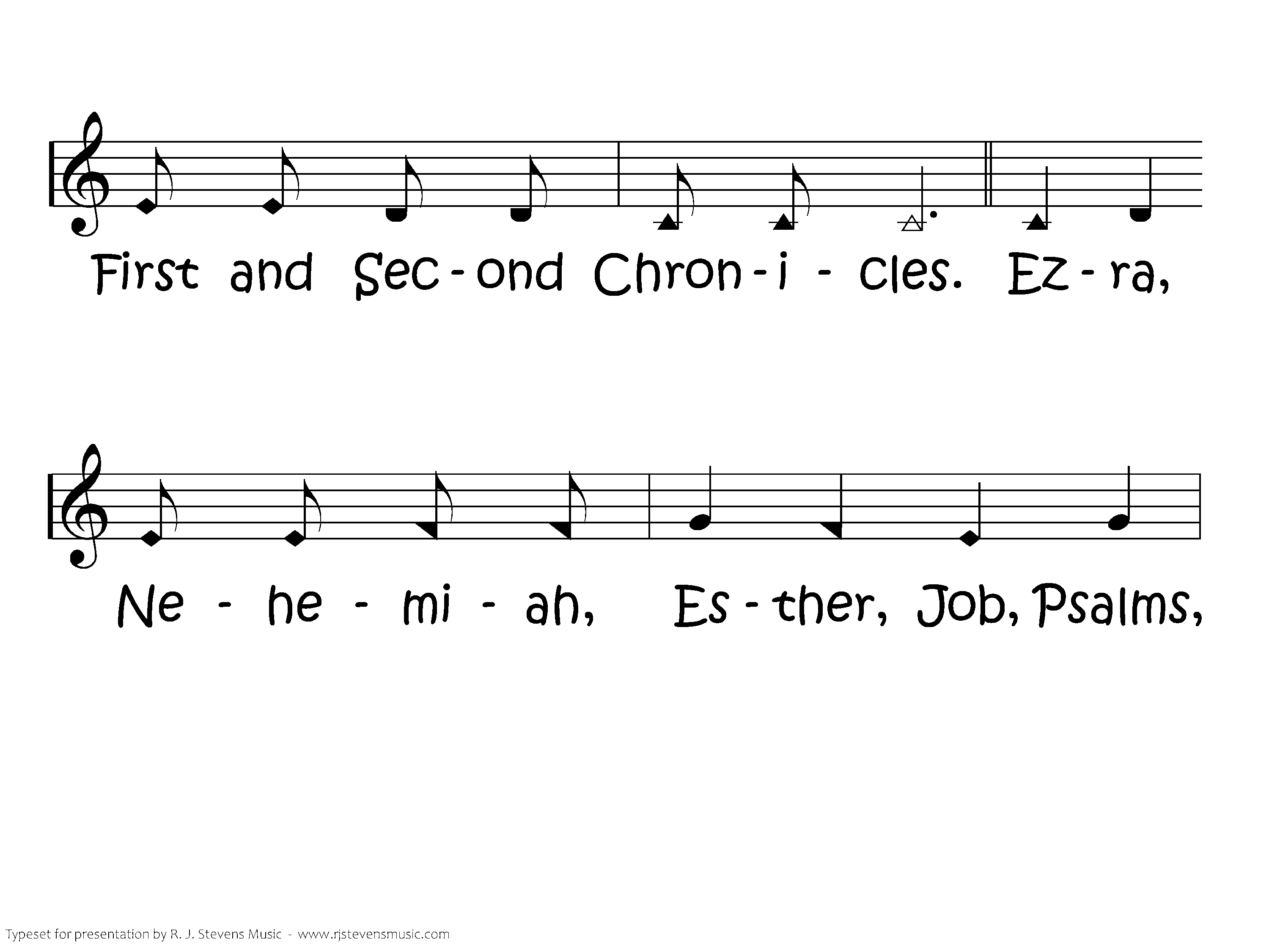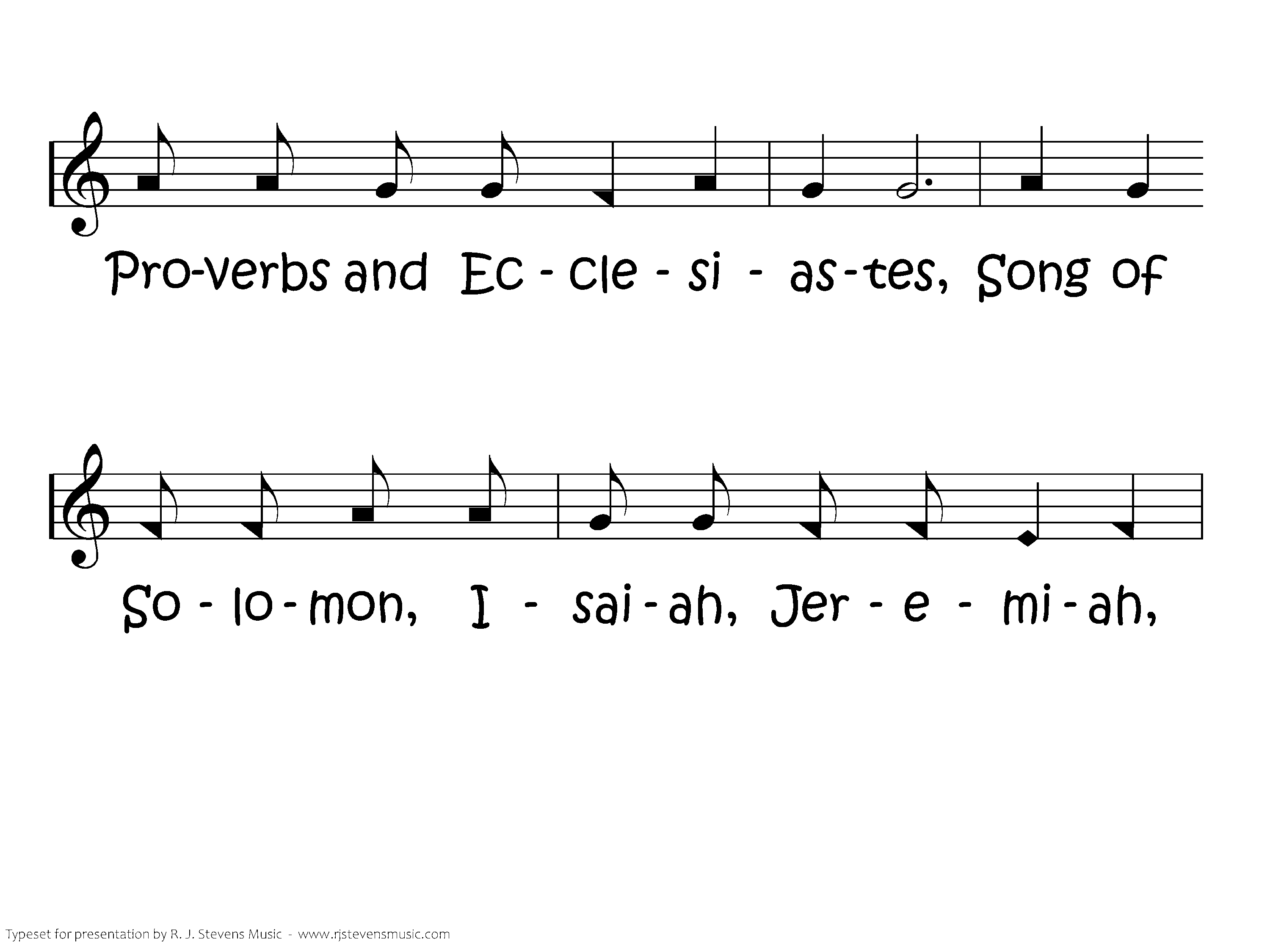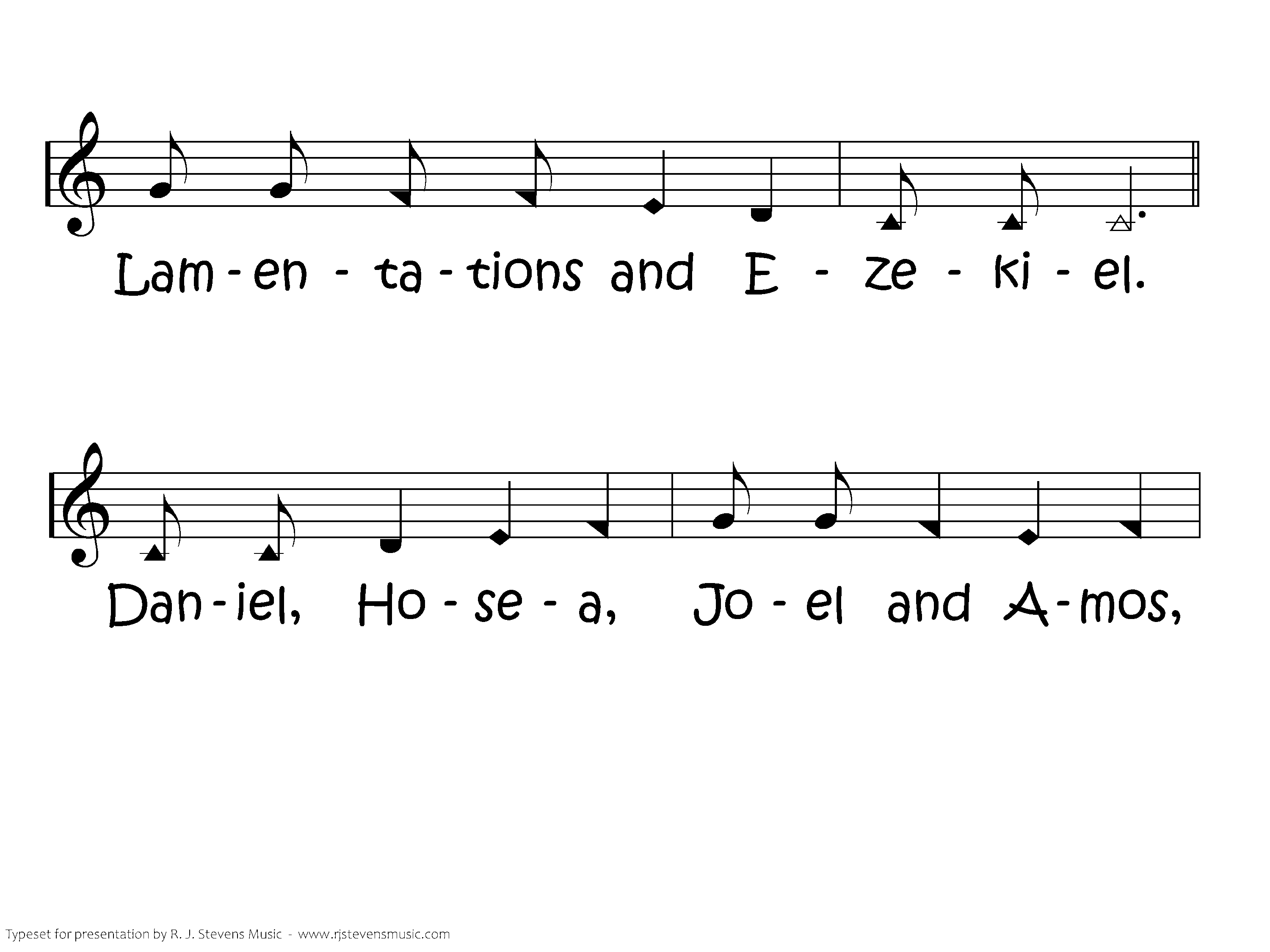 Genesis, Exodus, Leviticus, Numbers, Deuteronomy and Joshuah, Judges, Ruth, First and Second Samuel, First and Second Kings and First and Second Chronicles. Ezra, Nehemiah, Esther, Job, Psalms, Proverbs and Ecclesiastes, Song of Solomon, Isaiah, Jeremiah, Lamentations and Ezekiel. Daniel, Hosea, Joel and Amos, Obadiah, Jonah, Micah, Nahhum, then Habakuk, Zephaniah, Haggia, Zechariah, Malachi.