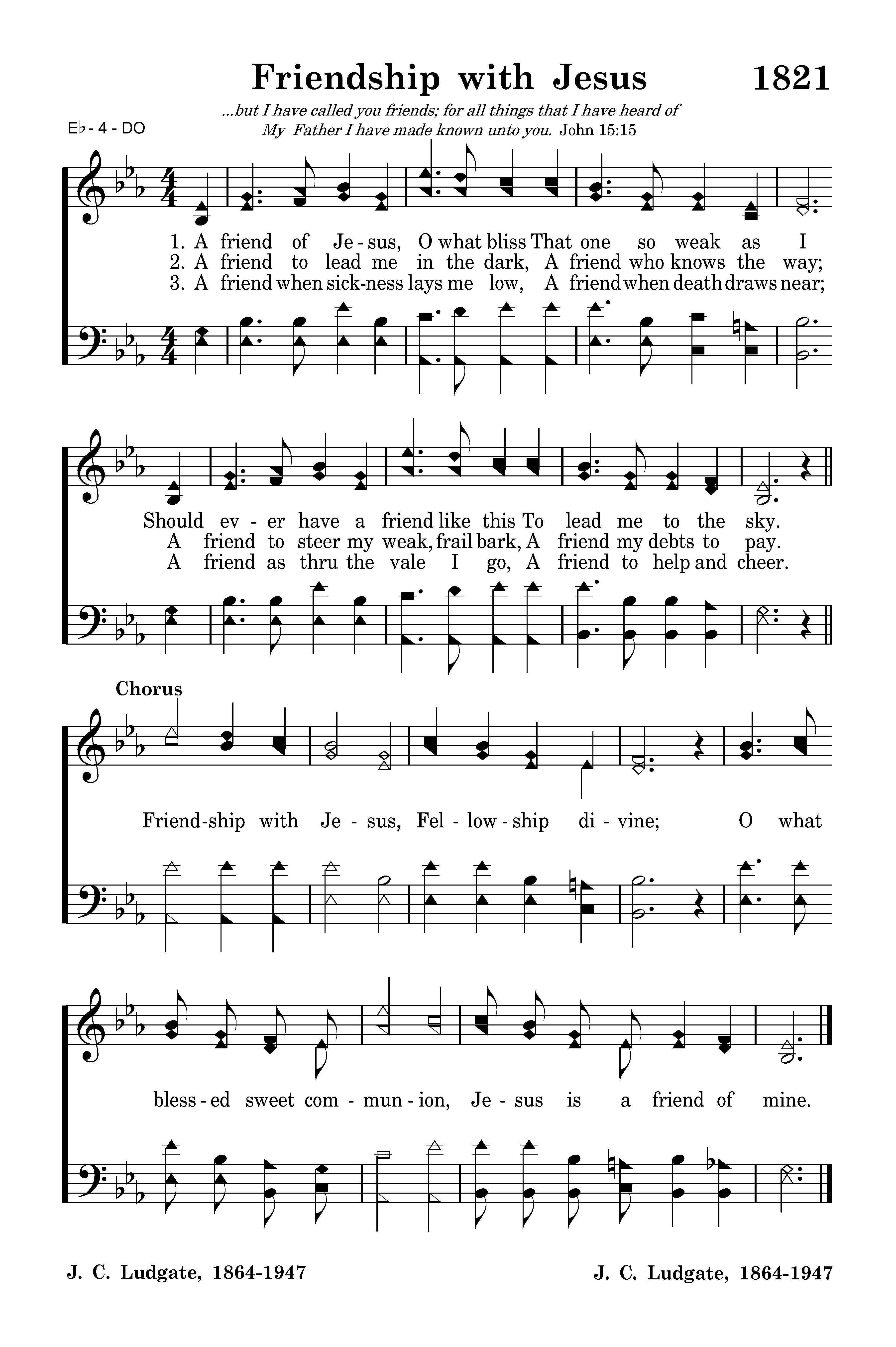 Friendship with Jesus, Fellowship divine; O what blessed sweet communion, Jesus is a friend of mine.