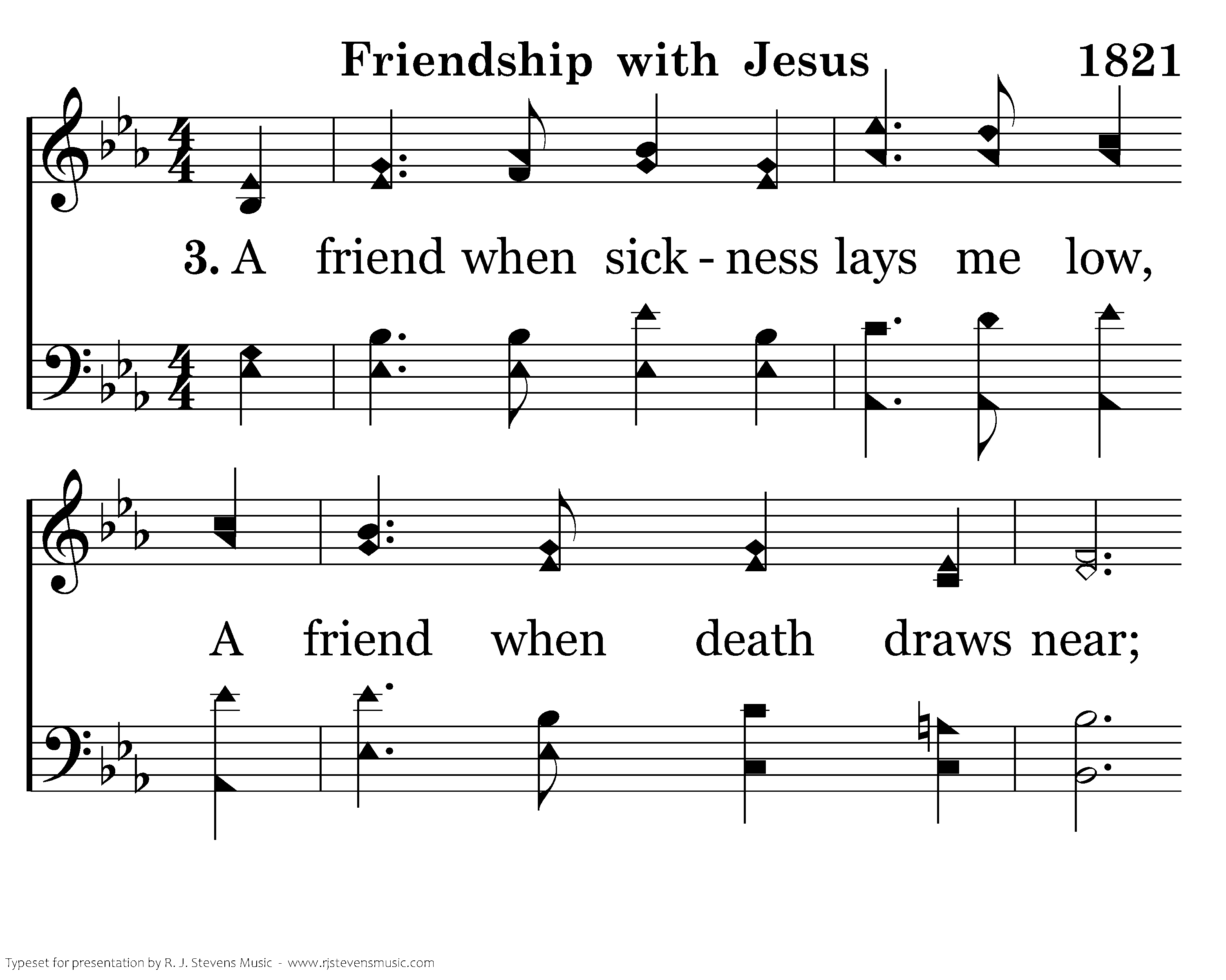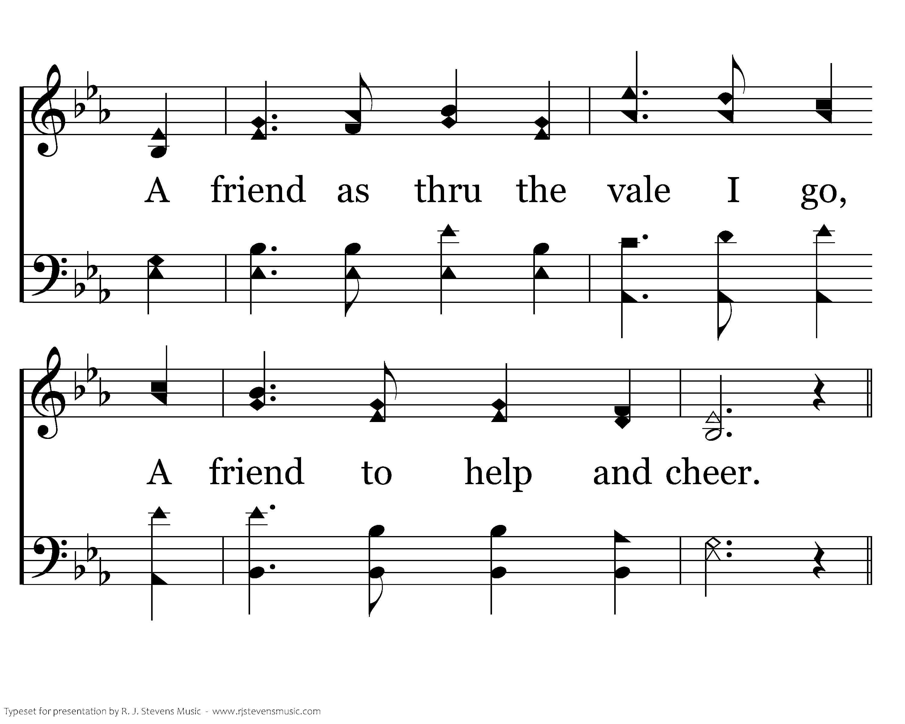 A friend when sickness lays me low, A friend when death draws near; A friend as thru the vale I go, A friend to help and cheer.