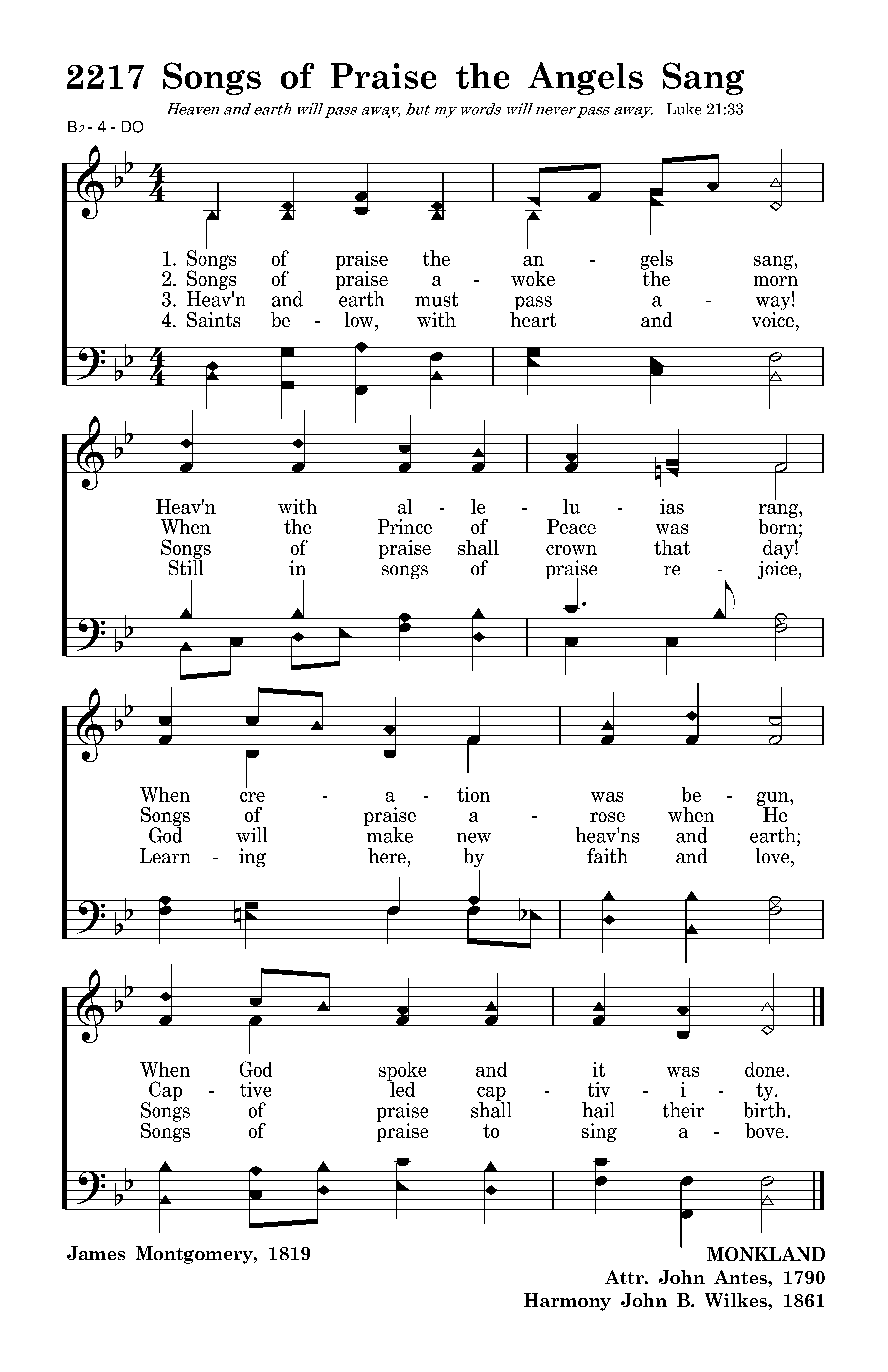 Songs of praise the angels sang, Heav'n with alleluias rang, When creation was begun, When God spoke and it was done.