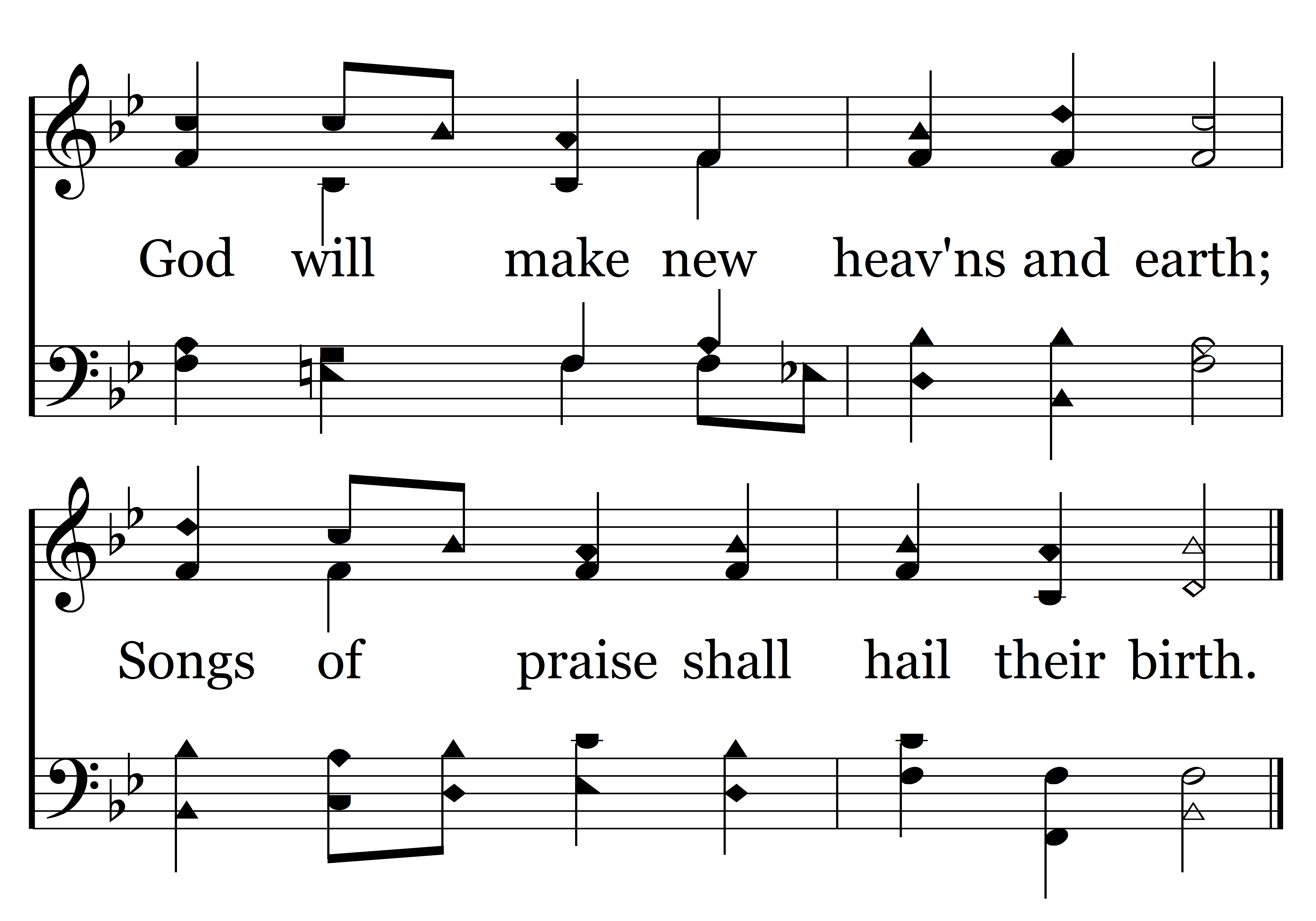 Heav'n and earth must pass away! Songs of praise shall crown that day! God will make new heav'ns and earth; Songs of praise shall hail their birth.