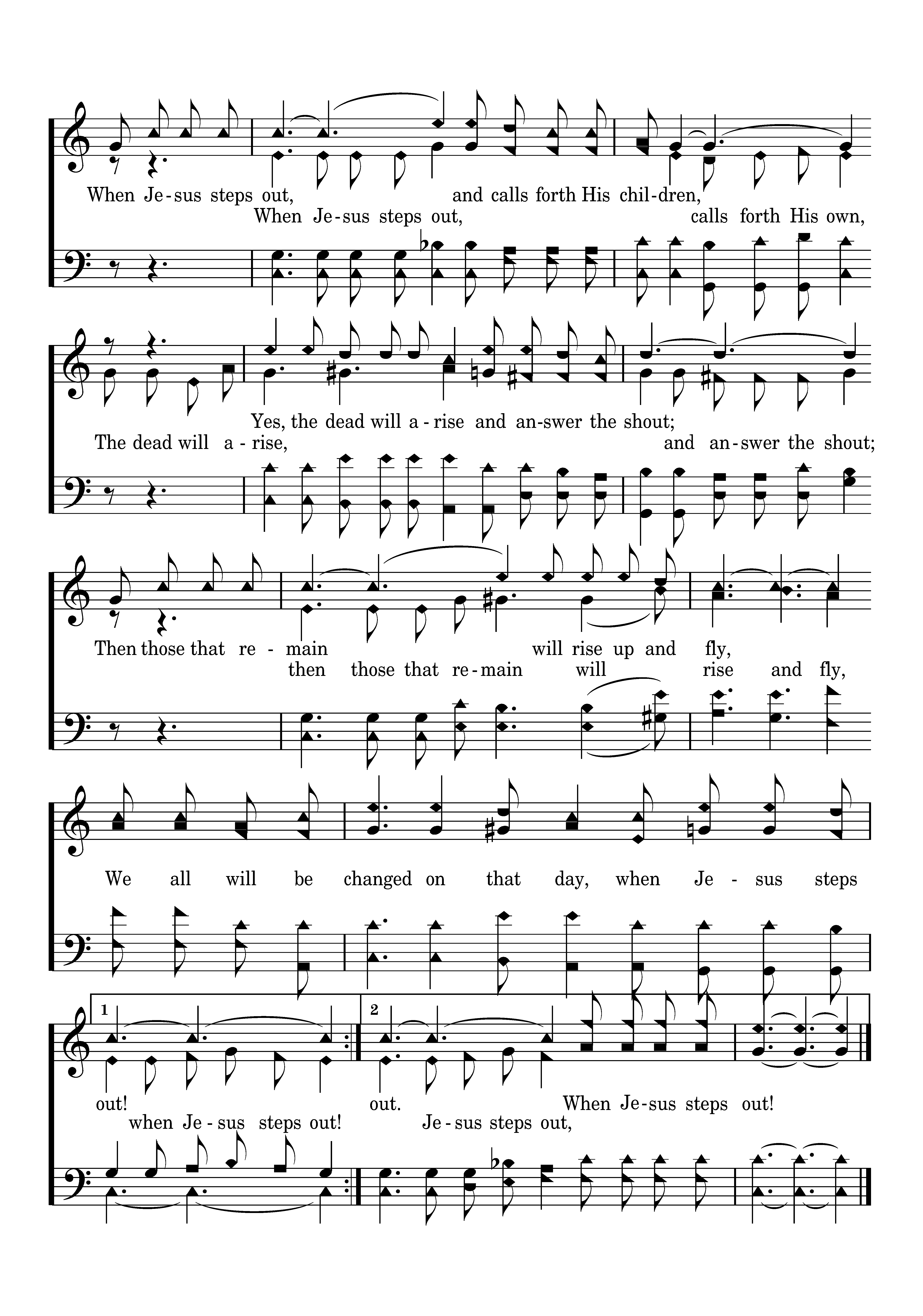 When Jesus steps out, calls forth His own, The dead will arise, and answer the shout; then those that remain will rise and fly, when Jesus steps out! Jesus steps out,