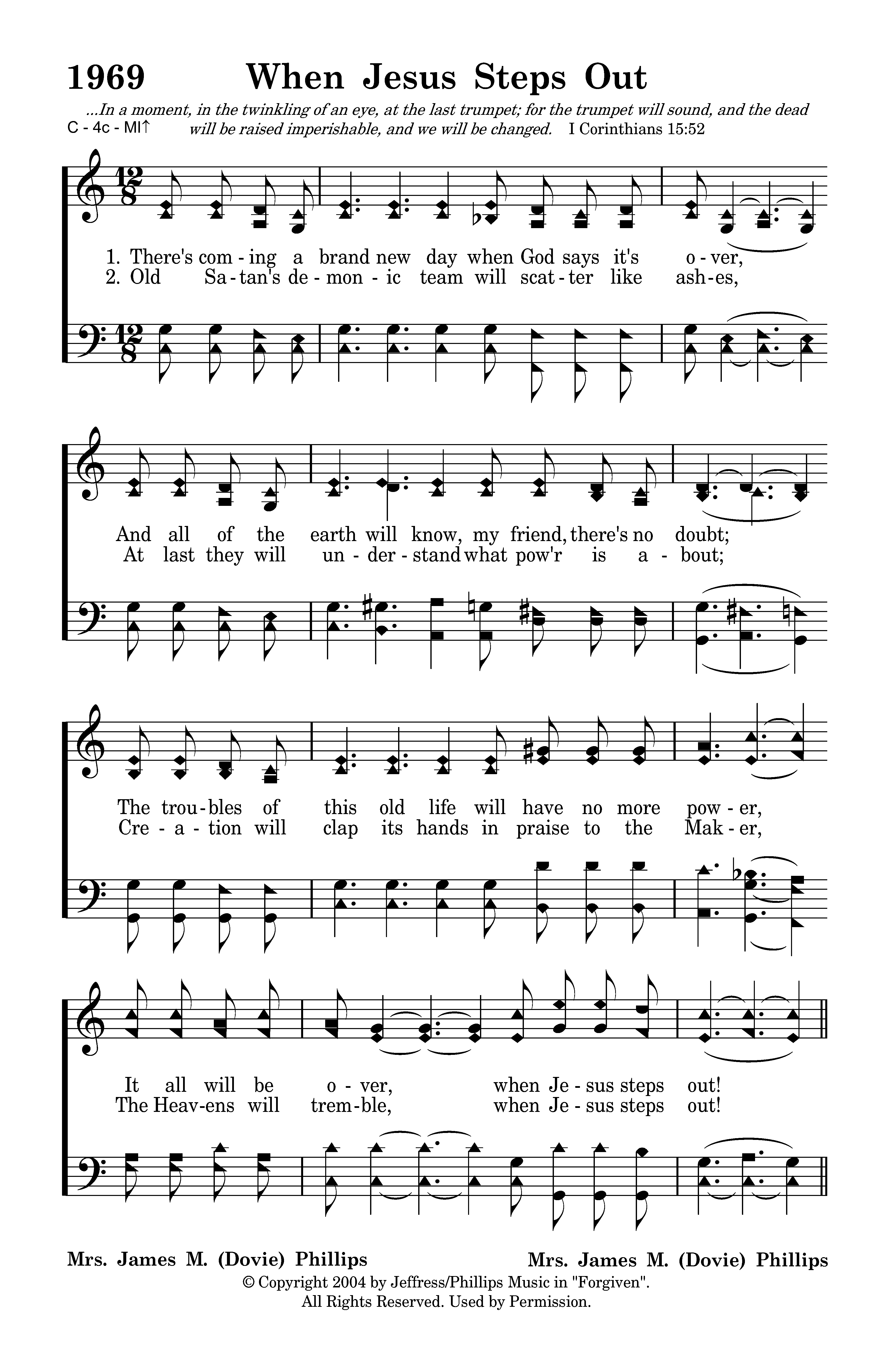 Old Satan's demonic team will scatter like ashes, At last they will understand what pow'r is about; Creation will clap its hands in praise to the Maker, The Heavens will tremble, when Jesus steps out! When Jesus steps out, and calls forth His children, Yes, the dead will arise and answer the shout; Then those that remain will rise up and fly, We all will be changed on that day, when Jesus steps out! out. When Jesus steps out!