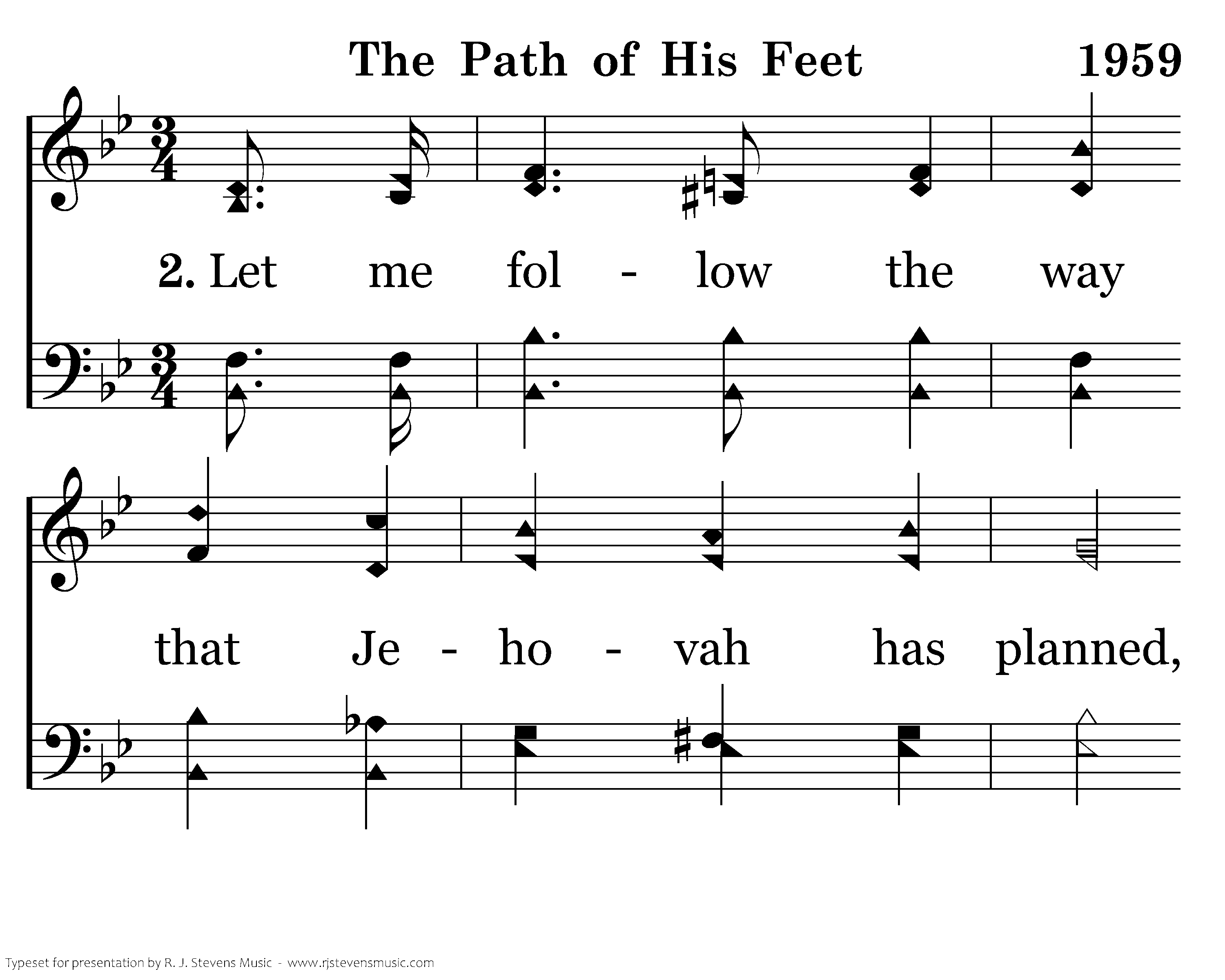Let me follow the way that Jehovah has planned, Let me do as the scriptures record; Let me trust ev‘ry promise, obey each command, That Jehovah revealed by our Lord. Some ways may be broad and the gates may be wide, My heart may be free from all cares; The way seems to please as we travel with ease But the prints of His feet are not there.