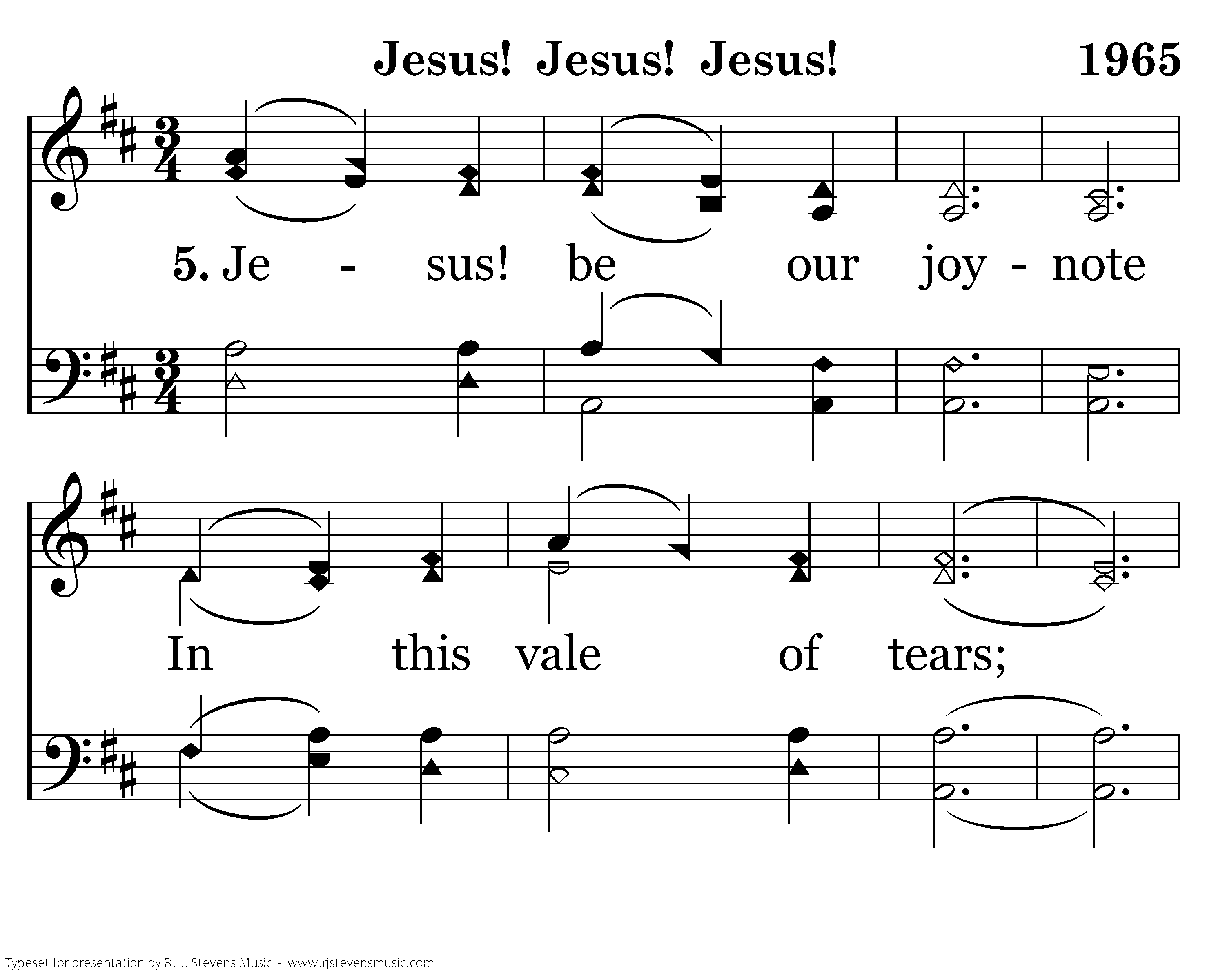 Jesus! be our joynote In this vale of tears; Till we reach the homeland, And th'eternal years.