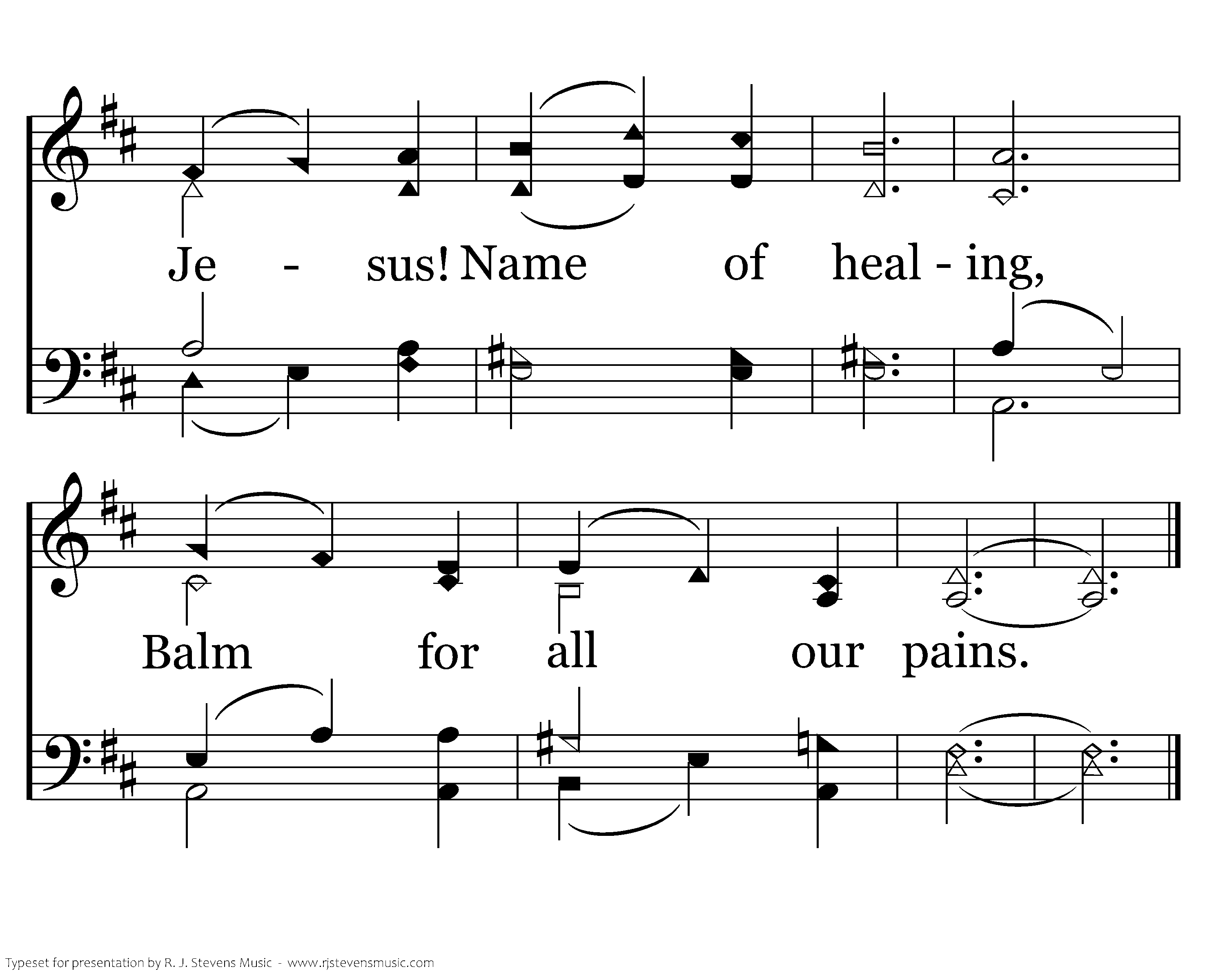 Jesus! Name of cleansing, Washing all our stains; Jesus! Name of healing, Balm for all our pains.