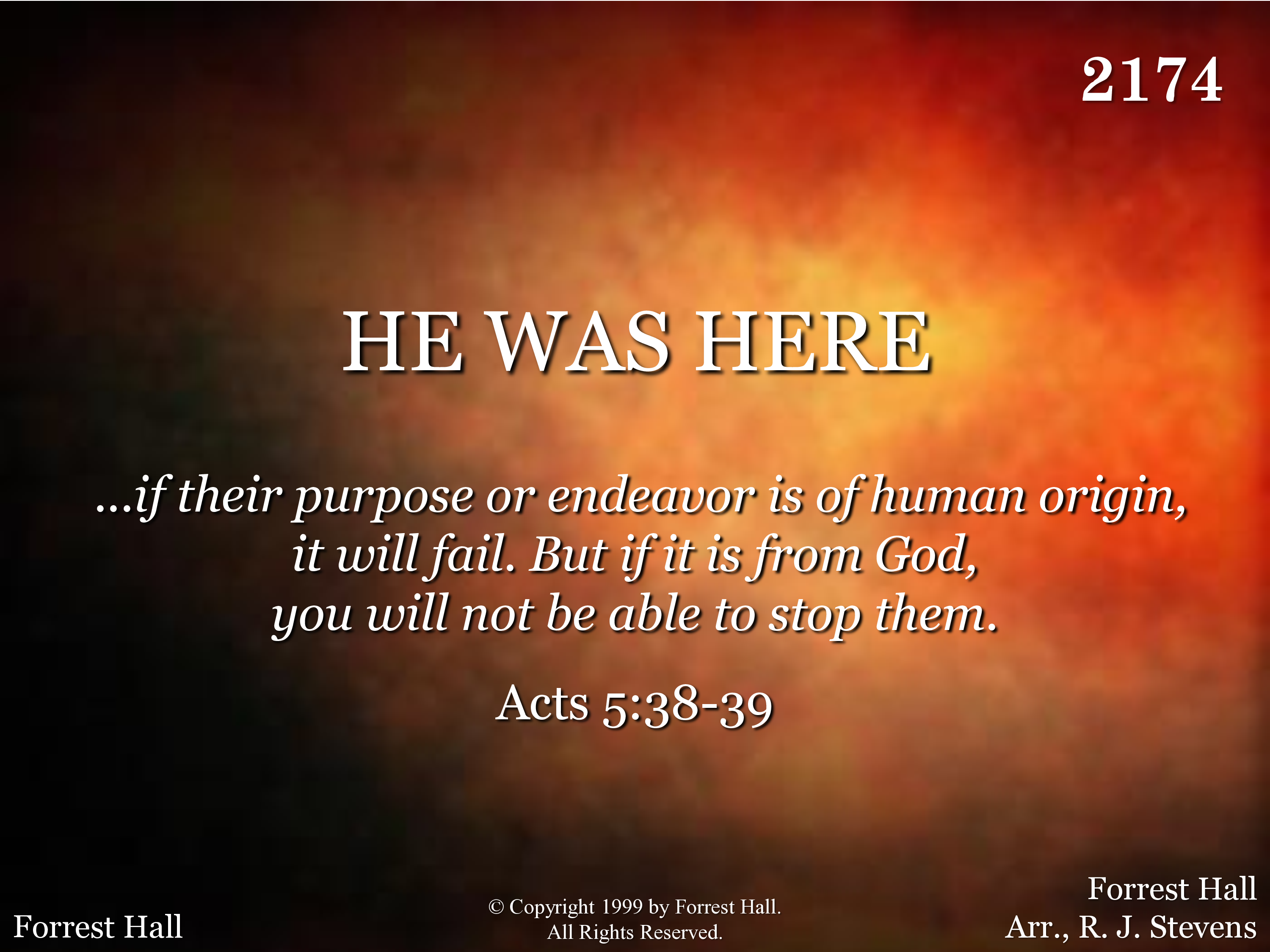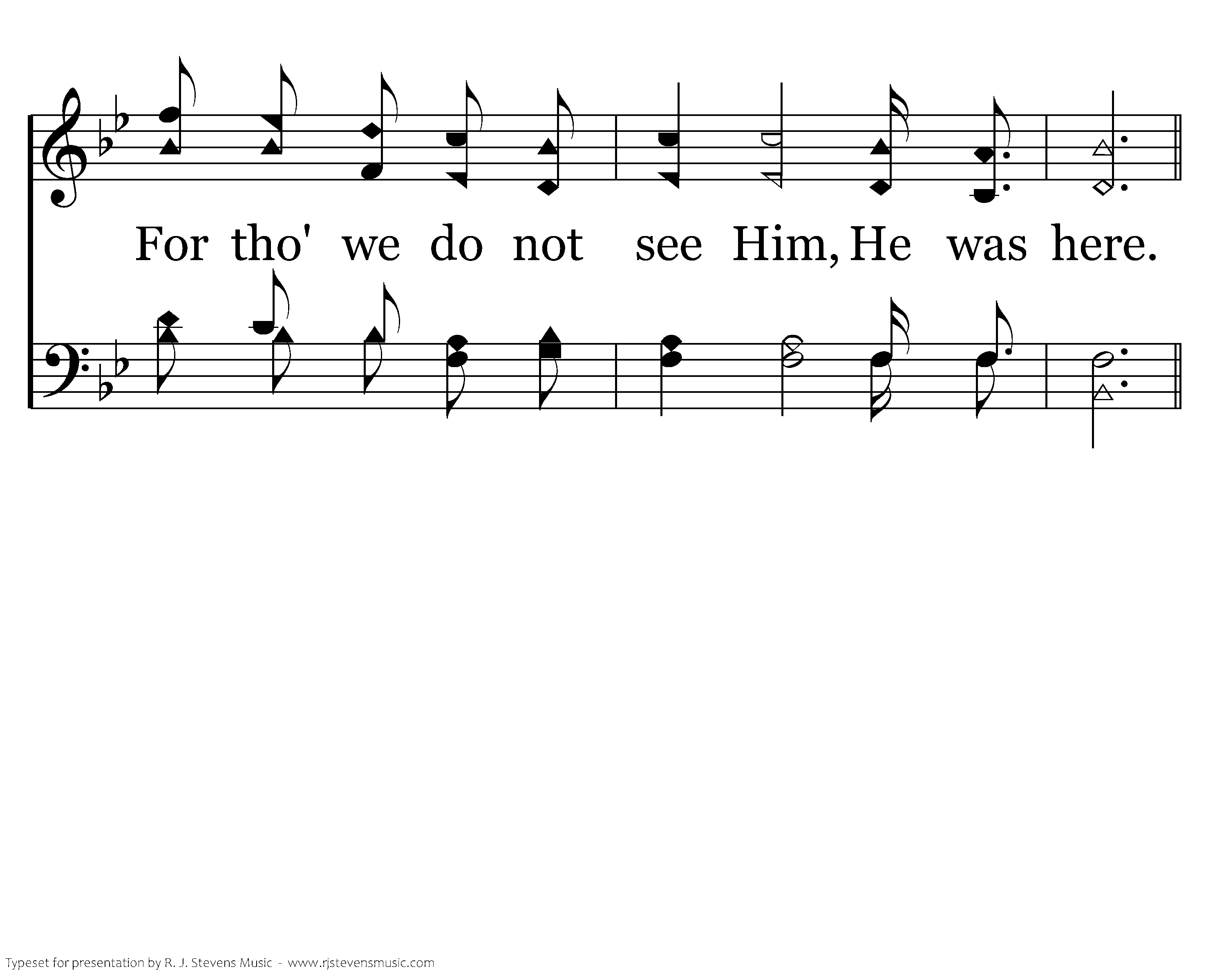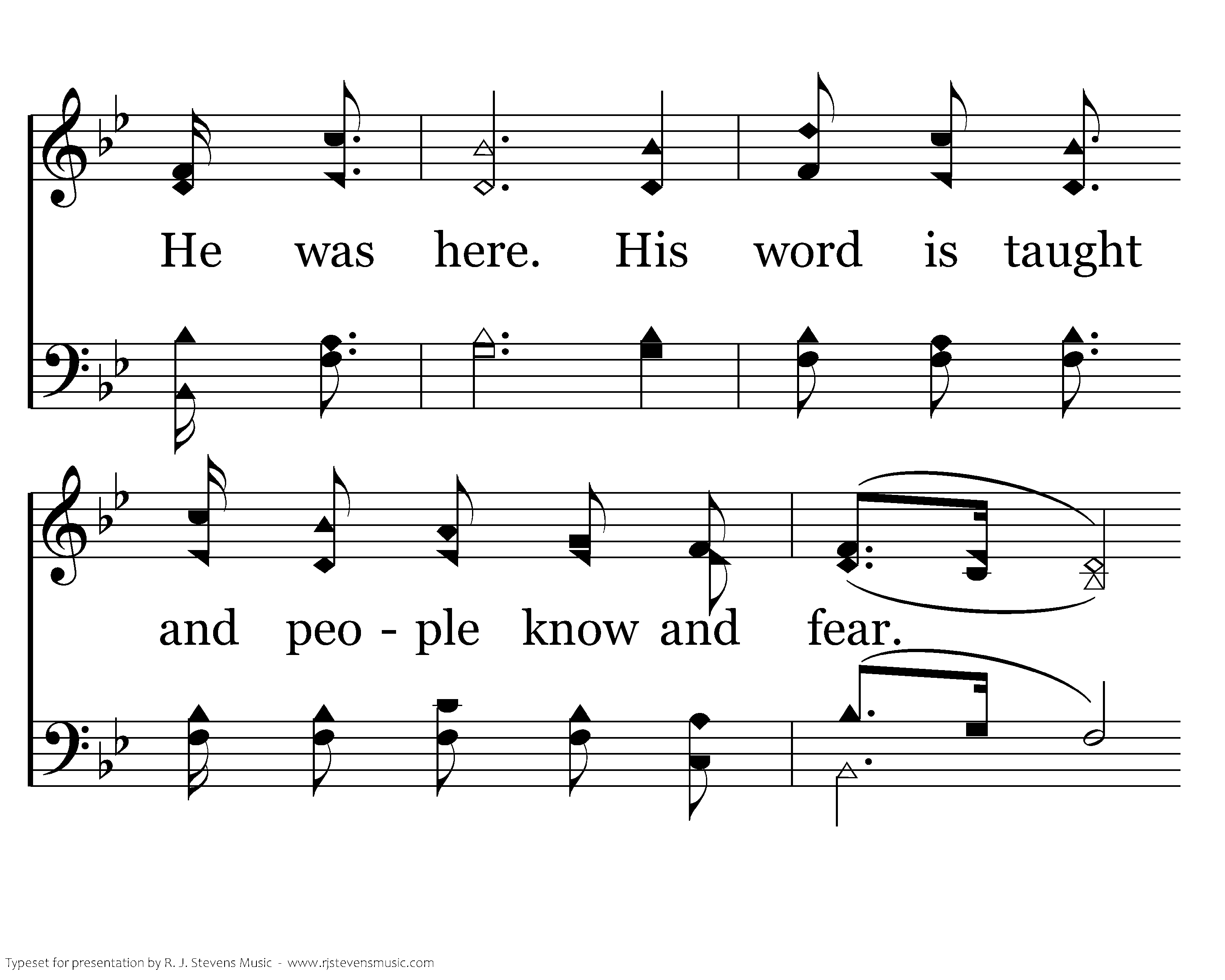 He was here. The stories live of how He loves and cares. He was here. His word is taught and people know and fear. To Him they pray, they teach His way, they know He'll come some day. For tho' we do not feel Him, He was here. He was here. He was here. His evidence is clear. He is near. In joy we shed a tear. He was here. His love will make aware. He was here.