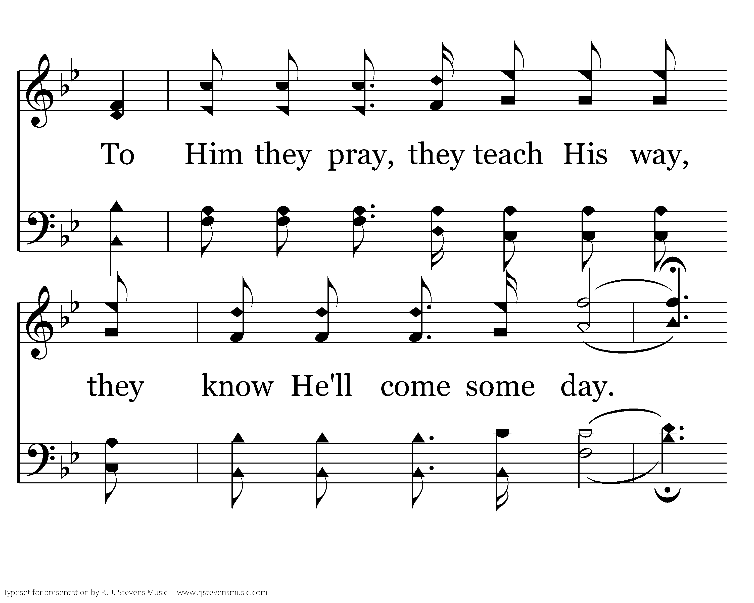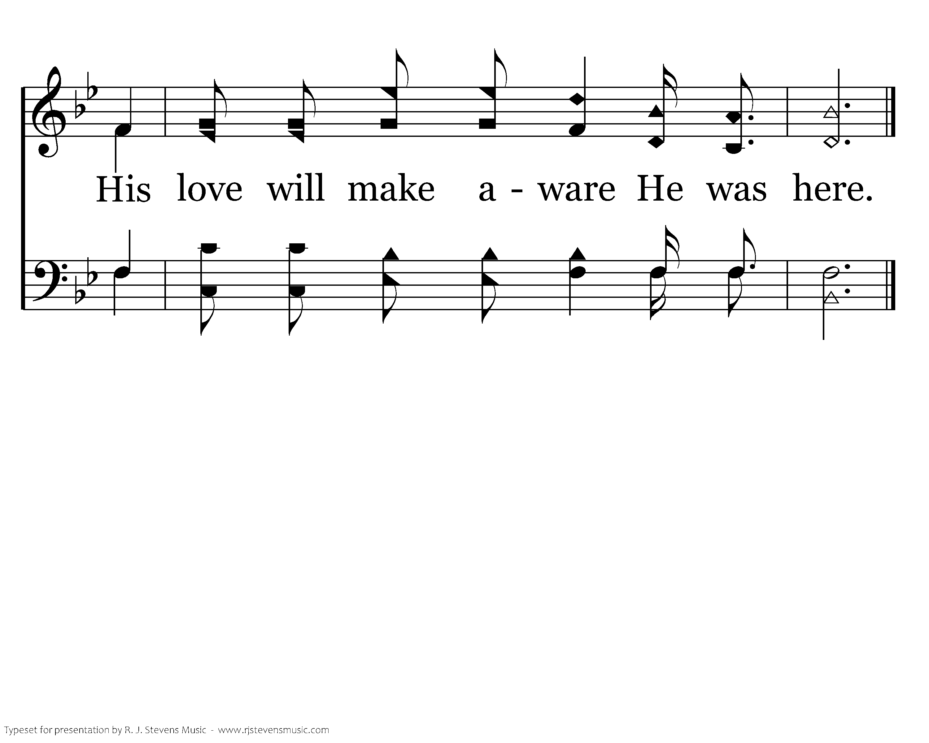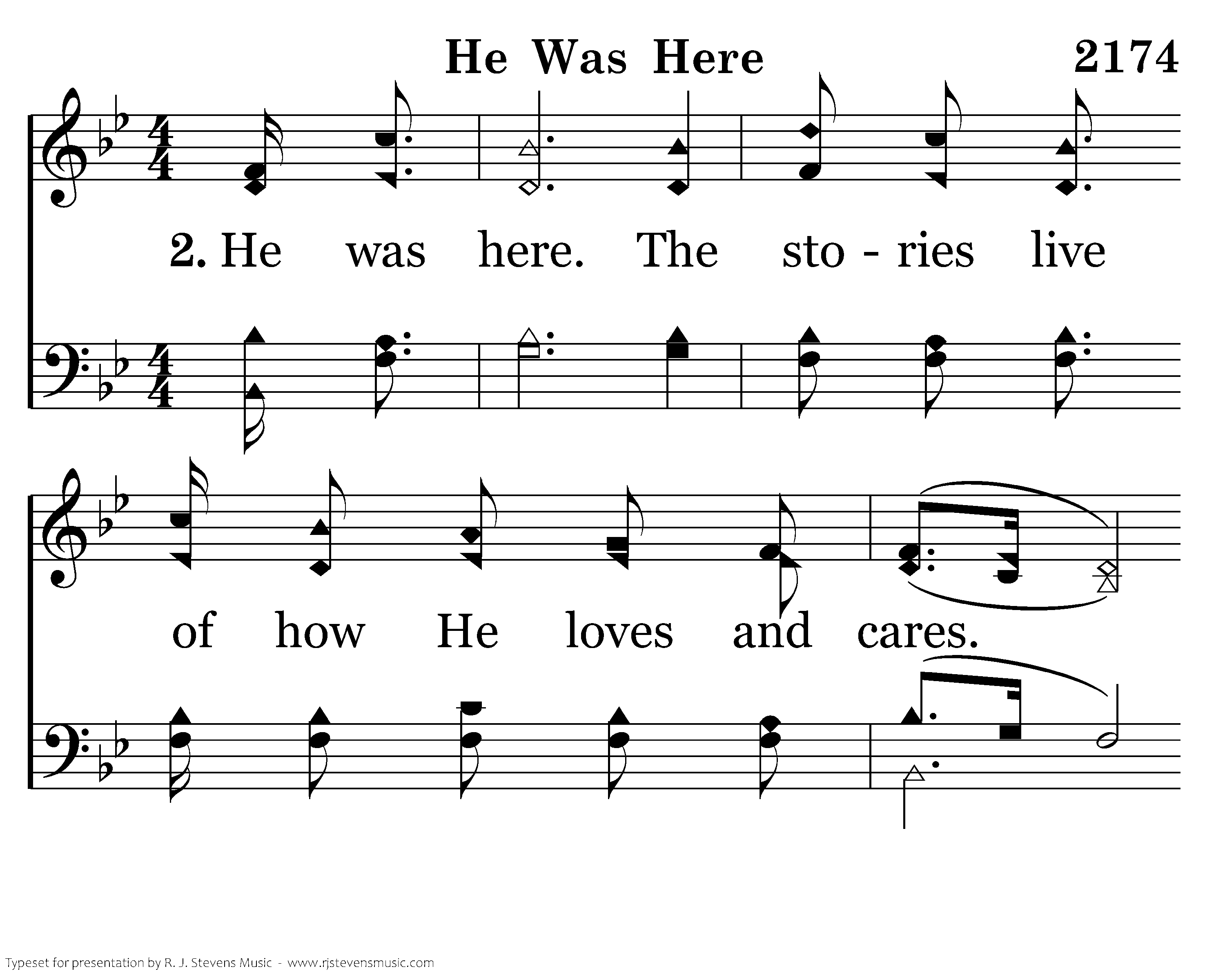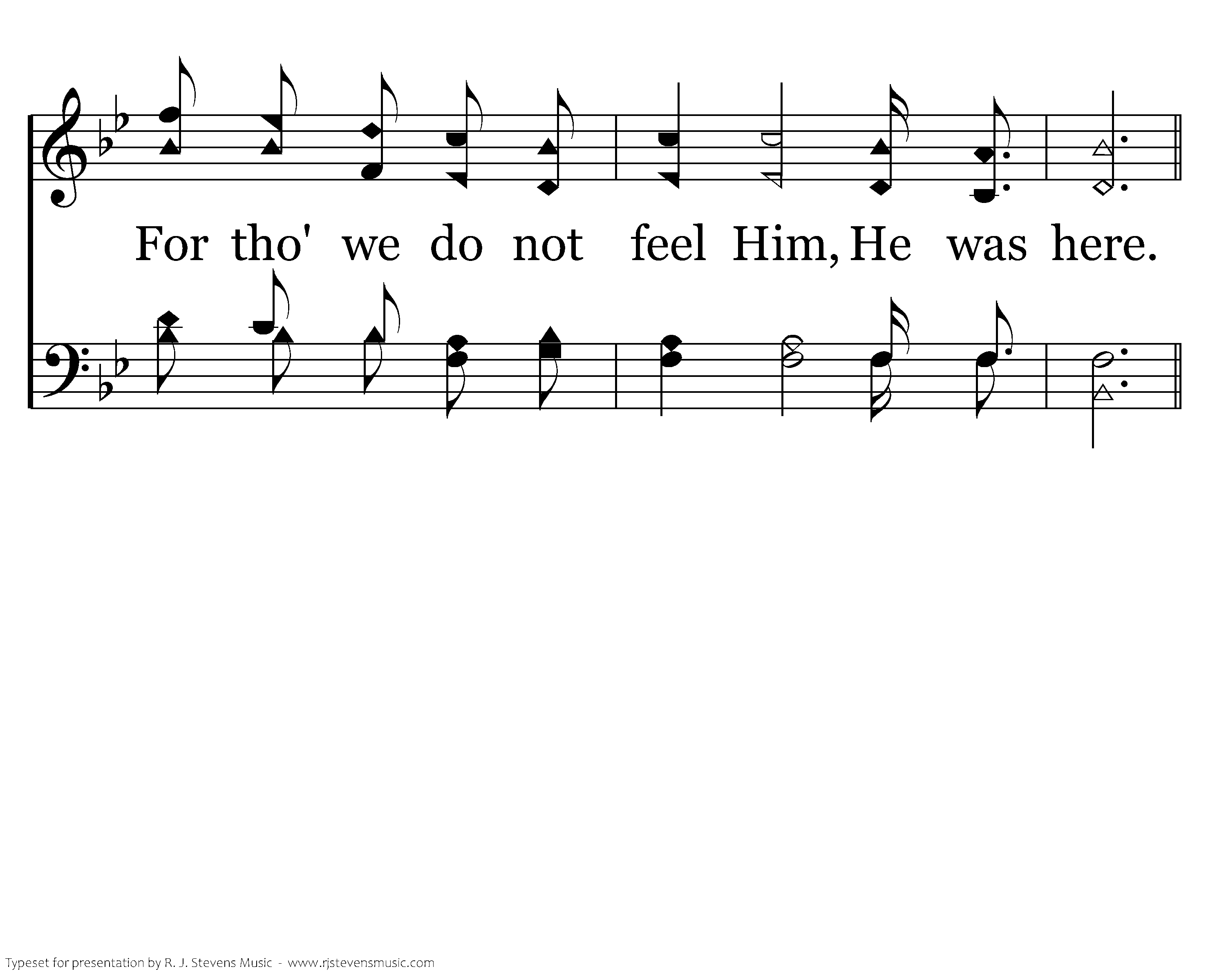 He was here. The stories live of how He loves and cares. He was here. His word is taught and people know and fear. To Him they pray, they teach His way, they know He'll come some day. For tho' we do not feel Him, He was here. He was here. He was here. His evidence is clear. He is near. In joy we shed a tear. He was here. His love will make aware. He was here.