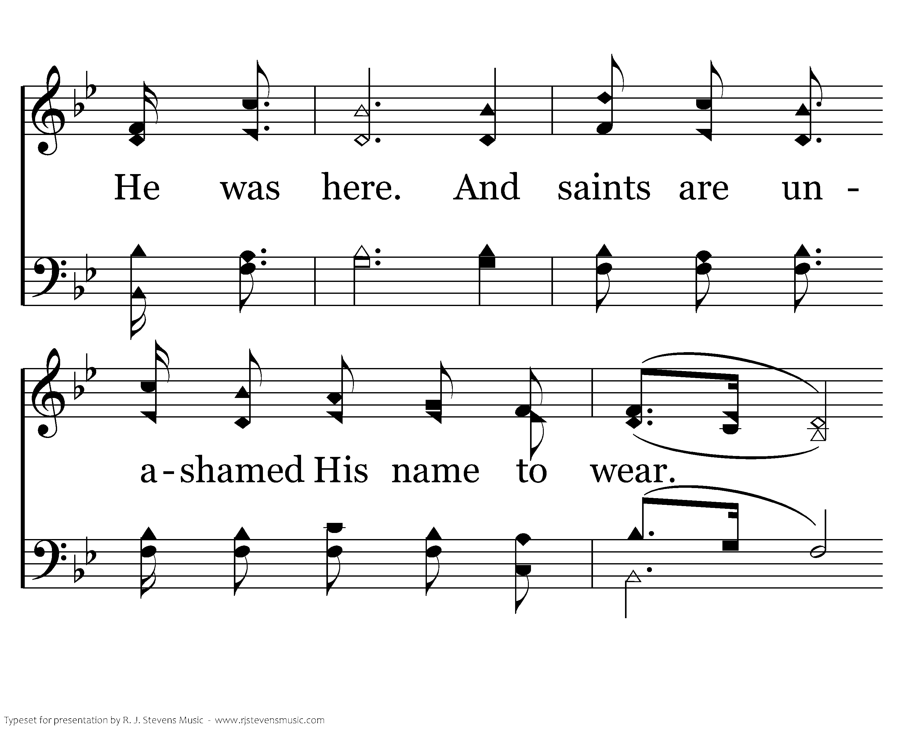 He was here. The saints are ready for their cross they'll bear. He was here. And saints are unashamed His name to wear. For Him they'll die, they know just why, for He was crucified. For tho' we do not hear Him, He was here. He was here. His evidence is clear. He is near. In joy we shed a tear. He was here. His love will make aware He was here, and He is here.