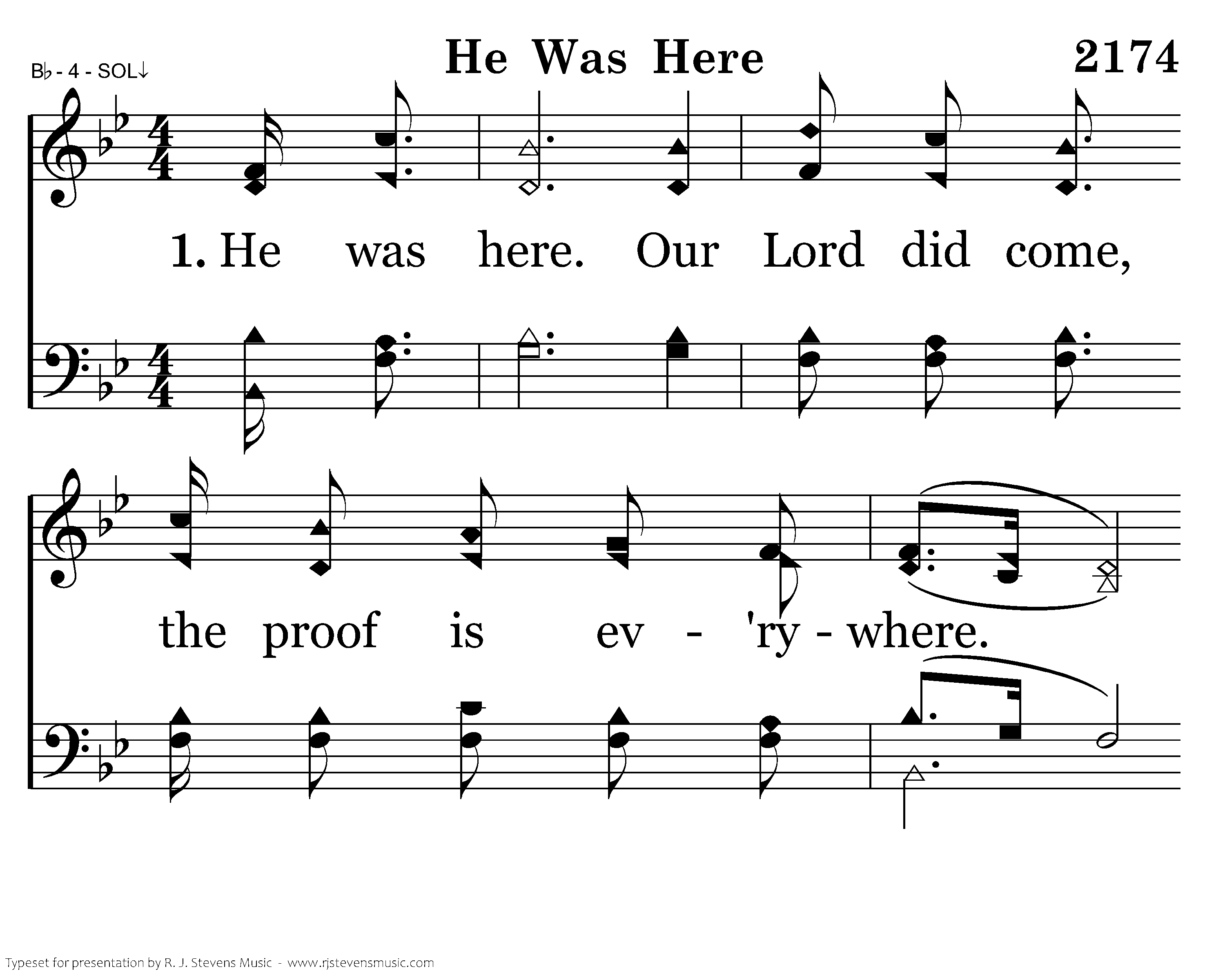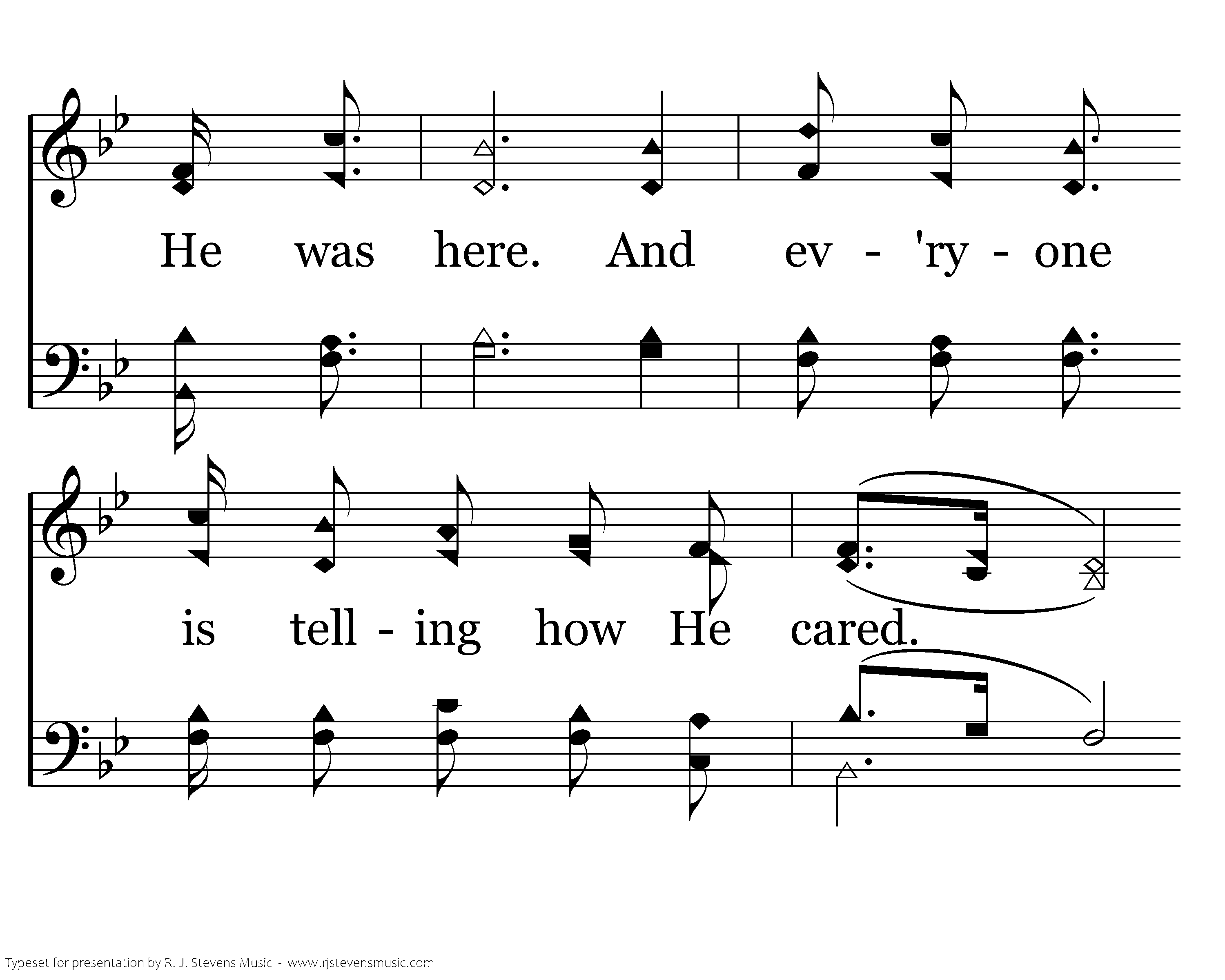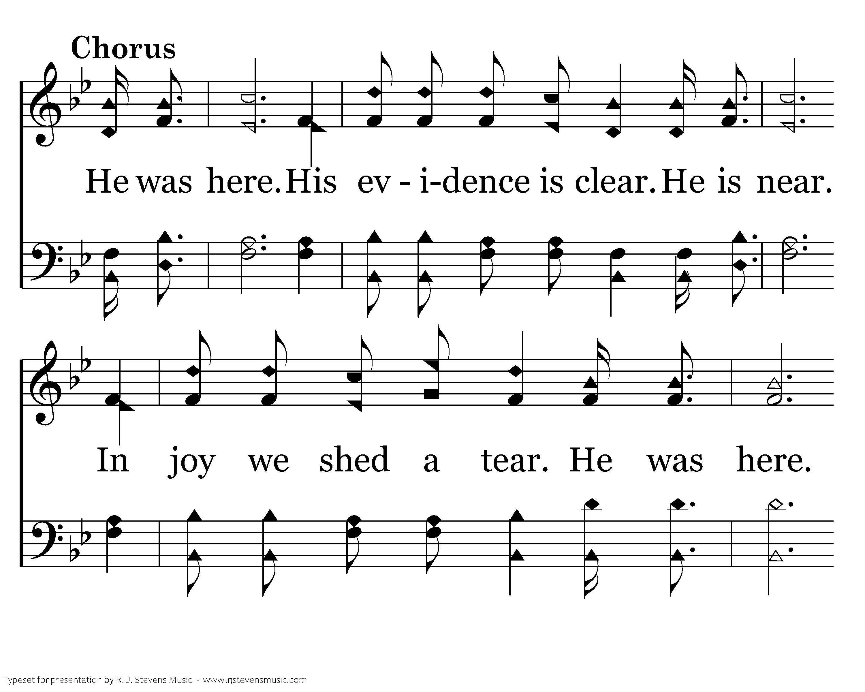 He was here. Our Lord did come, the proof is ev'rywhere. He was here. And ev'ryone is telling how He cared. They say His name, His love proclaim, somehow they know He reigns. For tho' we do not see Him, He was here. He was here. His evidence is clear. He is near. In joy we shed a tear. He was here. His love will make aware. He was here.