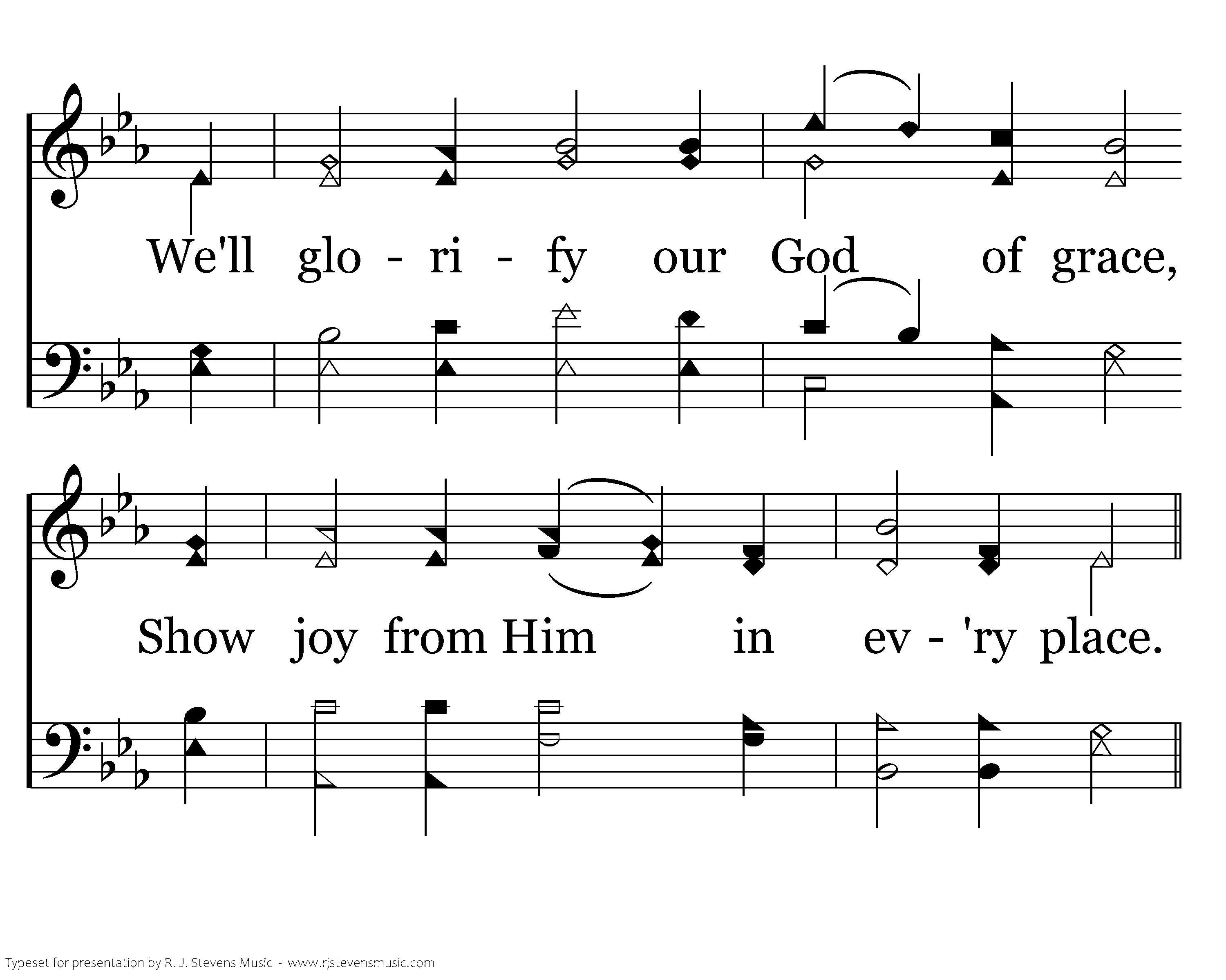 Our words of praise will honor Him And show our love for fellow men. We'll glorify our God of grace, Show joy from Him in ev'ry place.