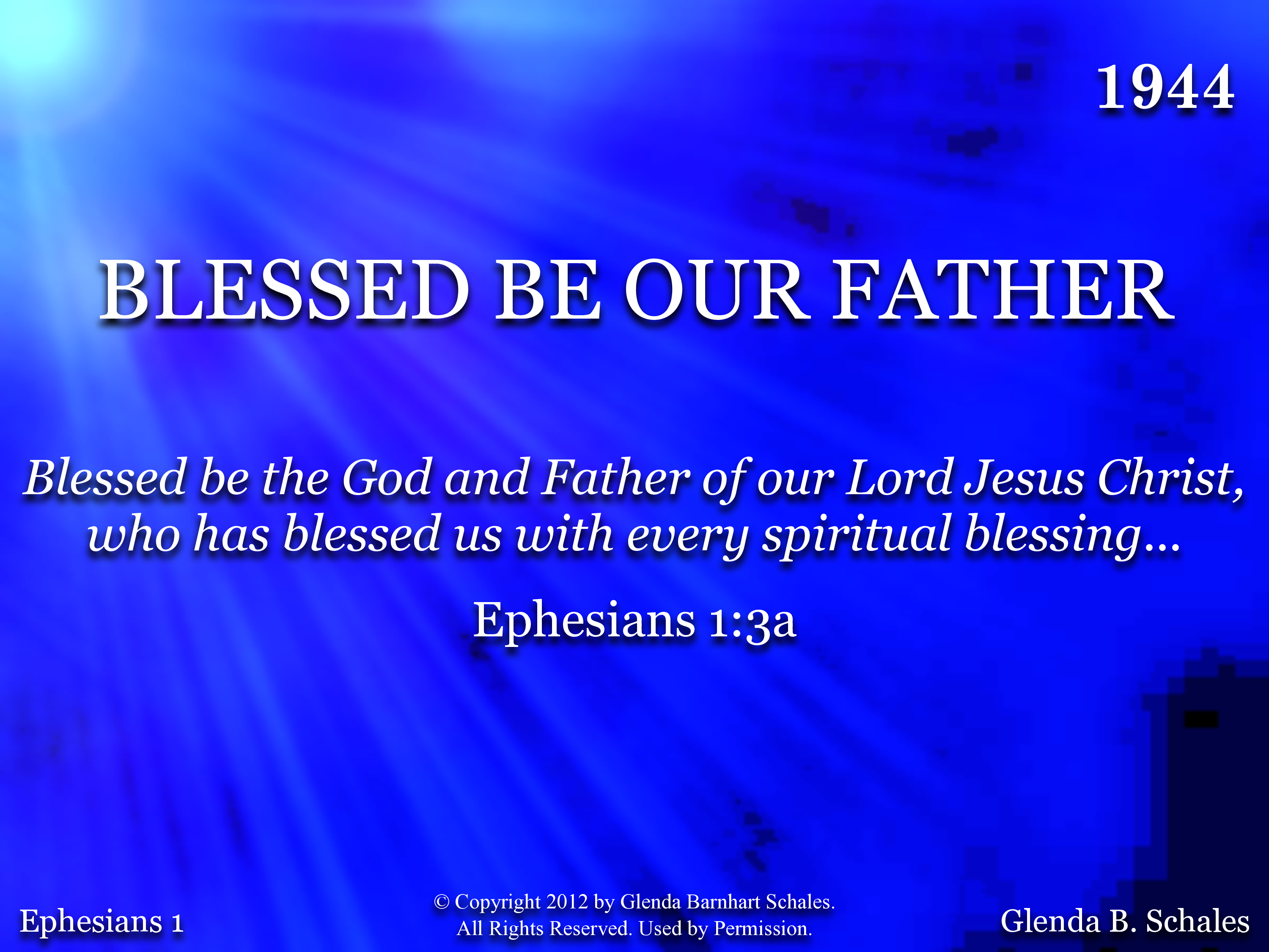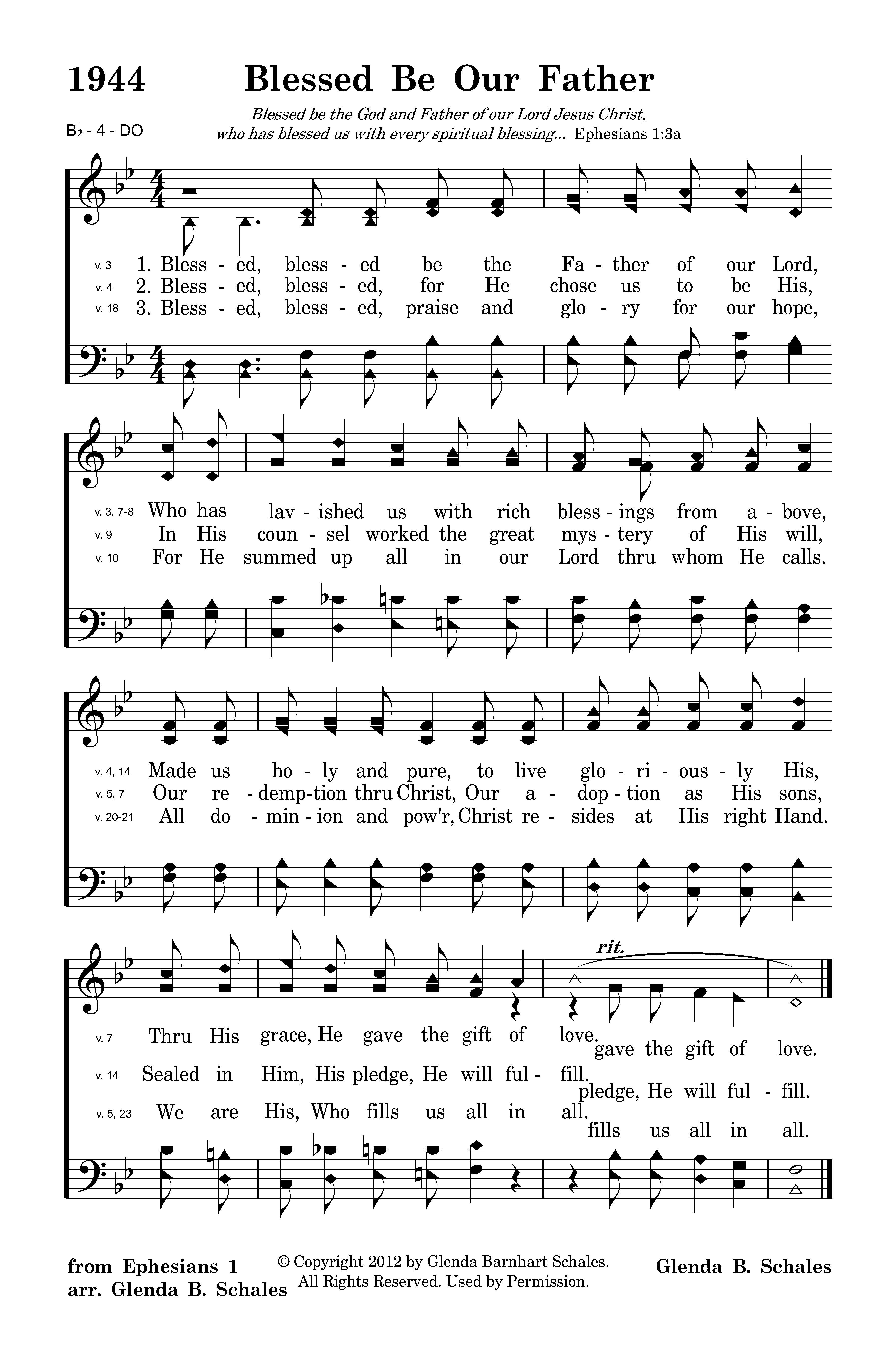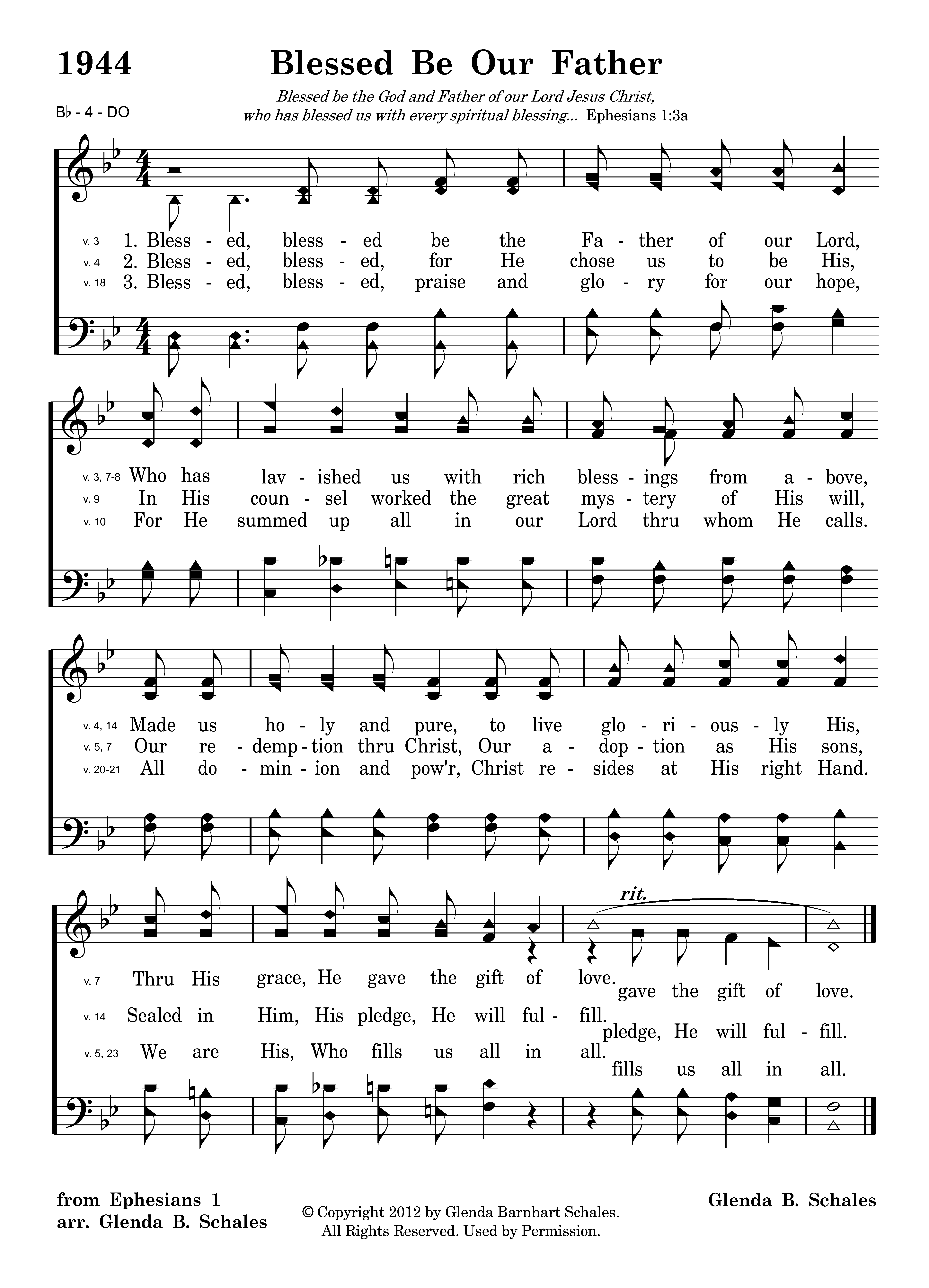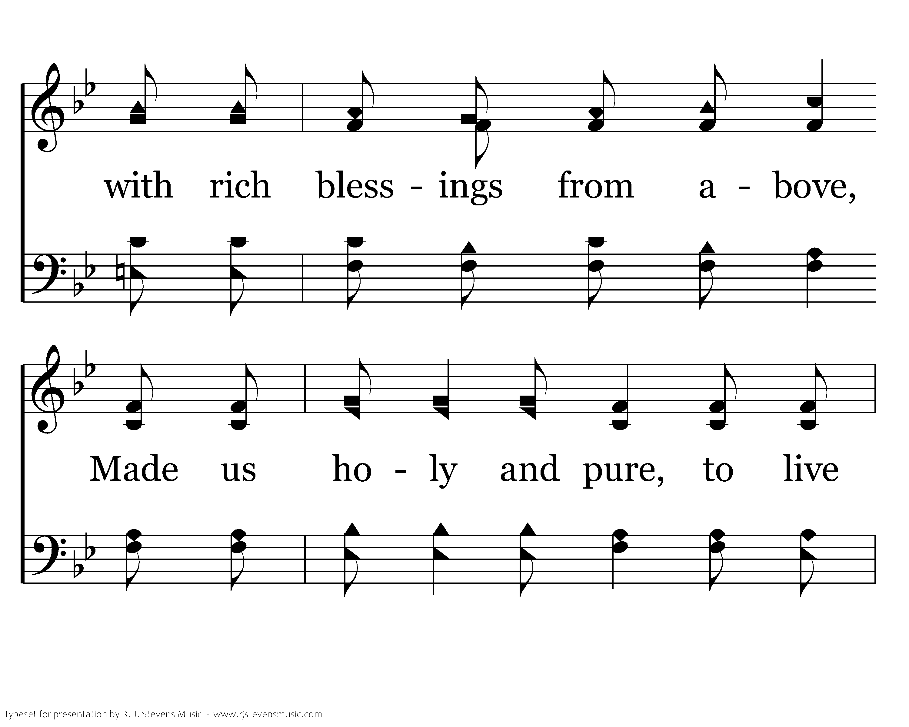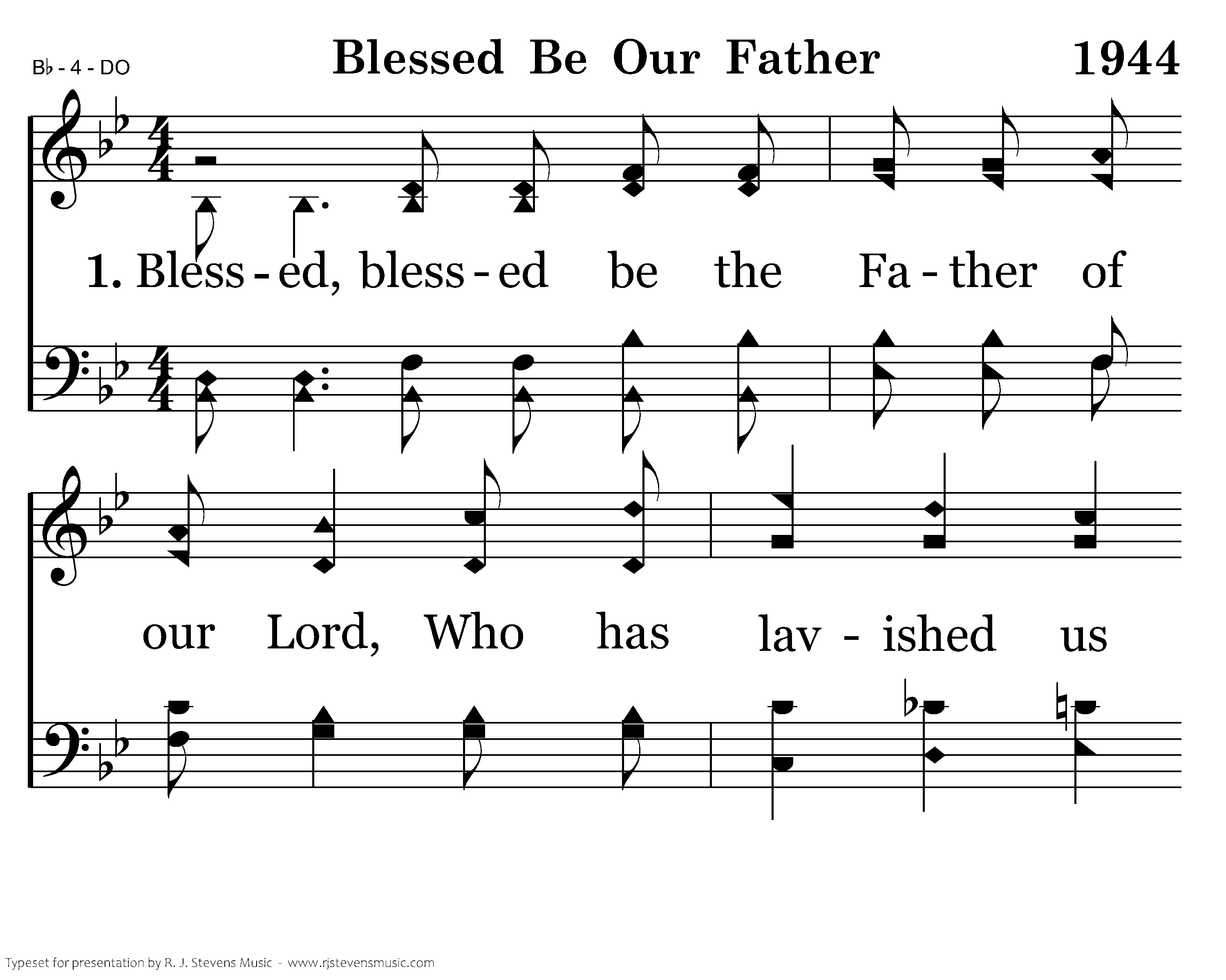 Blessed, blessed be the Father of our Lord, Who has lavished us with rich blessings from above, Made us holy and pure, to live gloriously His, Thru His grace, He gave the gift of love. (gave the gift of love.)