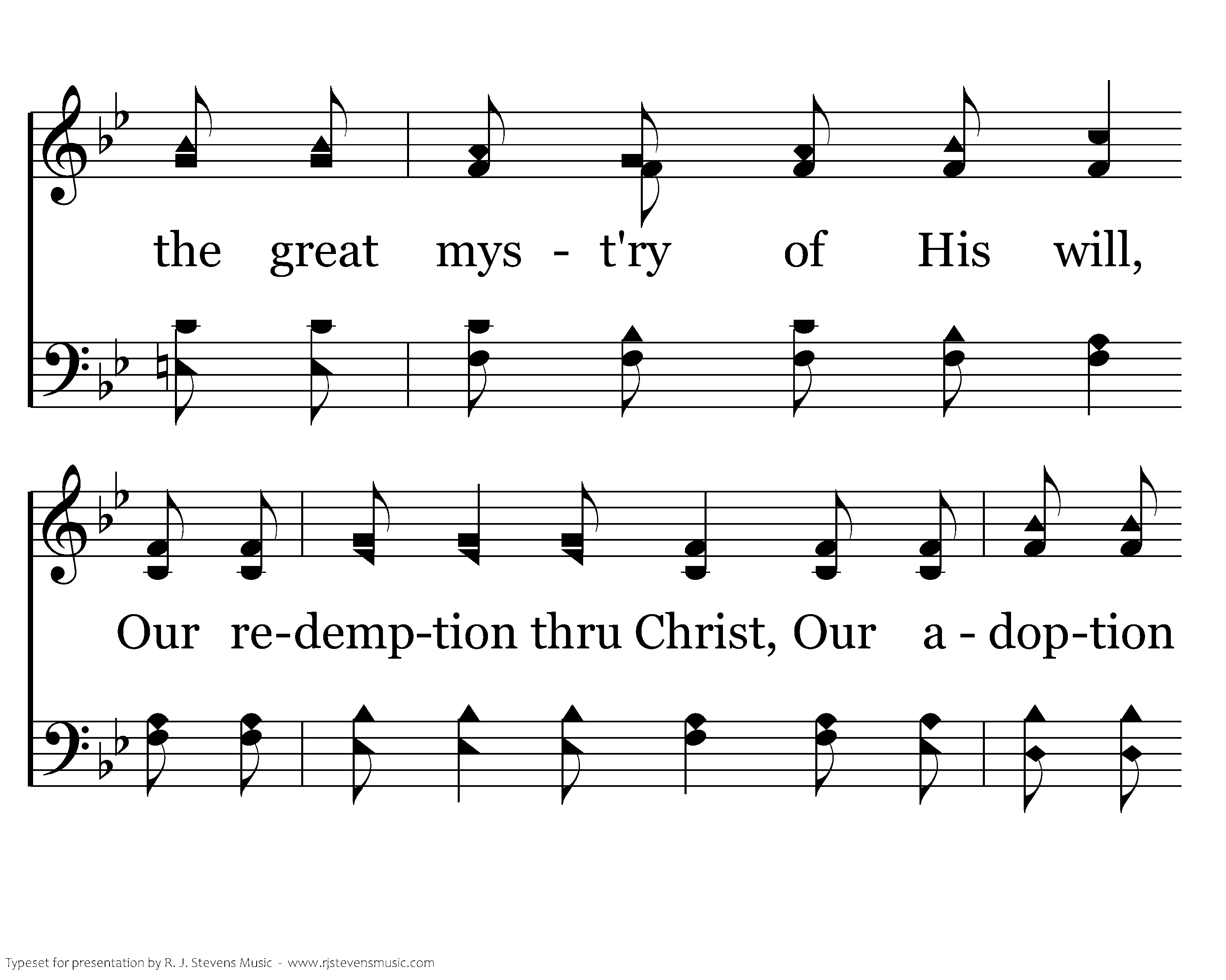 Blessed, blessed, for He chose us to be His, In His counsel worked the great mystery of His will, Our redemption thru Christ, Our adoption as His sons, Sealed in Him, His pledge, He will fulfill. (pledge, He will fulfill.)