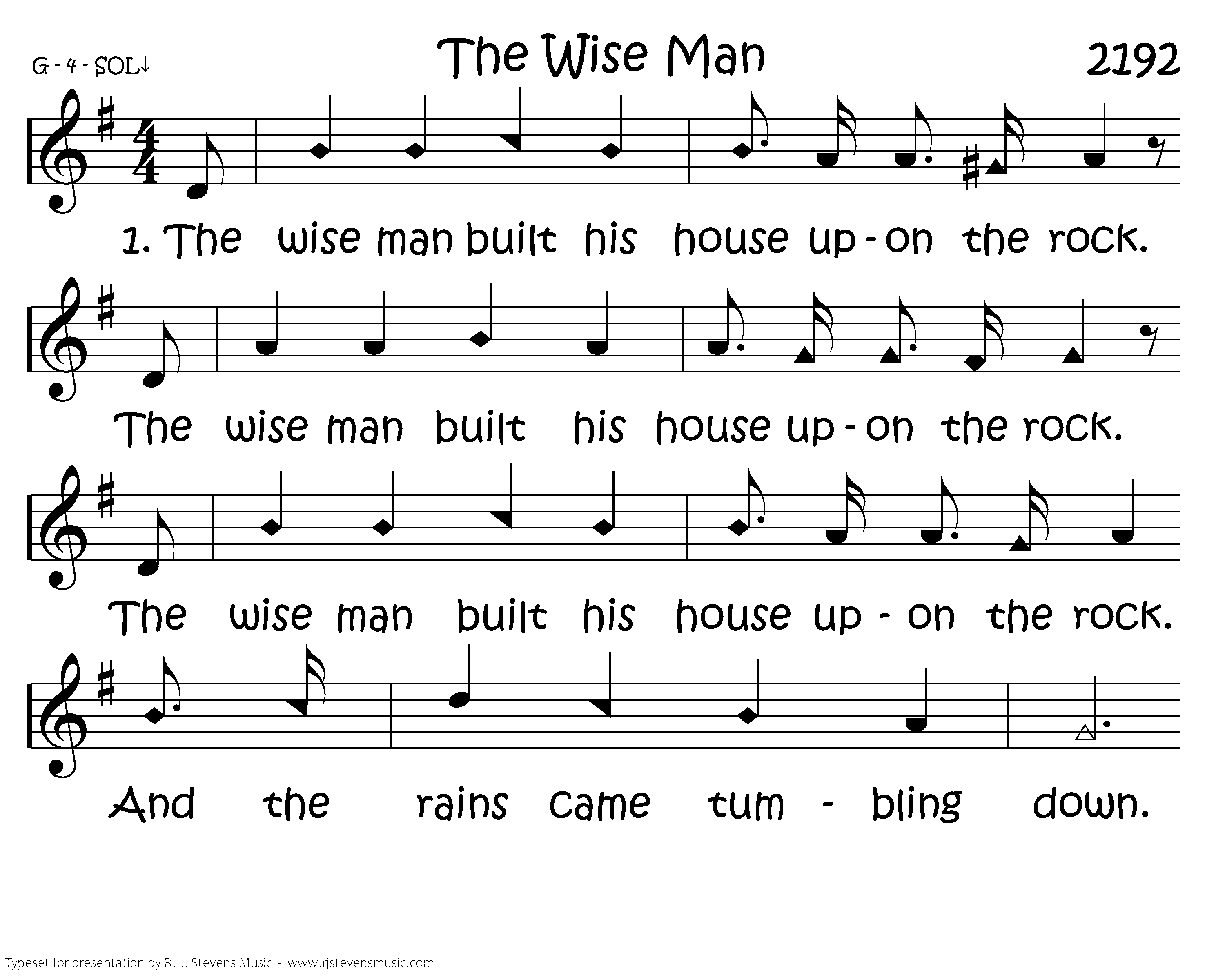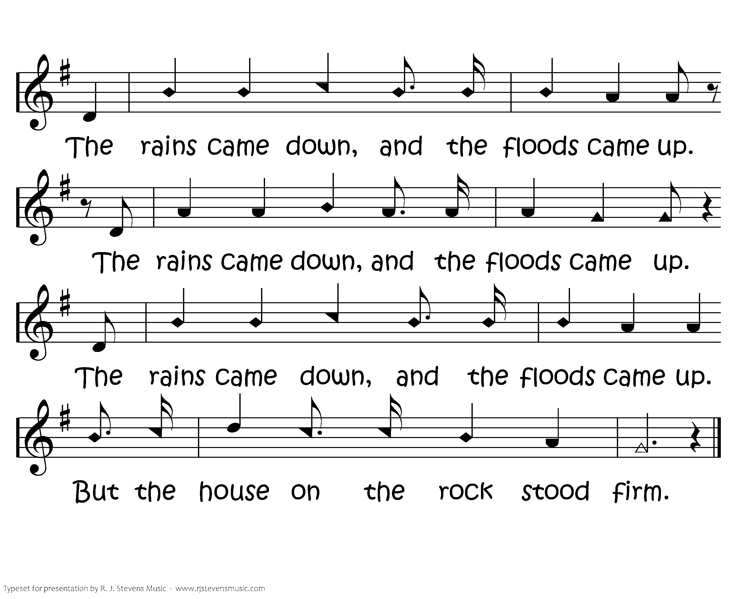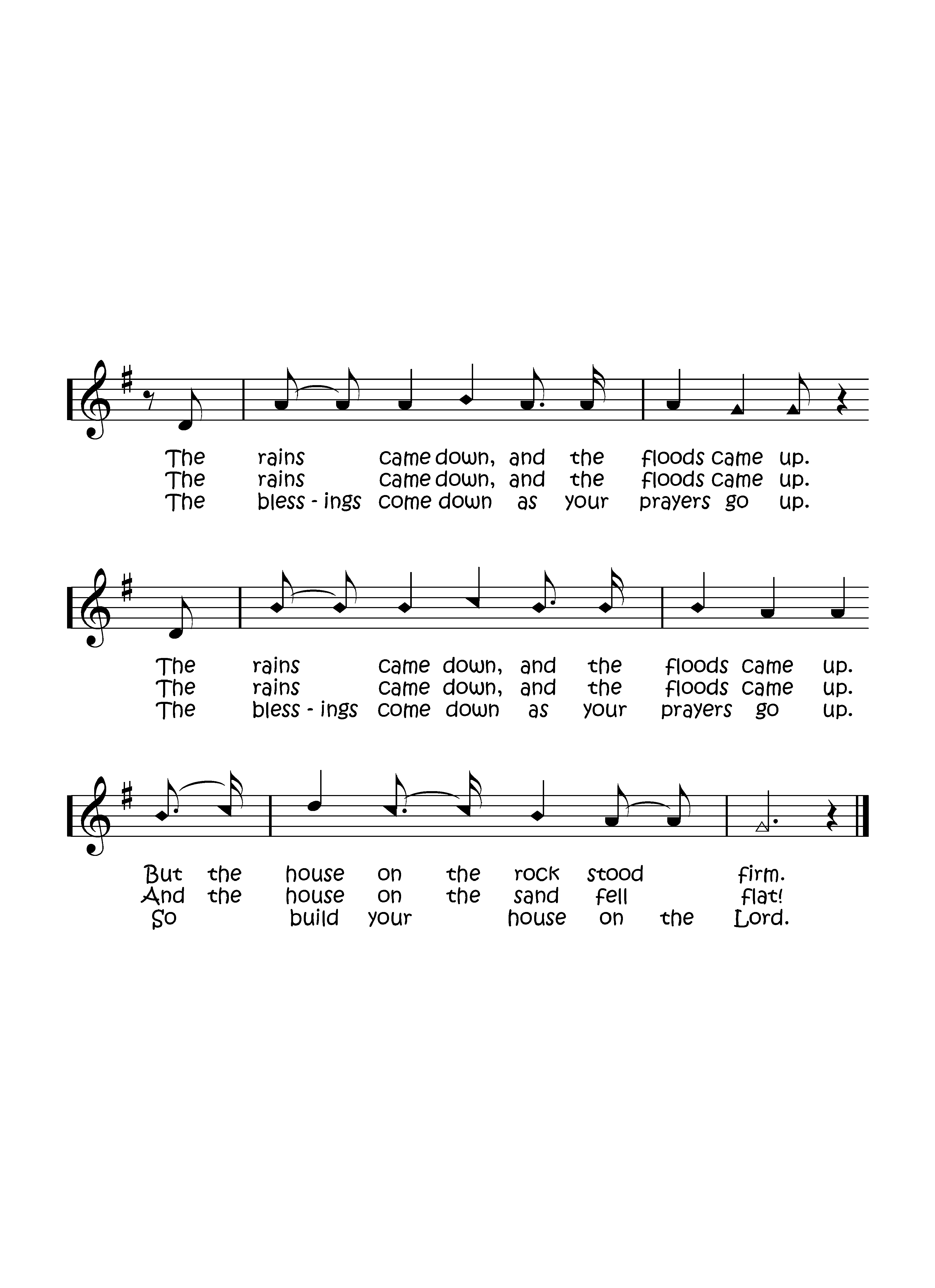 The wise man built his house upon the rock. The wise man built his house upon the rock. The wise man built his house upon the rock. And the rains came tumbling down. The rains came down, and the floods came up. The rains came down, and the floods came up. The rains came down, and the floods came up. And the house on the rock stood firm.