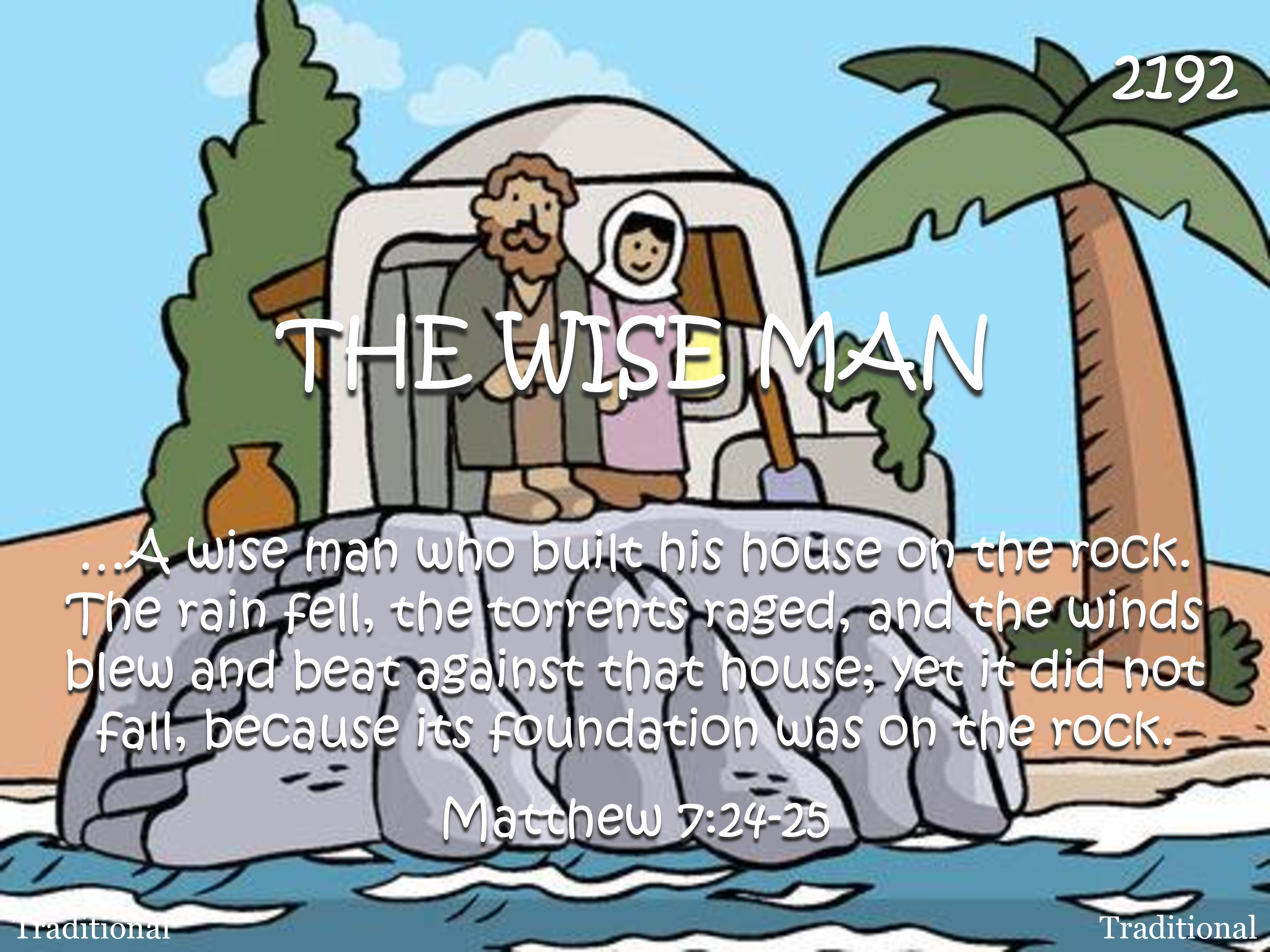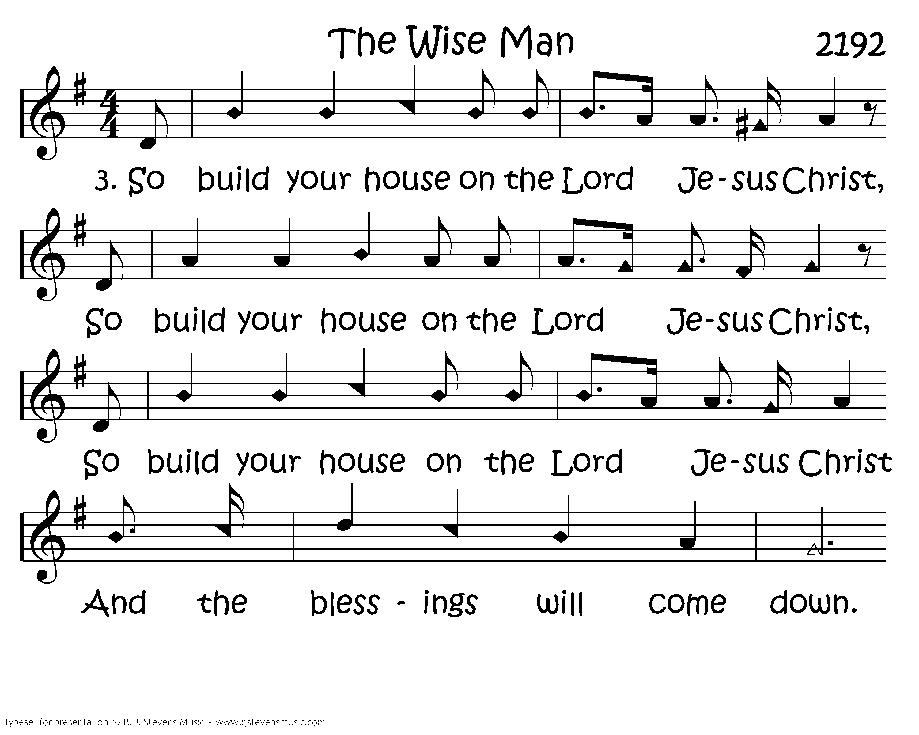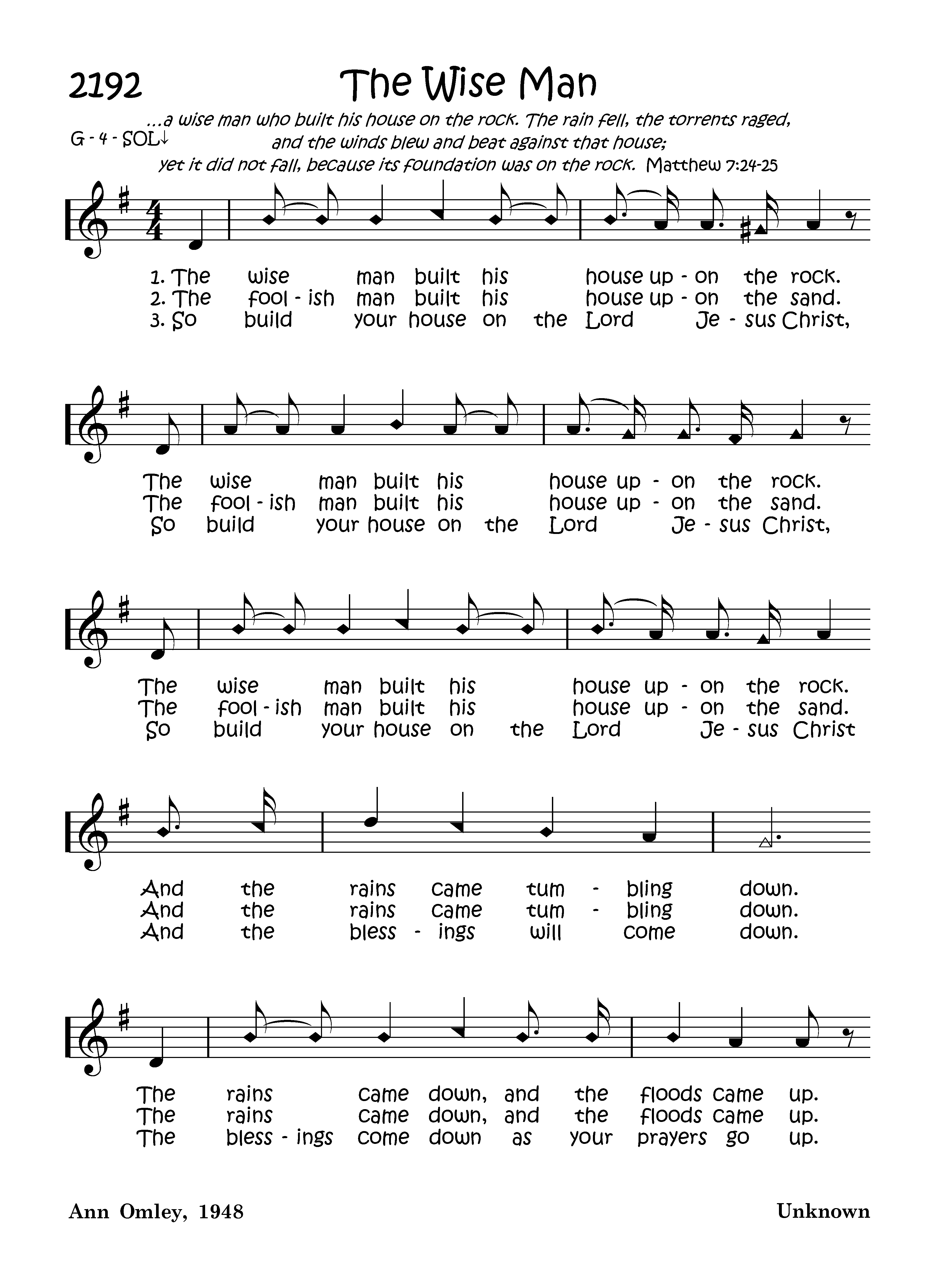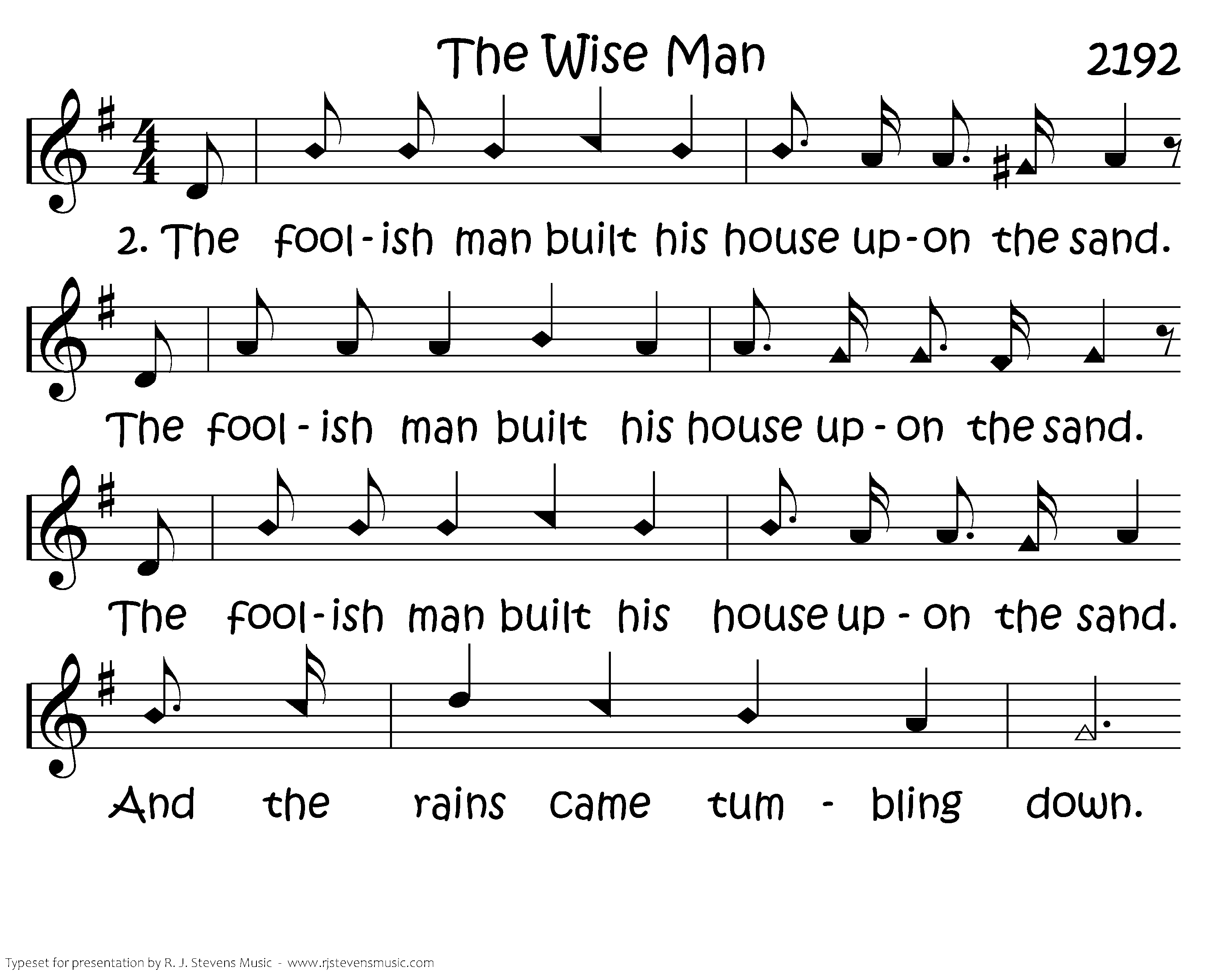 The wise man built his house upon the rock. The wise man built his house upon the rock. The wise man built his house upon the rock. And the rains came tumbling down. The rains came down, and the floods came up. The rains came down, and the floods came up. The rains came down, and the floods came up. And the house on the rock stood firm.