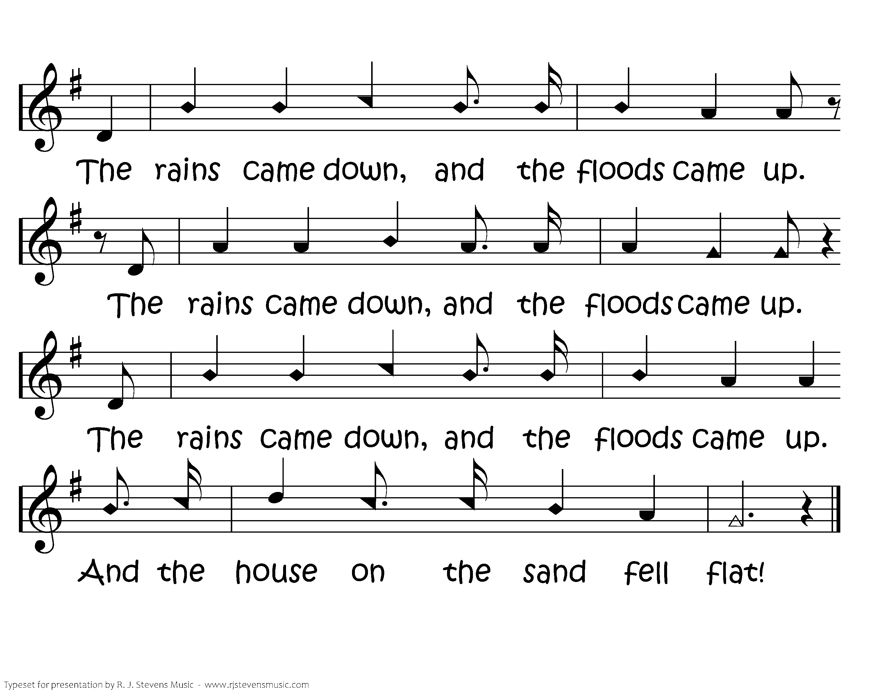 The foolish man built his house upon the sand. And the rains came tumbling down. The rains came down, and the floods came up. The rains came down, and the floods came up. The rains came down, and the floods came up. And the house on the sand fell flat!