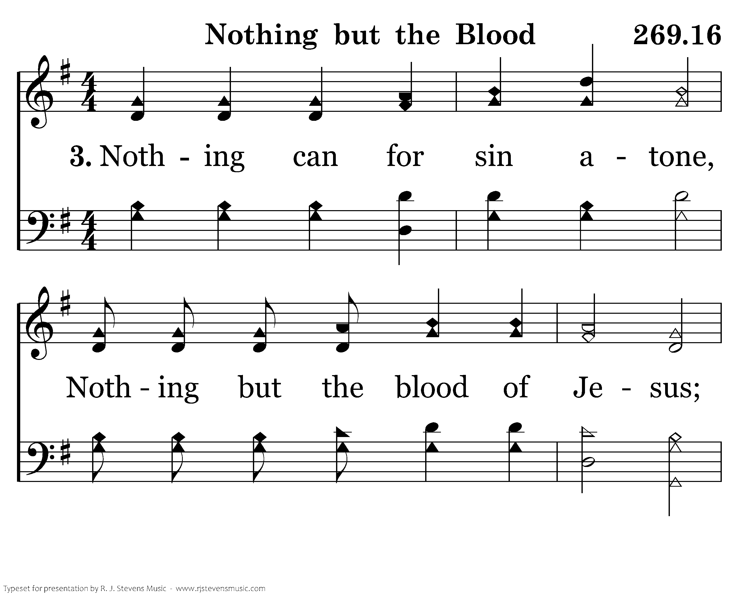 Nothing can for sin atone, Nothing but the blood of Jesus; Naught of good that I have done, Nothing but the blood of Jesus.