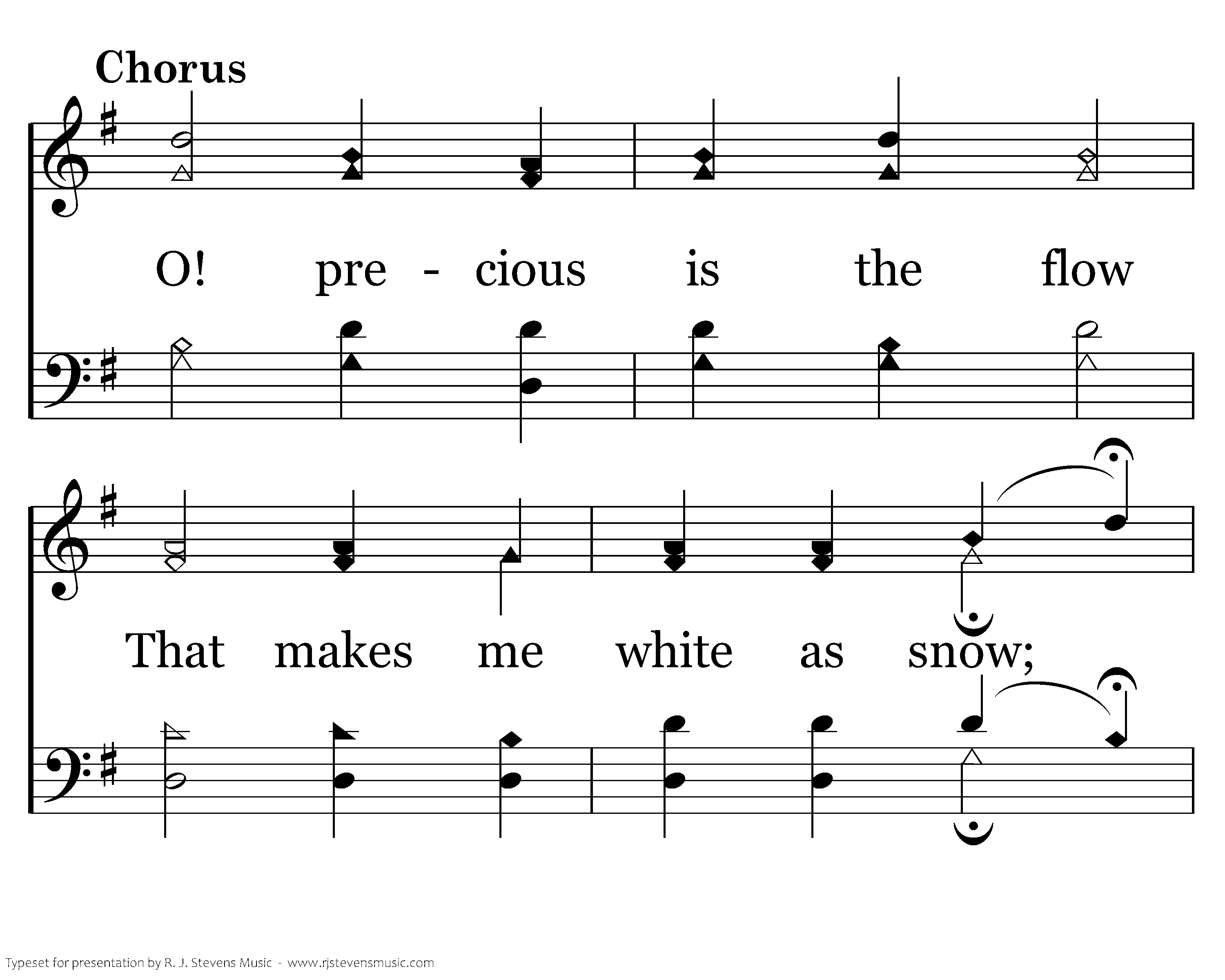 O! precious is the flow That makes me white as snow; No other fount I know, Nothing but the blood of Jesus.