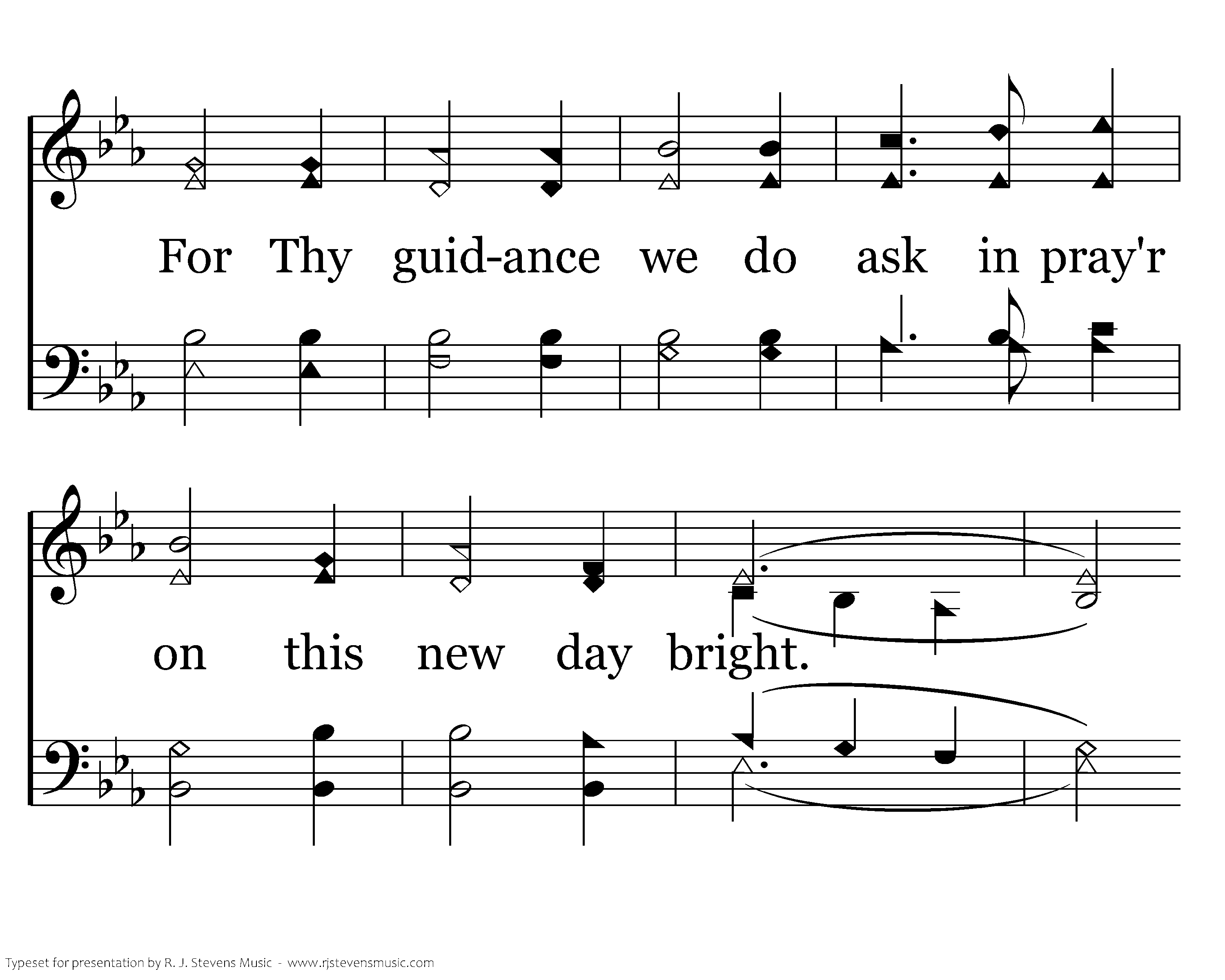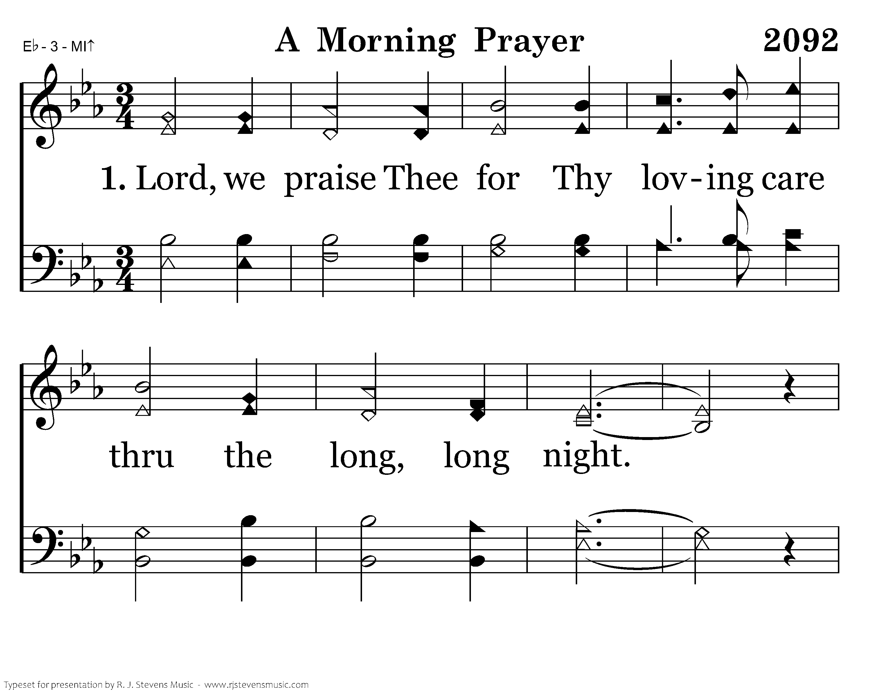 Lord, we praise Thee for Thy loving care thru the long, long night. For Thy guidance we do ask in pray'r on this new day bright. And Lord, forgive our sins. Always closer to Thy love each day. Thru Thy Son we pray.