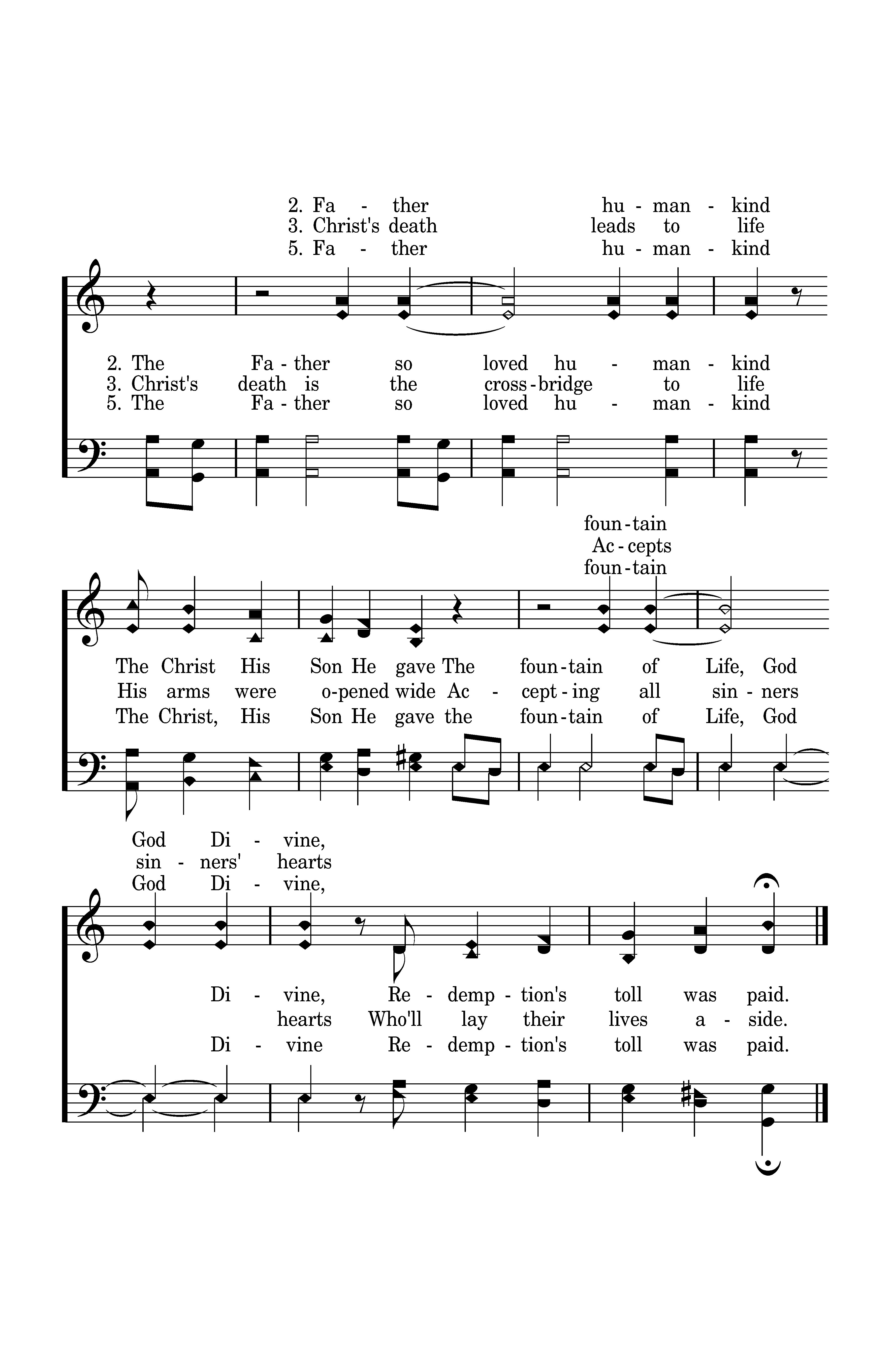 The Father so loved humankind The Christ, His Son He gave the fountain of Life, God Divine Redemption's toll was paid. Father humankind fountain God Divine,