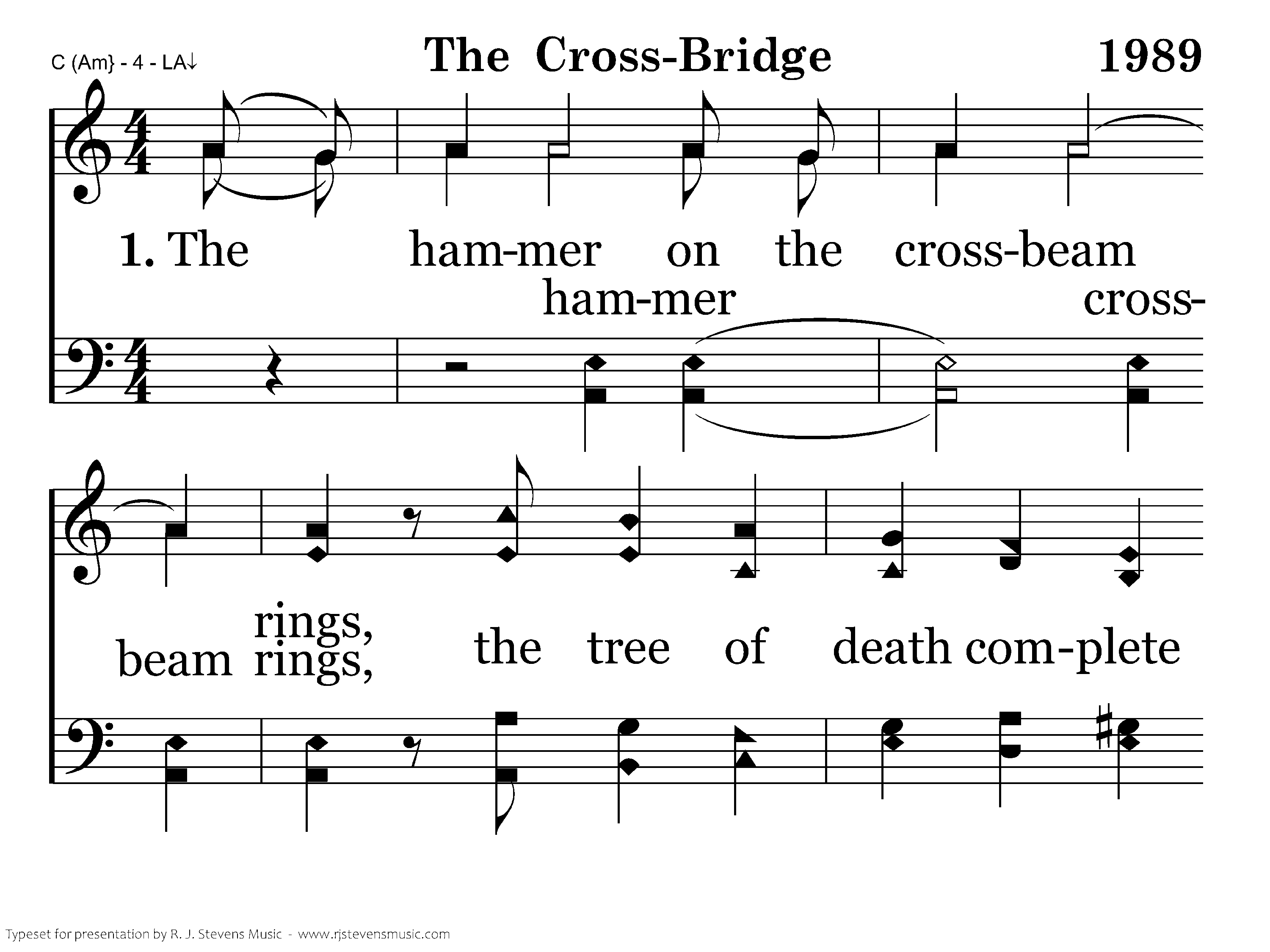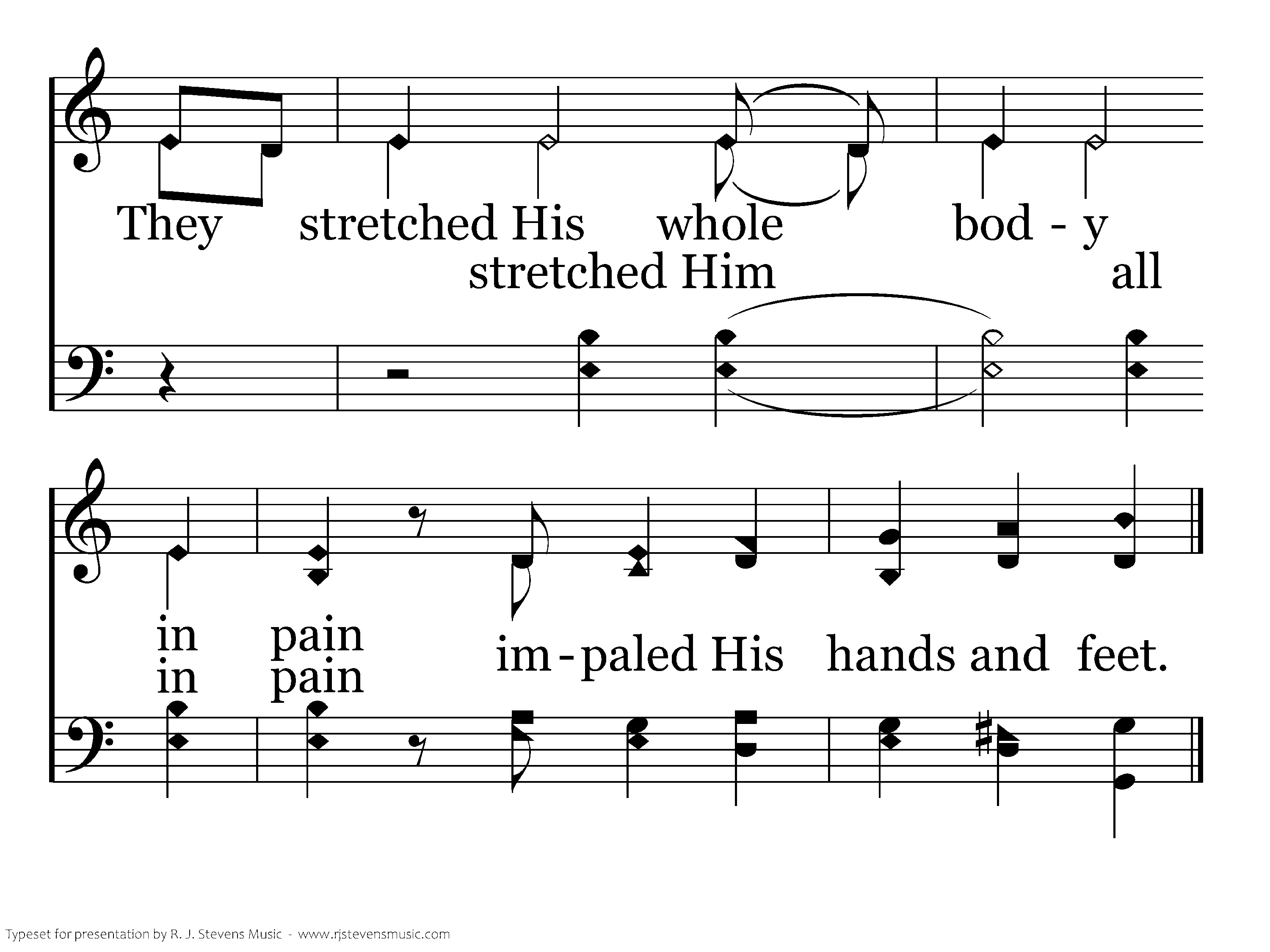 The hammer on the crossbeam rings, the tree of death complete They stretched His whole body in pain impaled His hands and feet.