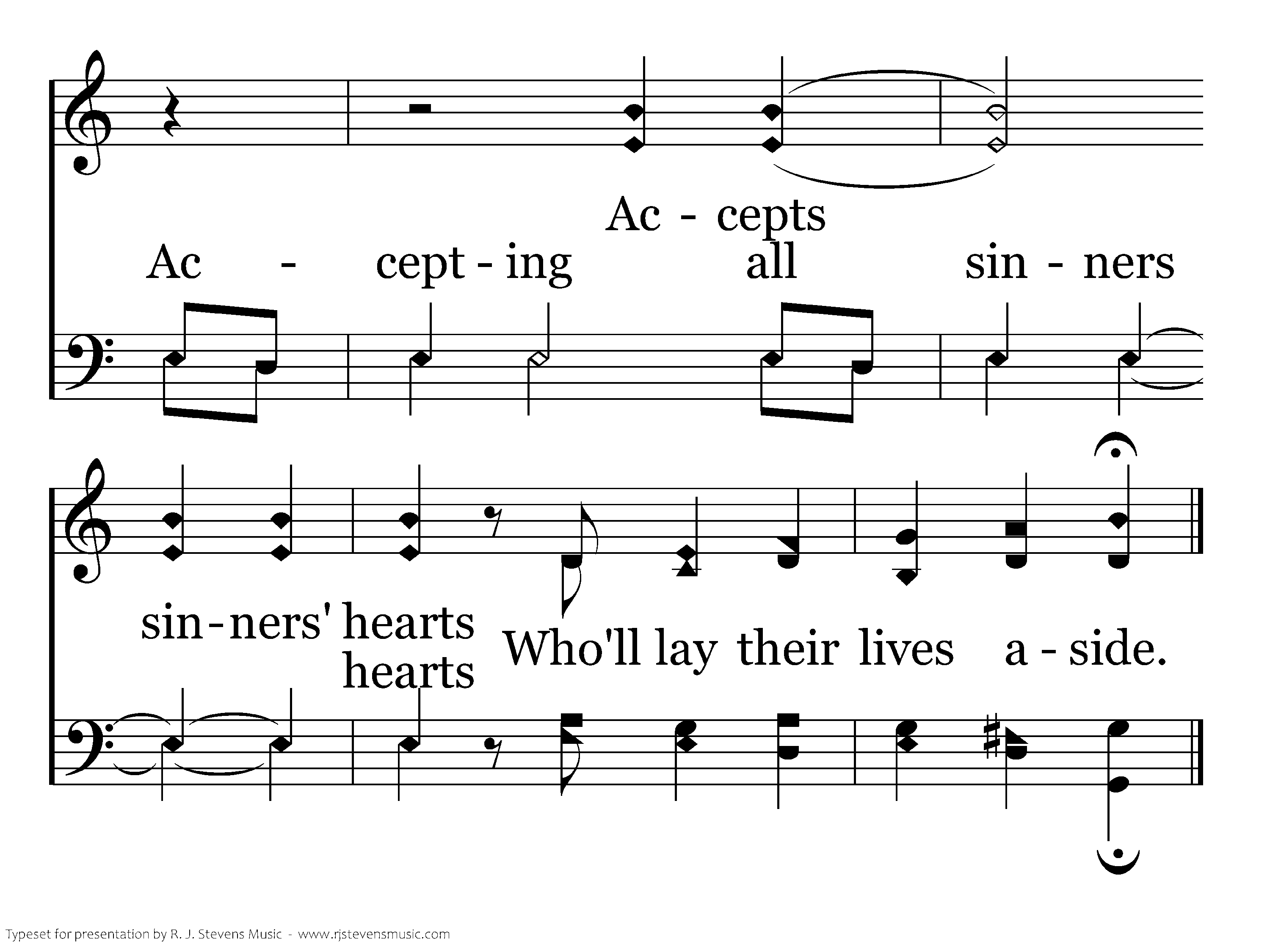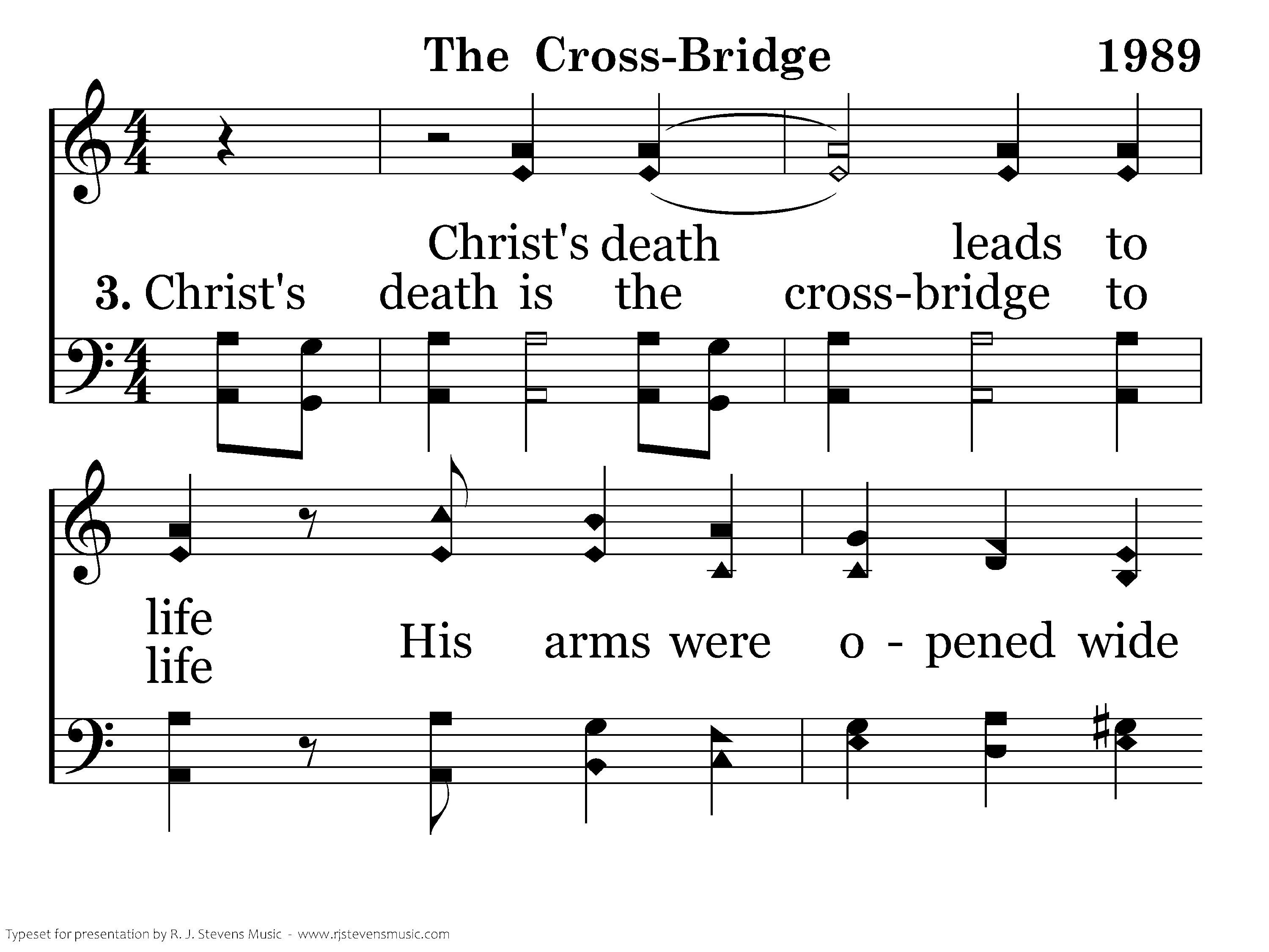 Christ's death is the crossbridge to life His arms were opened wide Accepting all sinners hearts Who'll lay their lives aside.