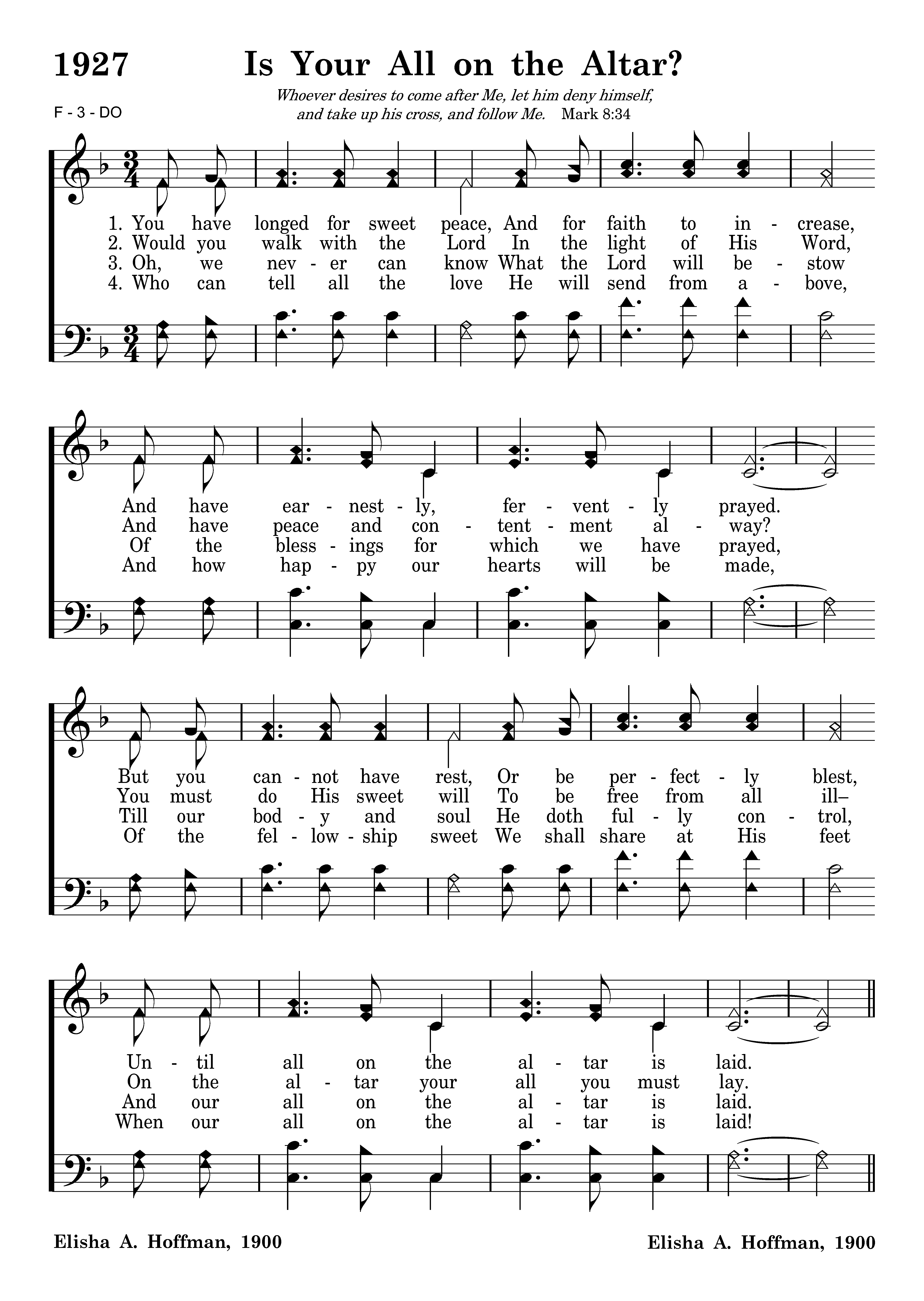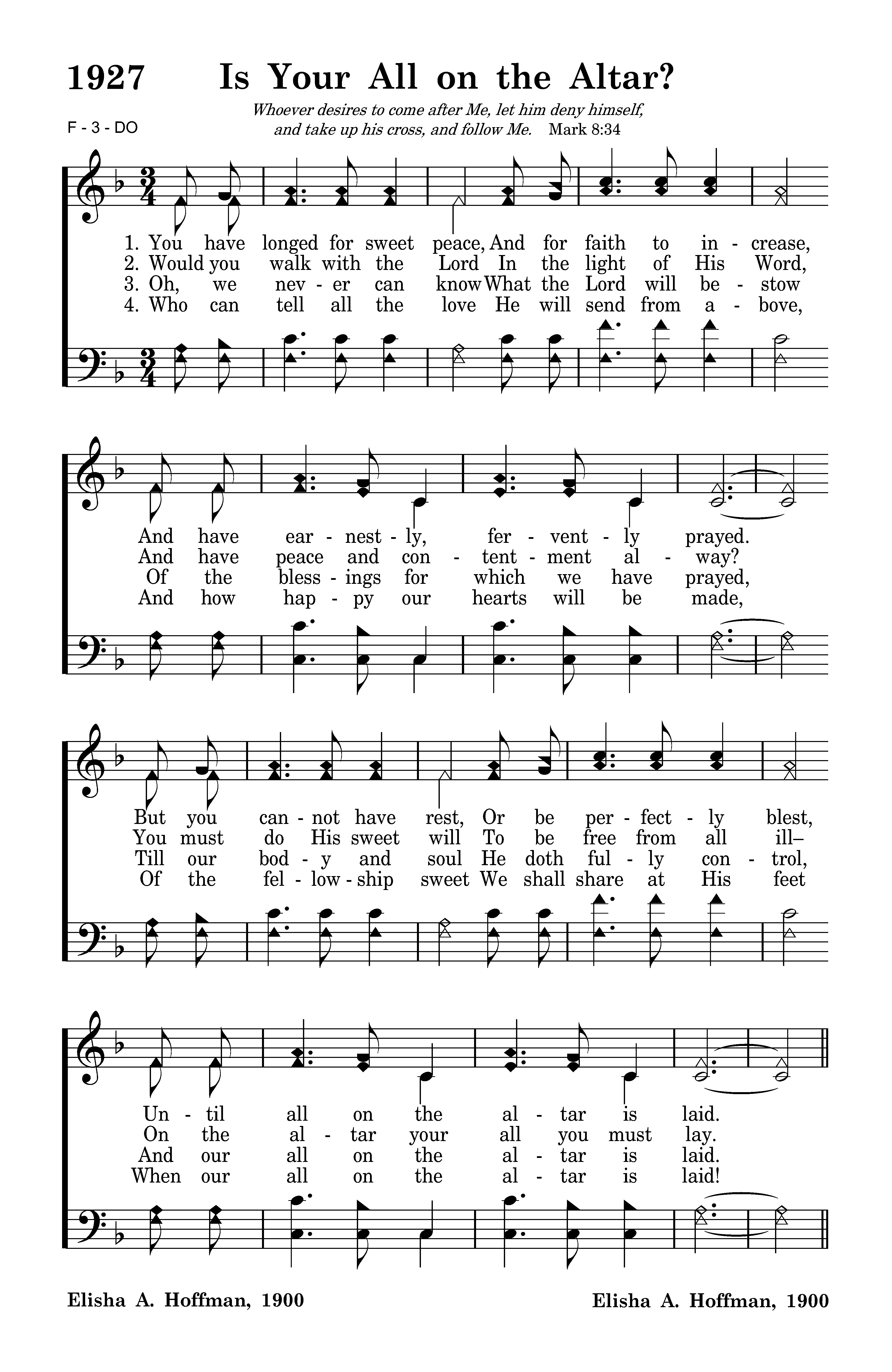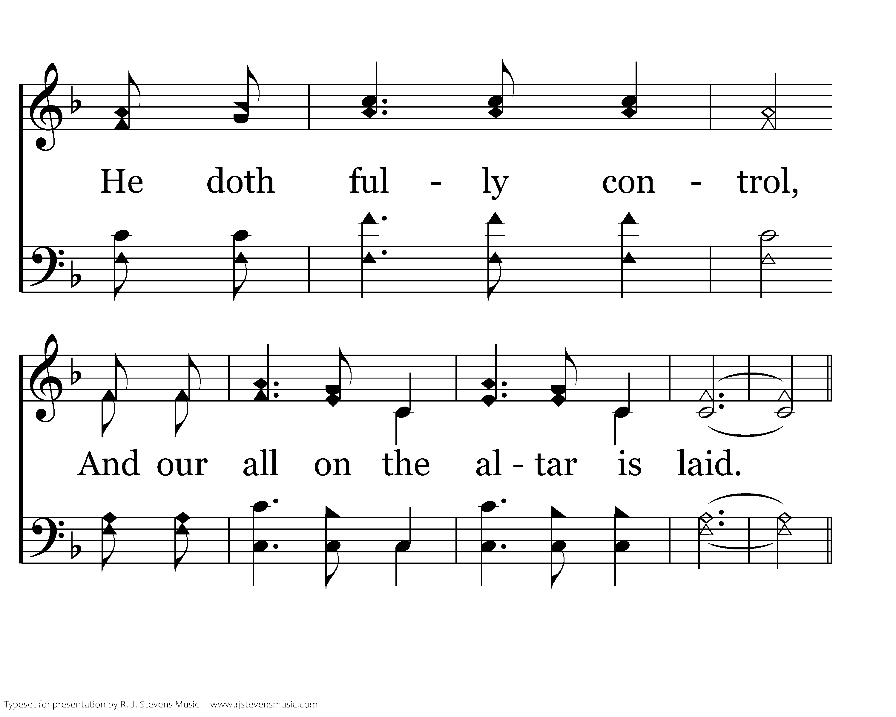 You have longed for sweet peace, And for faith to increase, And have earnestly, fervently prayed. But you cannot have rest, Or be perfectly blest, Until all on the altar is laid.