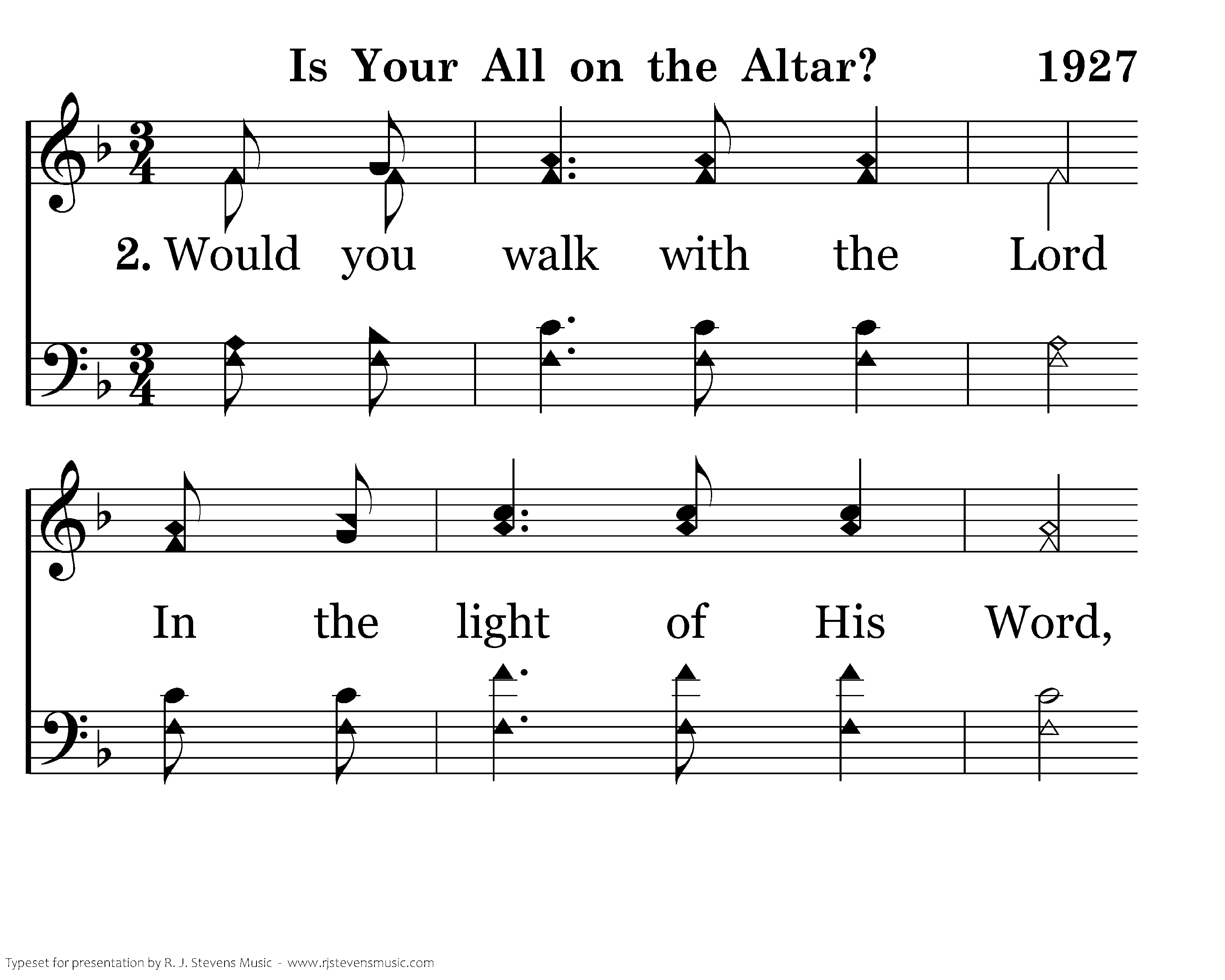 Would you walk with the Lord In the light of His Word, And have peace and contentment alway? You must do His sweet will To be free from all ill On the altar your all you must lay.