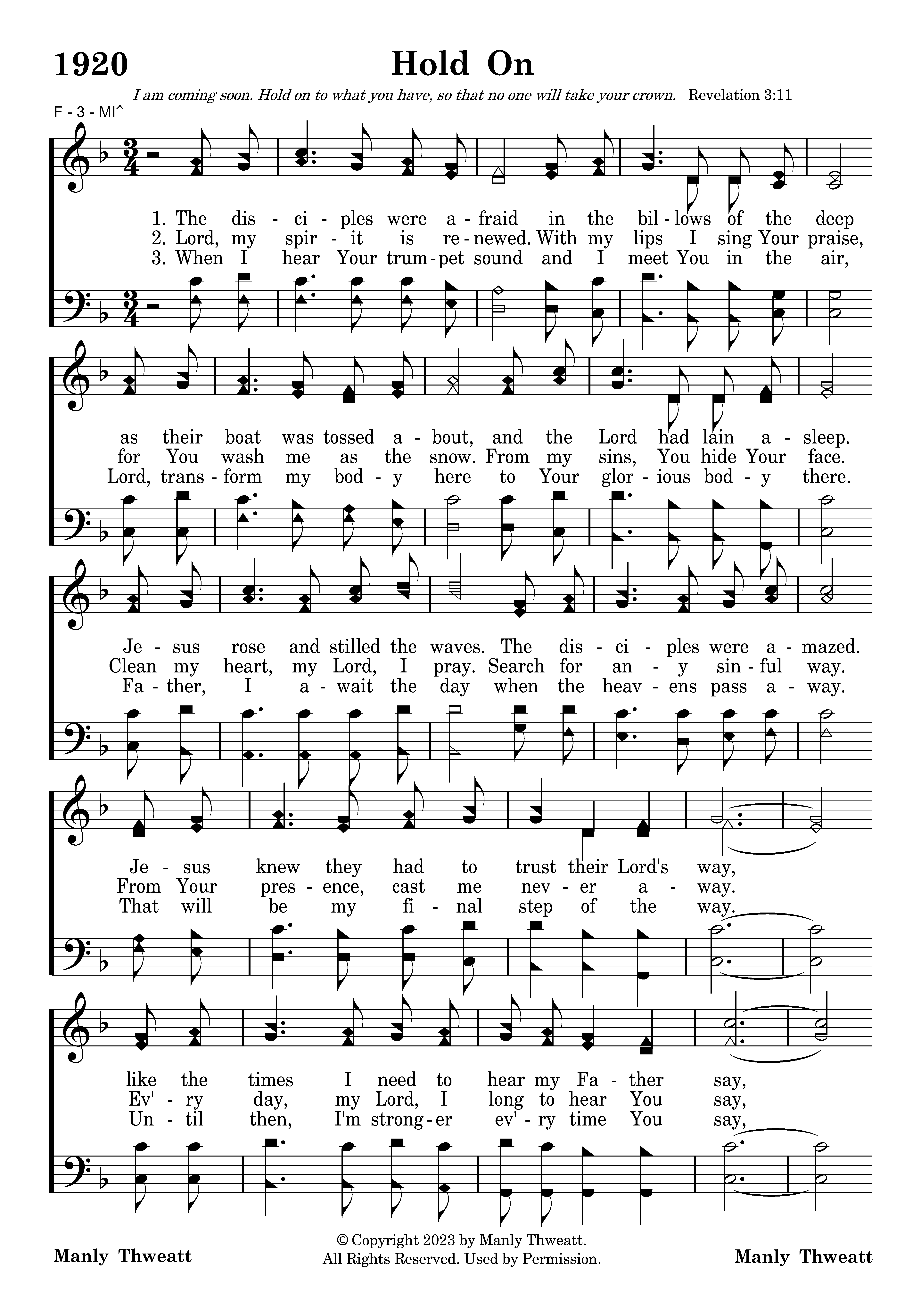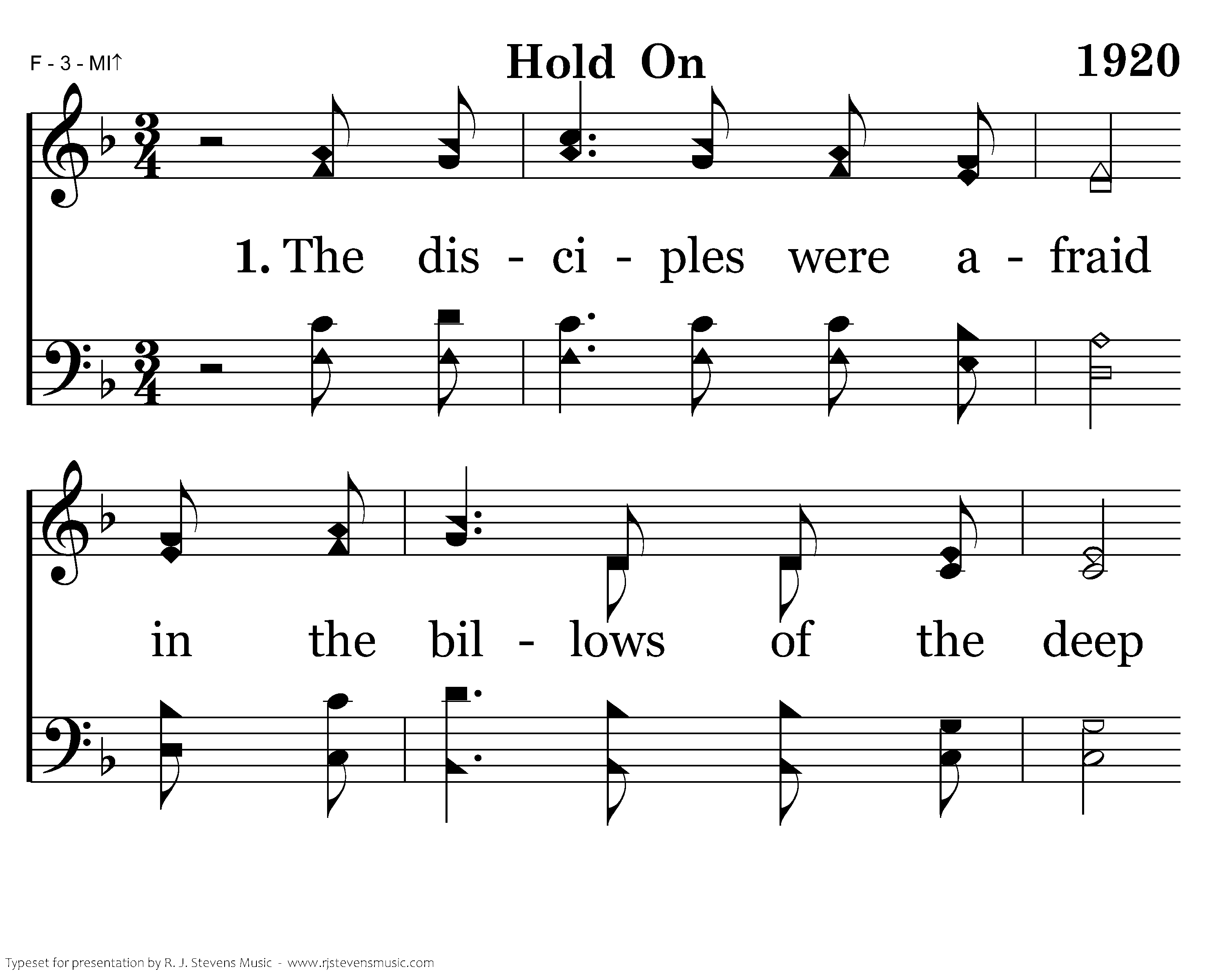 The disciples were afraid in the billows of the deep as their boat was tossed about, and the Lord had lain asleep. Jesus rose and stilled the waves. The disciples were amazed. Jesus knew they had to trust their Lord's way, like the times I need to hear my Father say, "Hold on, Hold on."
