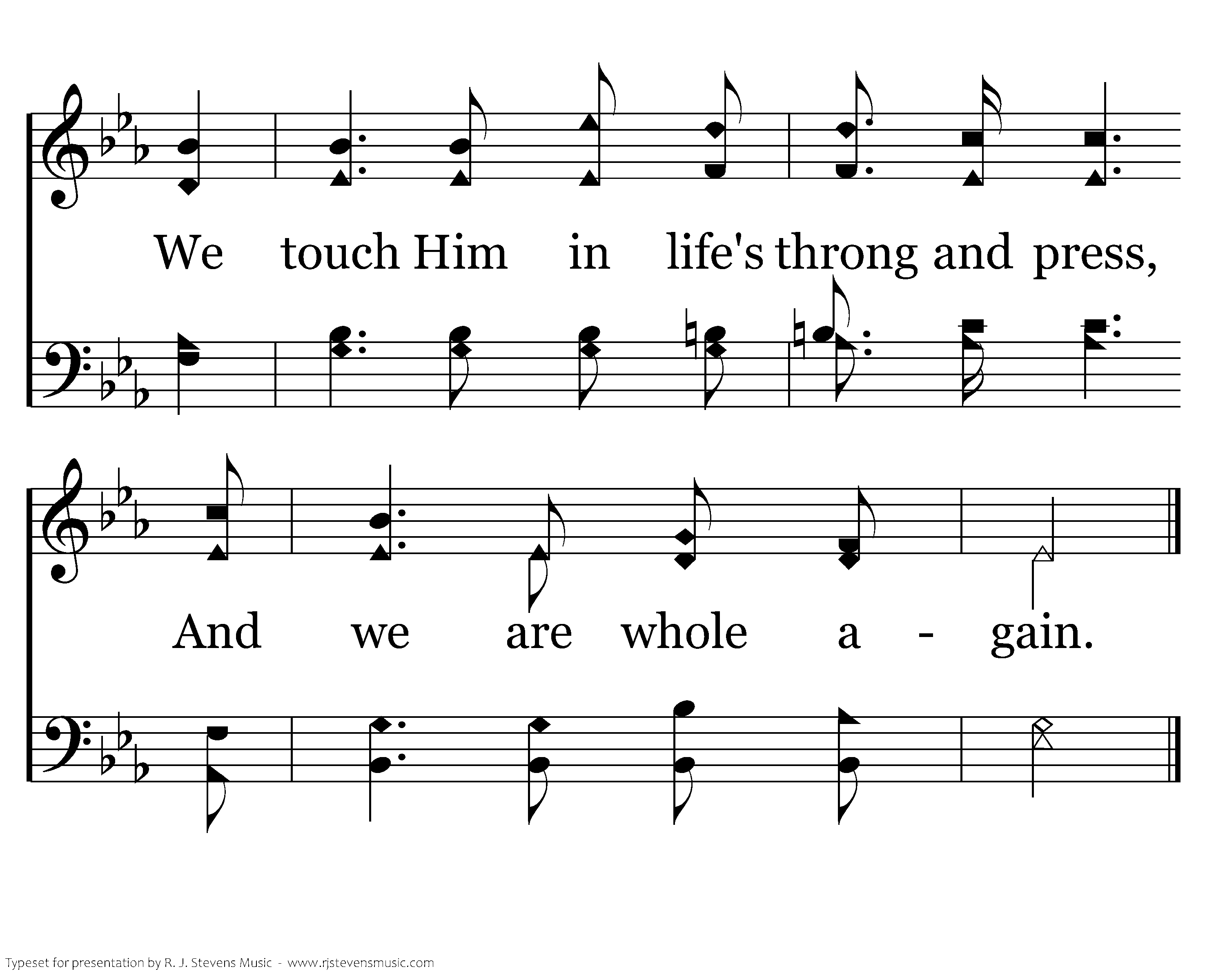The healing of His seamless dress Is by our beds of pain: We touch Him in life's throng and press, And we are whole again.