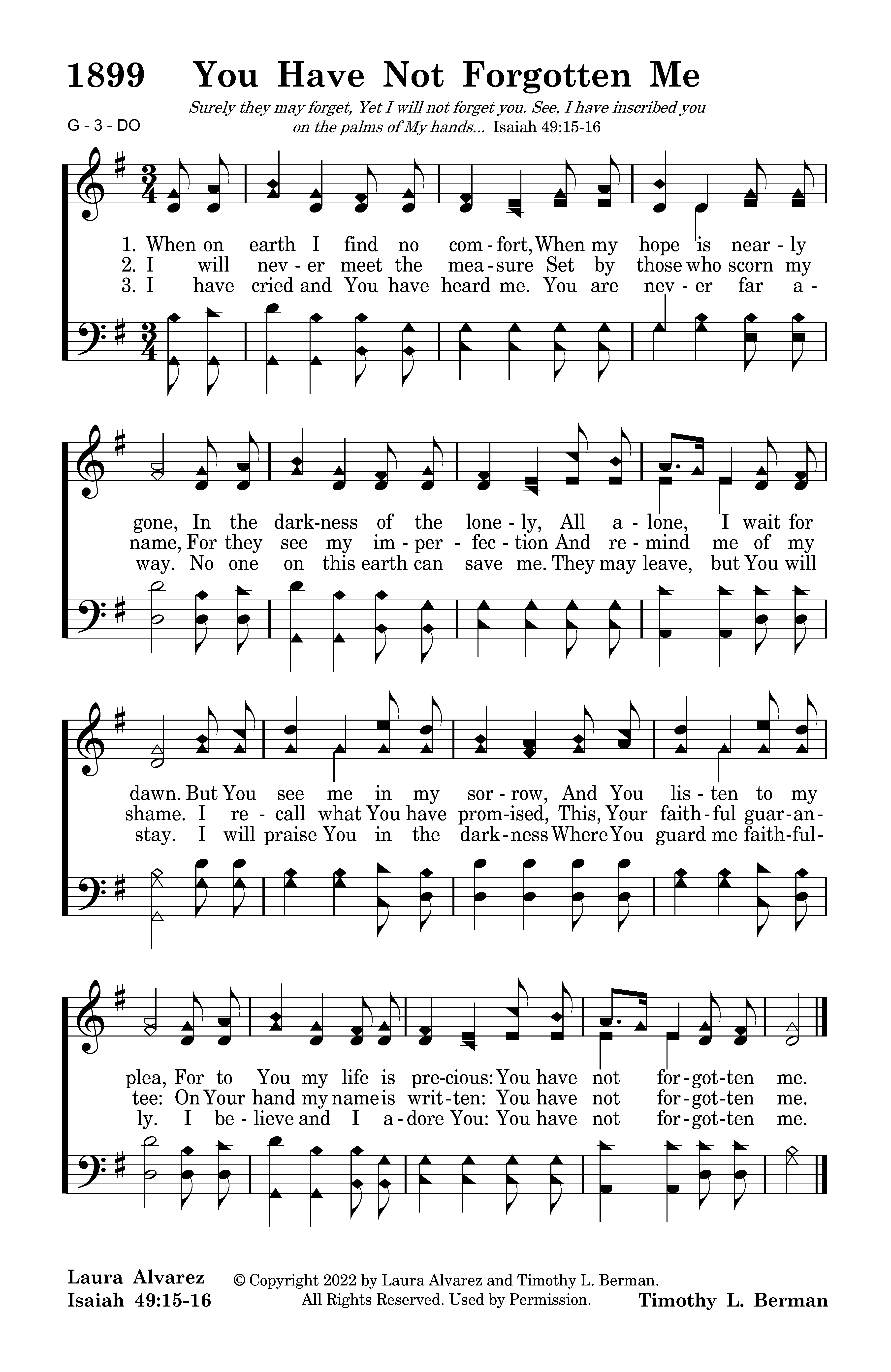 When on earth I find no comfort, When my hope is nearly gone, In the darkness of the lonely, All alone, I wait for dawn. But You see me in my sorrow, And You listen to my plea, For to You my life is precious: You have not forgotten me.
