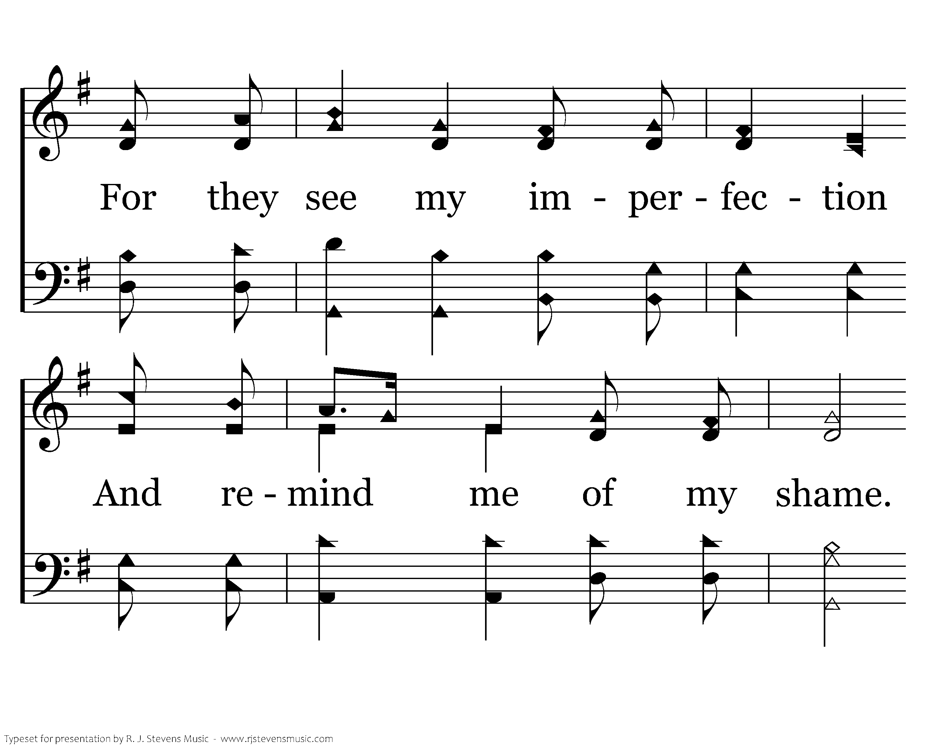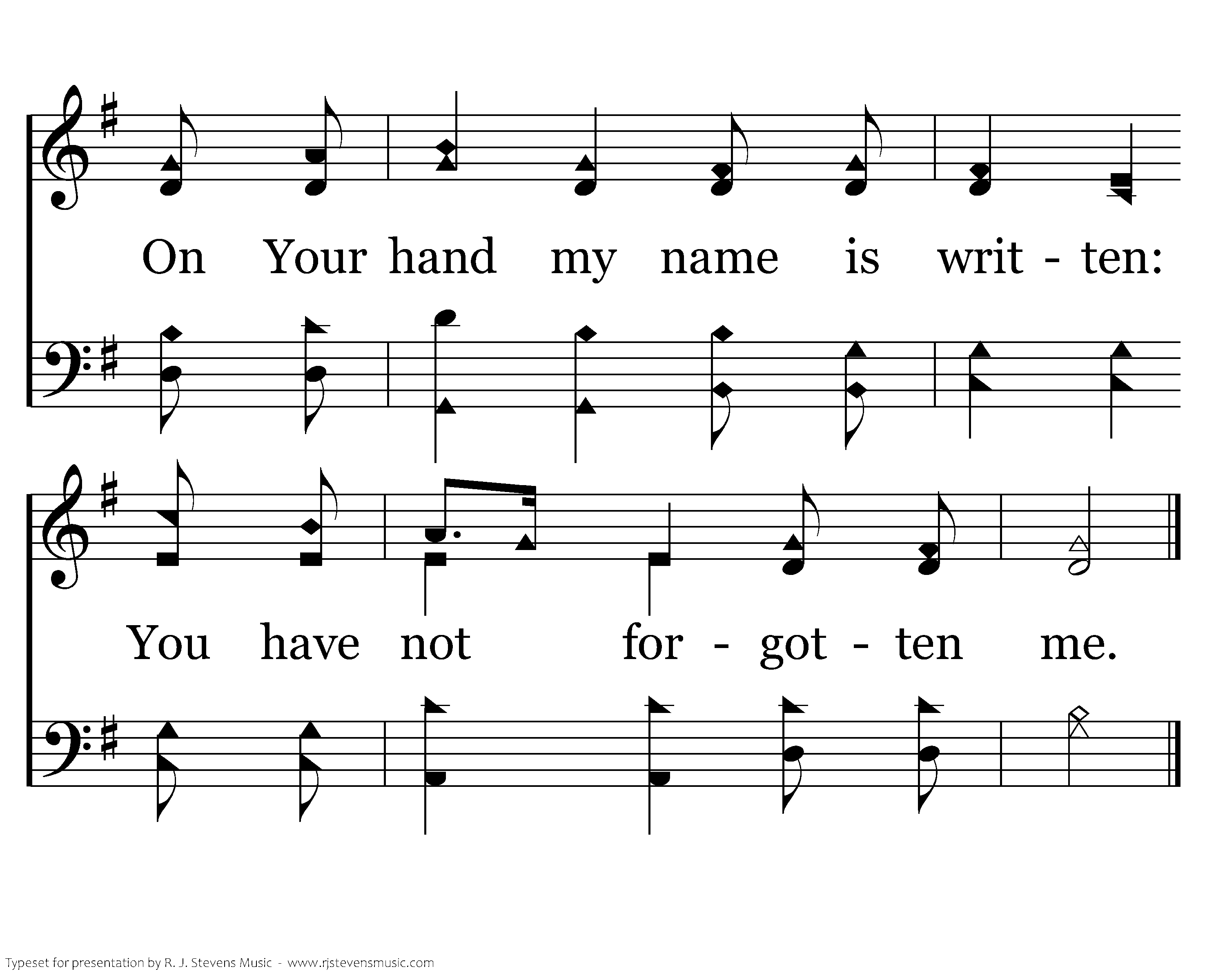 I will never meet the measure Set by those who scorn my name, For they see my imperfection And remind me of my shame. I recall what You have promised, This, Your faithful guarantee: On Your hand my name is written: You have not forgotten me.